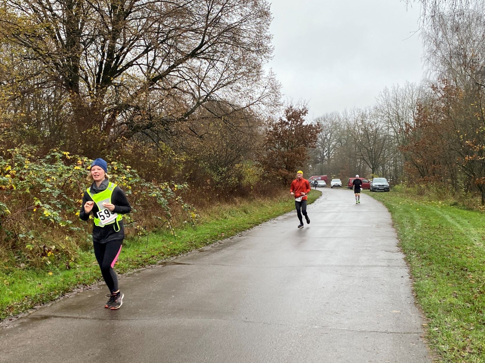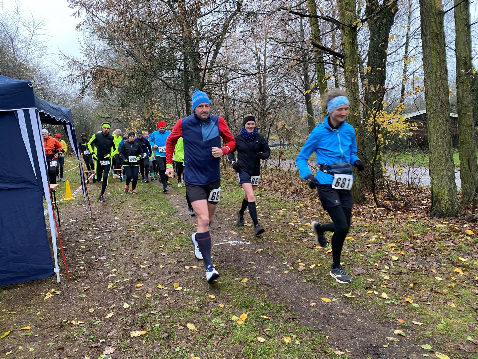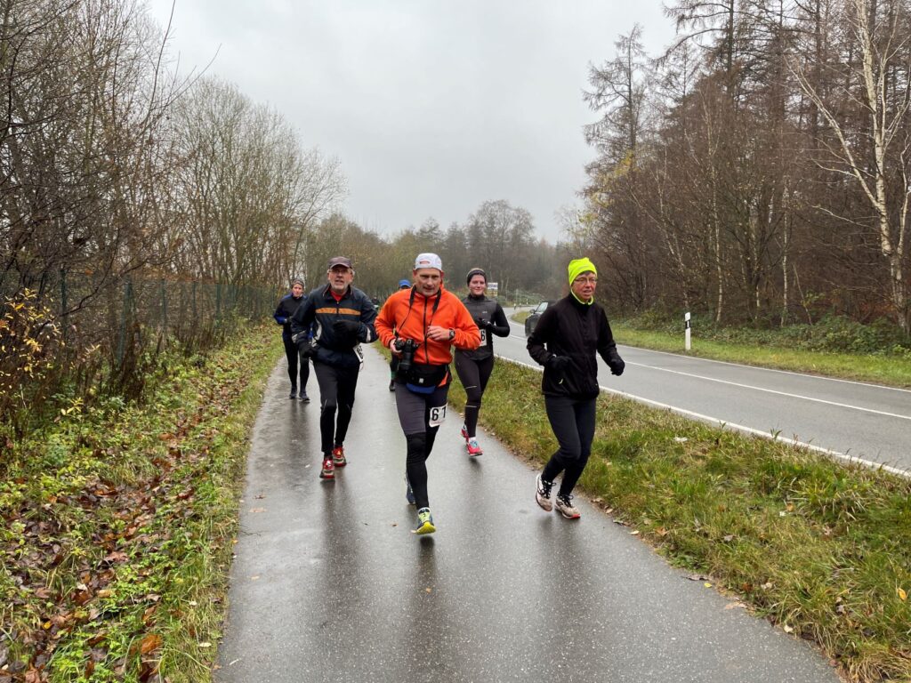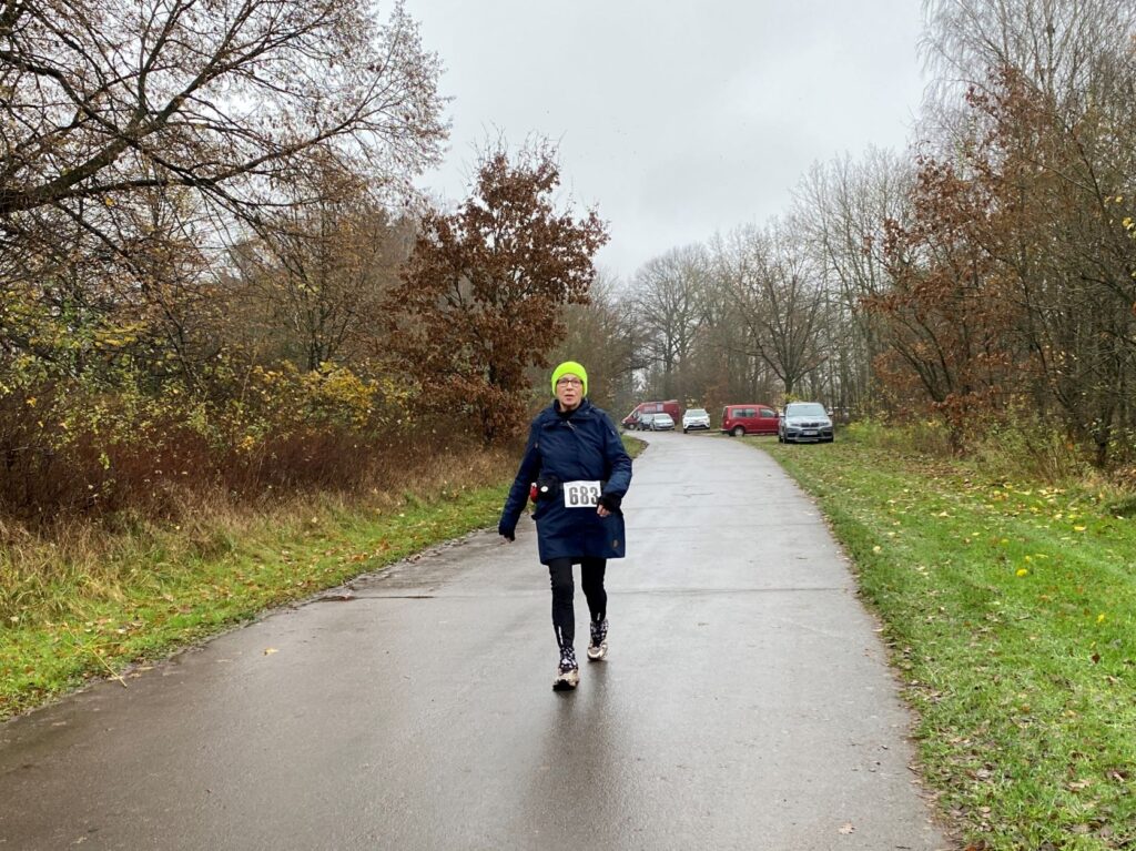 … Didi, Rolf (im Hintergrund), Dieter und Rita. Das nasskalte Wetter motivierte tatsächlich dieses Läuferquartett zu laufen!Arnes Sohn Lasse war leicht erkältet und hatte sich sicherheitshalber mit zwei Decken eingewickelt und freute sich, dass er nicht laufen musste. Naja, er hatte ja auch einen wichtigen Posten. Als Arnes rechte Hand war der Lasse für das Rundenprotokoll, die Zeitnahme und später für die Herausgabe der Urkunden zuständig. -Links steht der Klaus, der nachgemeldet hatte und heute drei Runden laufen wollte.Inzwischen war der Klaus, der die Startnummer 684 bekam, umgezogen und konnte mit Klaus B. (verdeckt), Stulle, Katrin (im blauschwarzen Outfit) und Beate den Didi, der fröhlich und energisch auf dem Weg in die zweite Runde war, anfeuern.Die Teilnehmer, die sehnsüchtig auf ihren Start warteten: Dirk, Axel, Rabea, Klaus, Arne (der Veranstalter), Jaqueline, Robert und Wojciech (erste Reihe von links nach rechts) – In der zweiten Reihe von links nach rechts: Angela, Renate, Marium, Gabi, Doris, Beate, Sabine, Regine, Doris H., Stefan,Torsten und Mario – In der letzten Reihe von links nach rechts: Sylvia, Peter, Katrin, Irma, Stulle (an der blauen Mütze erkennbar), Klaus B. (von Doris verdeckt), Uwe, Affenzahn, Sophia (Lasses Freundin) und MartinKatrin und Stulle führten … … das Starterfeld zunächst an. Dieser Moment wurde von mir und Arne fotografisch festgehalten.Interessiert verfolgten diese vierbeinigen Zuschauer aus der ersten Reihe die zweibeinigen …… Läufer, die nacheinander auf der“Leinwand“ der Vierbeiner zu sehen waren. Vorne im Bild sehen wir Stefan. Knapp dahinter erkennt man Sylvia gefolgt von Axel.Hier führen Robert und Klaus das Läuferfeld an.Ausgerüstet mit seinem Fotoapparat wollte sich Arne Zeit und Gelegenheit nehmen, um zu fotografieren. Martina (rechts), Peter (links hinter Arne) und Jaqueline begleiteten ihn. Hinter dem eben erwähnten Quartett ist die Doris zu sehen.Kaum zu übersehen war der Gleichschritt der beiden Dorise und der Gabi! Ohne zu zögern gab ich den Damen des Trios die Haltungsnote 1. Uwe sollte an diesem Tag die Möglichkeit bekommen bei der Marathondistanz den ersten Platz zu belegen! Ich machte mich zwischendurch auch auf die Strecke, um …… dieses kleine Gänseblümchen zu bewundern. – Das Gänseblümchen trägt auch den Namen „Ausdauerndes Gänseblümchen“ und ist tatsächlich eine ausdauernde, krautige Pflanze, die Wuchshöhen von meist 4 bis 15 Zentimetern erreichen kann. Es wächst auf fast jeder Wiesenfläche und blüht von März bis November. Mutig, mutig! Rabea meinte, das richtige Outfit für den Marathon an diesem regnerischen Tag getroffen zu haben! Katrin und Mario waren schnell und leichtfüßig unterwegs und hatten wie …… Karsten (links) und Stulle gute Laune, die abfärbte. Beate, heute bekommst du die Haltungsnote 1!Dirk sollte heute der Sieger beim Halbmarathon werden! Klasse, Dirk!Sylvia hatte an dieser Stelle einen leichten Vorsprung vor Axel, der sie gleich einholen sollte. Axel kam als zweiter Halbmarathoni ins Ziel. Den dritten Platz der Habmarathonis belegte die Sylvia. Glückwunsch an euch!Cornelia ist einfach nicht zu stoppen! Sie walkt immer im zügigen Tempo einen Marathon nach dem anderen. Du bist echt der Hammer, Cornelia!Robert lief gleichmäßig schnell und war von der Veranstaltung begeistert.Wojciech hat beim Laufen immer gute Laune. Hinter ihm kommt …… Klaus, der heute bei dem Wetter froh war, „nur“ drei Runden laufen zu müssen.Im Start- Zielbereich freute sich Jaqueline auf die nächste Runde, während Arne, nachdem er den Fotoapparat im Wettkampfbüro bei Lasse deponiert hatte, sich mit den Mitgliedern Manu (links) und Antje vom „Joggle Club“ unterhielt. Jetzt hieß es aber: Gas geben! Arne wollte eine bestimmte Hahn Weber Zeit erreichen und durfte jetzt nicht trödeln.Es herrschte ein reger Betrieb an der Selbstversorgungstelle. Renate witterte ihre Chance und flitzte zielstrebig in die nächste Runde. Antje und Manu warteten auf Antjes Mann Dirk, der eigentlich bald die Ziellinie überqueren sollte.Die Spaßbrillen der Damen vom „Joggle Club“ waren der absolute Hammer! „Oh, Tannenbaum! Oh, Tannenbaum, wie grün sind deine Blätter!!“Sabine freute sich hier offensichtlich auf die nächste Runde. Die Gute Laune Note 1 hast du verdient, Sabine!Rosi und Cindy begaben sich im Gleichschritt zu ihrer Vepflegung in Rosis Auto.Hier zeigte Angela die für einen Halbmarathon perfekte Laufhaltung. Im Hintergrund versorgte sich Irma an ihrer Selbstverpflegung, um kurz darauf ihre nächste Runde in Angriff zu nehmen.Axel erreichte beim Halbmarathon den 2. Platz hinter Dirk. Gratuliere, Axel!Affenzahn wollte eine Sub 7 erreichen und zog vorbei an Rita und …… dem fröhlich winkenden Dieter. Konzentriert und kampfbereit walkte Didi am Wettkampfbüro vorbei in die nächste Runde. Martin war in einer seiner letzten Runden und freute sich, bald den Halbmarathon geschafft zu haben.Endlich! Dirk lief mit großen Schritten seinem Halbmarathonsieg entgegen. Glückwunsch, Dirk! Die Girls vom „Joggle Club“ freuten sich mit ihm, hatten sie doch so lange auf seinen Zieleinlauf gewartet!Dann kam er! Uwe lief überglücklich auf der Zielgrade ins Ziel und konnte sich über den Sieg bei der Marathondistanz freuen! Herzlichen Glückwunsch, Uwe!Torsten hatte sich umgezogen und durfte sich später im Ziel über eine Sub 6 Zeit freuen. Katrin und Mario belegten, nach diesem genialen Spurt im Gleichschritt auf der Zielgrade, den zweiten Platz! Klasse gemacht!Drei glückliche Finisher! Katrin träumt schon von der nächsten Herausforderung!Rabea erreichte das Ziel knapp hinter Katrin und Mario. Gratuliere zu deinem Finish, Rabea!Robert freute sich über seinen Zieleinlauf und seine Urkunde, während Wojciech seine letzte Runde in Angriff nahm.Karsten und Stulle, wie auch …… Beate, überquerten ziemlich knapp hintereinander die Ziellinie! Glückwunsch! Zi