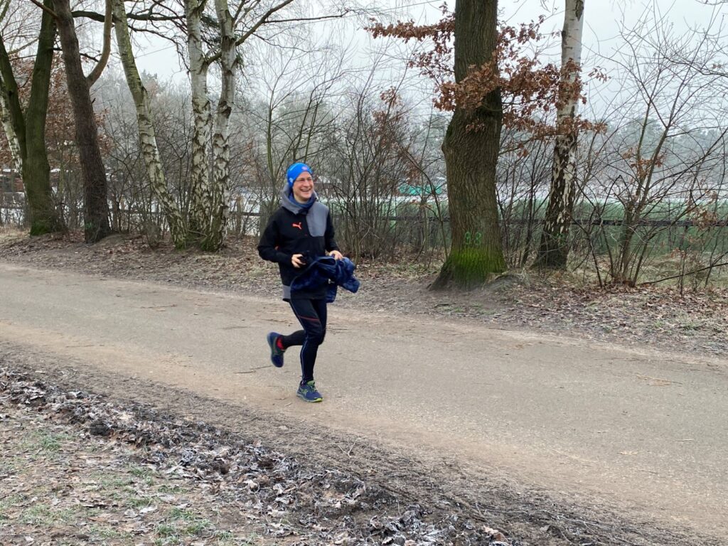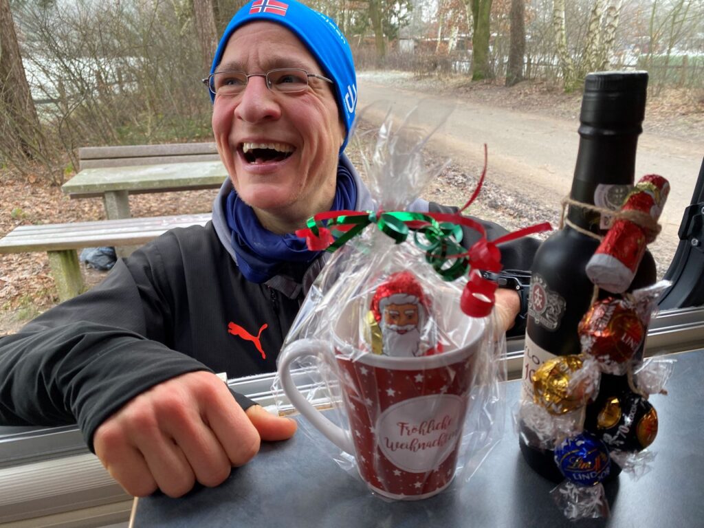 … Morgendämmerung …… trotzten Spaziergänger und … ( Foto – Martin)… Läufer der Marathonstrecke im Buchwedel bei -6 Grad. – Klar erkennbar an der blauen Mütze lief Jakob an diesem kalten Wintertag ein sehr schnelles Tempo. (Foto – Martin)Der Buchwedel leuchtete in weihnachtlichen Farben. (Foto – Martin)Ingo hatte sich zu seinem winterlichen Läuferoutfit heute dicke Handschuhe zugelegt: „Ich hatte trotzdem kalte Hände!“ (Foto – Martin)Der botanische Name dieser Pflanze ist „Marrubium vulgare“ von hebr. mar – bitter und viel; lat. marrubius – Berghopfen; vulgare lat. gewöhnlich – Diese Erstbeschreibung stammt aus dem Jahr 1753 von Carl von Linné. -Naturstandorte sind Wegränder. Diese blaue Weihnachtskugel bekam durch die dünne Eisschicht einen glitzernden Effekt.Rolf und Jürgen hatten gute Laune und einen hurtigen Schritt drauf, obwohl sie wieder …… „bergauf“ durch den Tunnel noch weitere Runden absolvieren mussten. – Durch die fehlenden Blätter an den Bäumen hat man die Möglichkeit, den Güterzug vom Rangierbahnhof Maschen zu sehen.Karl Wolfgang freute sich auf die zweite Runde.Eingeschlossen durch die frostige Kälte ist kaum erkennbar, um welche Pflanze es sich handelt. Vielleicht, nein ganz bestimmt hätte Carl von Linné das gewusst. – Wer war dieser Carl von Linné? Er wurde am 23.05.1707 in Rashul in Smaland als Carl Linnaeus geboren und starb am 10.01.1778 in Uppsala. Den Adelstitel bekam er erst später für seine großen Verdienste in der Botanik und in der Zoologie. Zusammenfassen könnte man seine Leistung mit diesen Worten : „Gott hat die Welt geschaffen, Carl von Linné hat sie geordnet.“Rolf kämpfte sich diese Steigung viermal hoch und lief am Ende gemeinsam mit Jürgen ins Ziel.Eine einsame Lock – auf dem Weg zum Rangierbahnhof in MaschenSuper, Karl Wolfgang! Auf in die zweite Runde!Beate kam an diesem kalten Wintertag 21 Minuten nach Jakob ins Ziel und war froh, sich gleich nach Zieleinlauf ins Auto setzen zu können, um dann nach Hause zu fahren.Raureifflächen und Flächen vom „aufgewärmten“ Boden wechselten sich ab. Raureif entsteht aus feinen unterkühlten Nebeltropfen beim Anlagern an festen Oberflächen, deren Temperatur unter 0 Grad liegt.Dick eingemummt und gutgelaunt nahm sich Martin seine nächste Runde vor. Trotz der Minusgrade sah sich Jakob gezwungen, sich von einer seiner Zwiebelschichten zu verabschieden, da es ihm zu warm geworden war. Er setzte den Lauf in unvermindertem schnellem Tempo fort. Cornelia „is still going strong“!Kai, Rosi und das Buchwedel-Maskottchen Cindy waren bereit für eine neue Runde. Cindy warf dabei einen besorgten Blick nach hinten, um zu sehen, ob Kai noch da war.Ingo unter BeobachtungIch nahm meine Rolle als Paparazzi auch in der Kälte dieses Tages wahr! Helmut wollte, dass ich seinen Winterbart bewundern sollte.Die Eisperlen schmückten den Bart vom Helmut.Didi konnte heute leider verletzungsbedingt nur eine Runde absolvieren. Im Ziel freute sich Jakob über Didis lobende Worte zur Leistung der Teilnehmer. – Alle Teilnehmer bekamen als „Danke“ einen Weihnachtsbecher mit der Aufschrift „Fröhliche Weihnachten“ vom Veranstalter. Der 10 Jahre gelagerte Portwein von Jakob kam sehr gut bei Didi und mir an!Martin freute sich, dass er den Marathon bei der Kälte bald hinter sich hatte. Glückwunsch, Martin! Ingo und Jürgen mussten noch weiterkämpfen. Aber, …… Ingo ließ es sich nicht nehmen, die Eisperlen seines Bartes für eine Nahaufnahme zur Verfügung zu stellen.Cindy, Rosi und Kai beendeten den 65. Buchwedel Marathon auf der Höhenrunde zu ihrer Zufriedenheit. Cindy bekam ihr verdientes Leckerli. Kai hatte ja schon, wie Rosi auch, den „Danke – Becher“ mit dem Nikolausi aus Schokolade bekommen und gratulierte Cindy zu ihrer Leistung. Die Mitbringsel der Teilnehmer des 65. Buchwedel Marathons schmückten unseren Küchentisch!Danke an alle Buchwedel Marathon Teilnehmer für das Jahr 2021! – Didi und ich haben uns gefreut, dass der Buchwedel Marathon bei so vielen Läufern an Beliebtheit gewonnen hat. – Wir wünschen allen einen guten Rutsch und ein gesundes Jahr 2022!