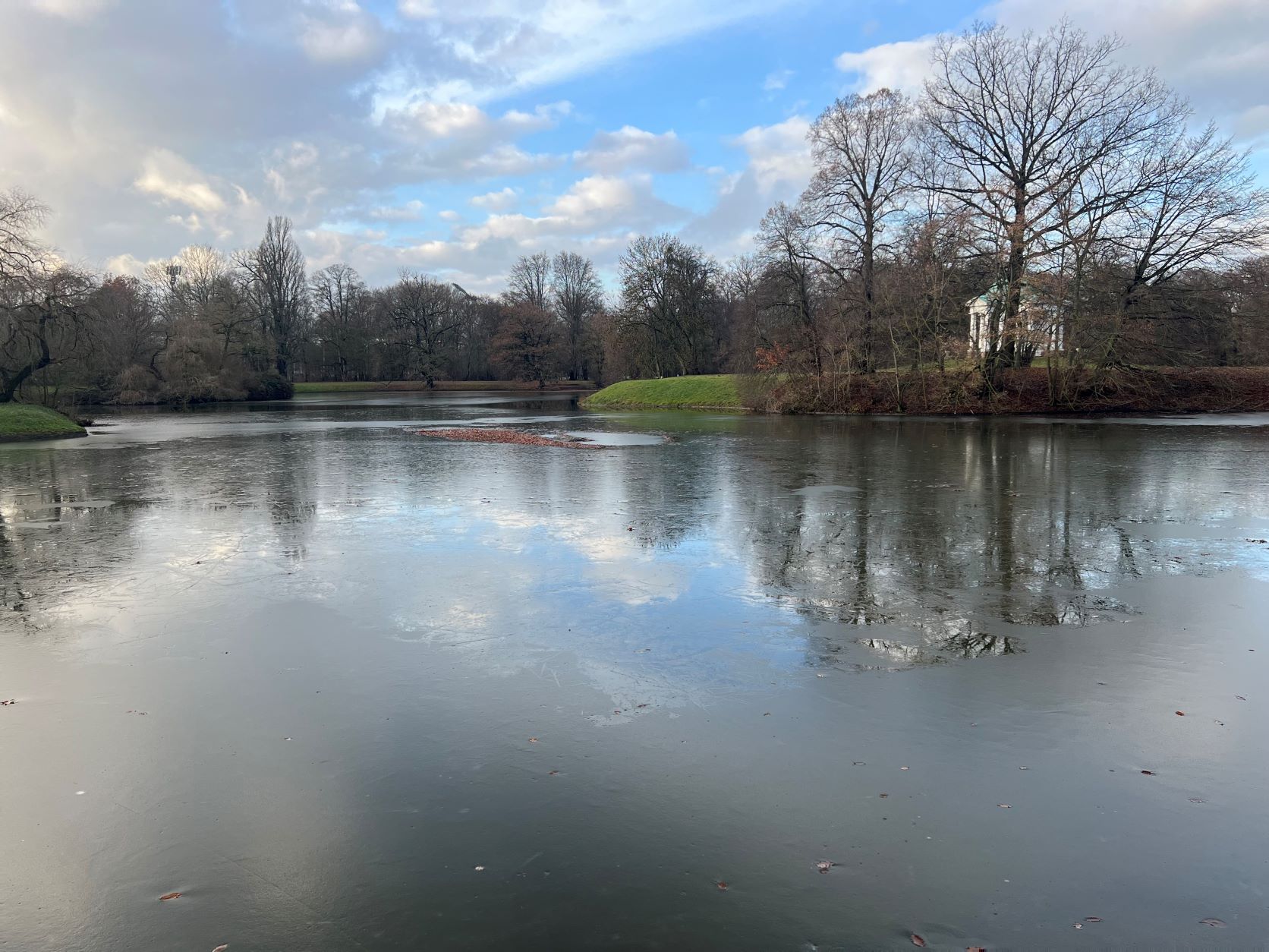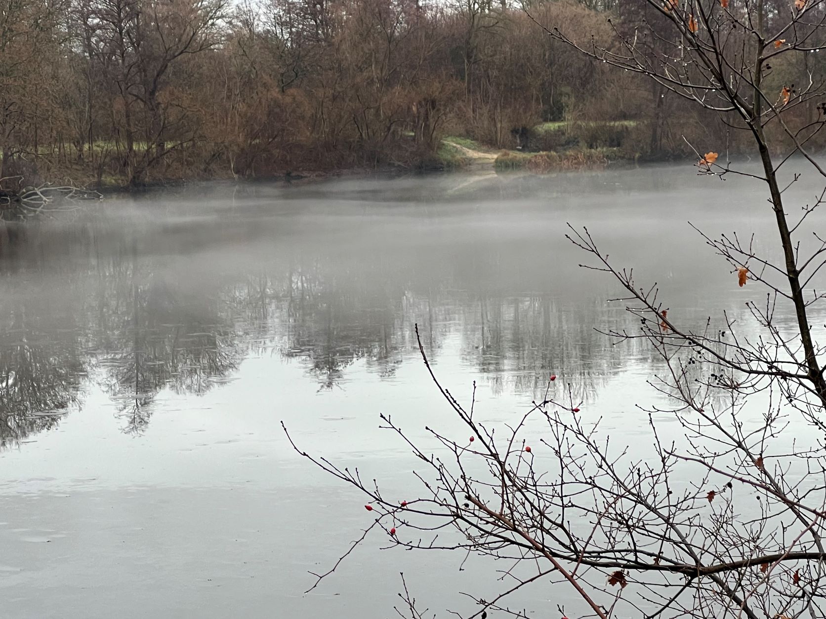 Didi freute sich über meinen Vorschlag, ,,,… gemeinsam …… einen Spaziergang durch den Staatspark Karlsaue zu machen.Die Sonne zeigte sich vorsichtig am Horizont.Auf dem Aueteich befand sich eine dünne Eisschicht in der Nähe des Ufers. Im Hintergrund die Schwaneninsel, auf der ein Tempel aus dem 18. Jahrhundert steht.Zwei Paparazzis, die …… den Tempel auf der Schwaneninsel mit seiner …… goldenen Kugel auf dem Dach, die den Planeten Juptiter symbolisieren soll, fotografieren wollten.In der dünnen Eisschicht entdeckte ich interessante Spuren, die ein merkwürdiges Muster bildeten.Die Nilgans stammt ursprünglich aus Afrika. Später wurde sie als Ziervogel in Großbritannien angesiedelt.Männchen und Weibchen der Nilgans sehen im Gefieder gleich aus. Der Unterschied liegt in der Größe und im Gewicht. Das Männchen ist größer und schwerer. Die Merkmale der Nilgans sind u.a. braune Augenflecke und lange rosa Beine.Der Höckerschwan hat seinen Namen bezogen auf den Höcker über dem Schnabel. BeimMännchen ist der Höcker deutlich größer als beim Weibchen.Das Höckerschwanmännchen (vorn) und das Weibchen mit ihrem Jungen – Noch nicht ausgewachsene Jungvögel haben ein graubraunes Gefieder, das im Verlauf des ersten Lebensjahres zunehmend heller wird. Ein vollständig weißes Gefieder bekommen die Jungschwäne erst nach der Vollmauser im zweiten Lebensjahr. Der Schnabel ist noch schwarz oder grau, geht dann zunehmend ins orange über.Im Cafe´ Siebenbergen im Staatpark Karlsaue gönnten Didi und ich uns eine recht teure Pause (1 Glas Rotwein 9,50 Euro und 1 Latte Macchiato 4,50 Euro), …… bevor sich die Sonne von uns verabschiedete. Wir hatten ein wenig Zeit ….… und machten uns gegen 17:30 Uhr auf den Weg zu unserem Chinesen „Augarden“.Im Eingangsbereich des Restaurants fielen unsere Blicke sofort auf das imposante und sehr gepflegteAquarium mit wunderschönen Goldfischen, die sich über unseren Besuch anscheinend sehr freuten.Am nächsten Morgen nutzte Didi das Angebot, früher starten zu können. Sylke kam kurz vor 06:00 Uhr zum Start und überreichte mir einen Schokoladenweihnachtsmann für Didi und einen Schokoladenengel für mich. Ich durfte einige Male den Weg vom WoMo Stellplatz zum Start und Ziel und zurück unter die Füße nehmen, damit …… Didi …… seine Verpflegung an dieser Stelle zu sich nehmen konnte.Inzwischen war das Wetter richtig ungemütlich geworden. Mal nieselte es, mal regnete es ganz ordentlich.Aber, wie heißt es so schön: „Nur die Harten kommen in den Garten!“ Mit energischen Schritten erledigte Didi das Auftaktstück und ging in die nächste Runde.Sylke und Bennie „nahmen etwas an Geschwindigkeit raus“, als sie den Start- und Zielbereich erreichten. Da sollte nämlich Bennie seinen …… Schokoladenweihnachtsmann von Sylke bekommen. Er positionierte ihn am Türgriff seines roten Autos. Aufessen wollte Bennie ihn erst nachdem er den Marathon gelaufen war. Bei einem Rahmenstart treffen sich die Läufer später immer irgendwo auf der Strecke und freuen sich. (Selfie Michael)Die Fulda – Das blaue Band: Wie ein blaues Band zieht sich die Fulda durch Kassel. Genutzt wird das Wasser gleichermaßen im, auf und am Wasser, von Naturliebhabern und Menschen, die ihr „Domizil“ am Ufer aufgeschlagen haben.Für die Frühstarter wirkte der Nebel über der Wasseroberfläche der Fulda wie eine Aufnahme aus einem Edgar Wallace Krimi. Als ich auf dem Rückweg über die im Jahr 1962 gebaute Damaschkebrücke war, hörte ich hinter mir Schritte und drehte mich um. Wen sah ich da? Der Frank begrüßte mich fröhlich. Er war in einer seiner letzten Runden.Zwei Michaels – Das Foto spendete Michael T., da Michael K. (Mister Statistics) früh gestartet und schnell fertig war, bevor ich ihn fotografieren konnte. Danke, Michael für das gespendete Foto!Michael gab mir die Möglichkeit, ihn im Hellen zu fotografieren. Bevor er in die nächste Runde startete, nutzte er die Gelegenheit, … … ein Foto von mir zu machen. Danke, Michael! Da sehe ich wenigstens recht schlank aus. Inzwischen wollte uns der Regen gar nicht mehr verlassen. Dem Didi machte es nichts aus; er war auf dem Weg …… ins Ziel mit einer neuen Hahnzeit und einem weiteren Zähler „in der Tasche“! Glückwunsch an alle Finisher! – Leider fehlt mir ein Foto vom Jens, den ich aufgrund des schlechten Wetters fotografisch nicht festhalten konnte. Ich suchte zwischendurch ja immer wieder Zuflucht ins WoMo, um nicht wie „ein begossener Pudel“ auszusehen. – Draußen gab der Regen sein Bestes, während Didi und ich etwas Weihnachtsstimmung im WoMo aufkommen lassen konnten.