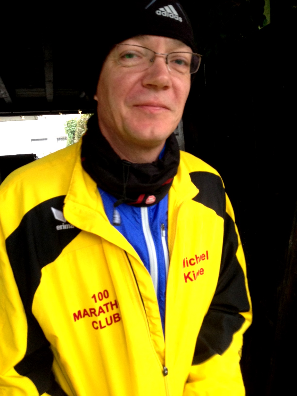 Nun hieß es „Marathon laufen!“ Der Start sollte wie immer um 8.00 Uhr stattfinden. Jeder der Läufer bereitete sich auf den Start vor. Da es draußen so ungemütlich war, drängelten sich alle unter der überdachten Vepflegungsstelle. Der Statistiker des 100 Marathon Clubs war neben der Jubilarin so ‚was wie ein Ehrengast.