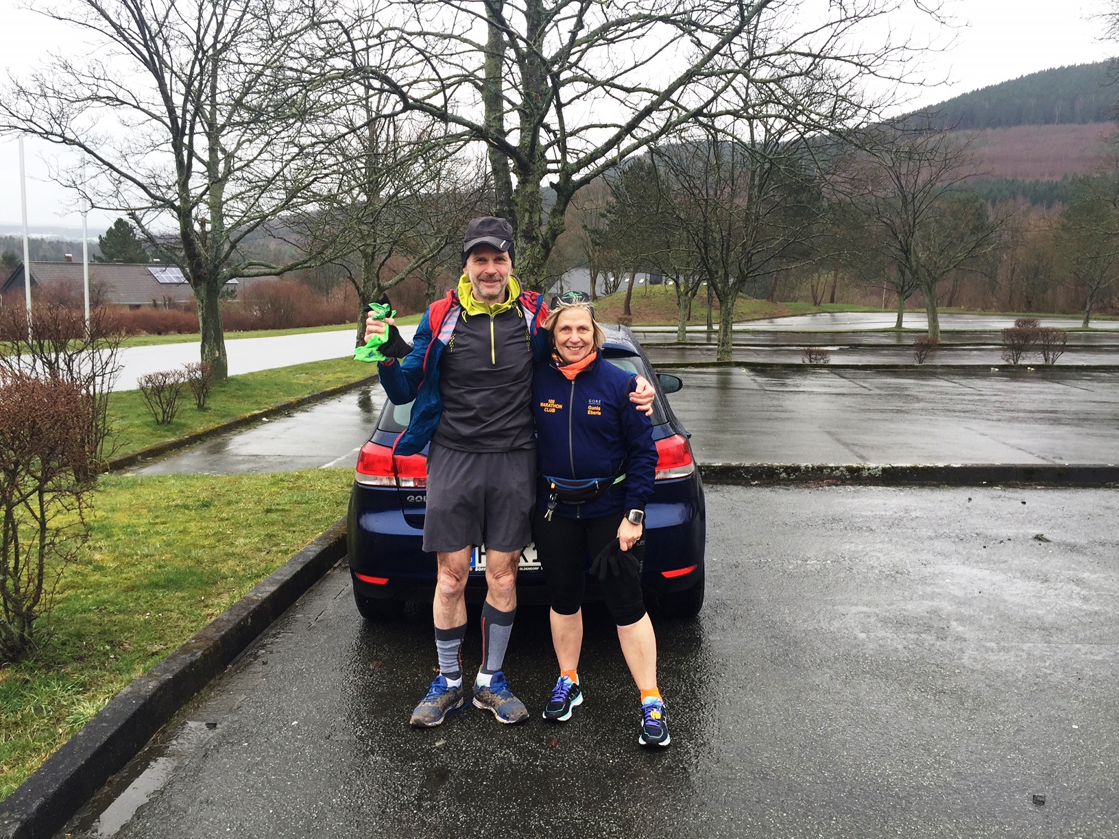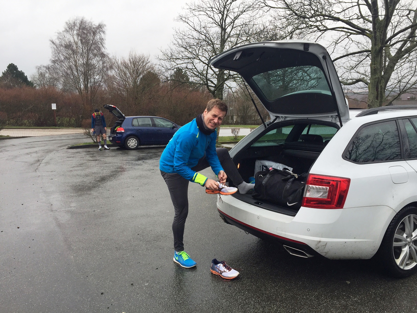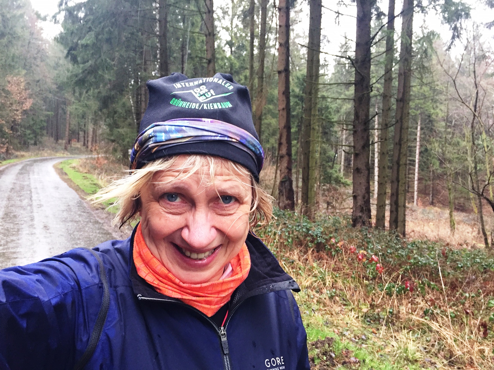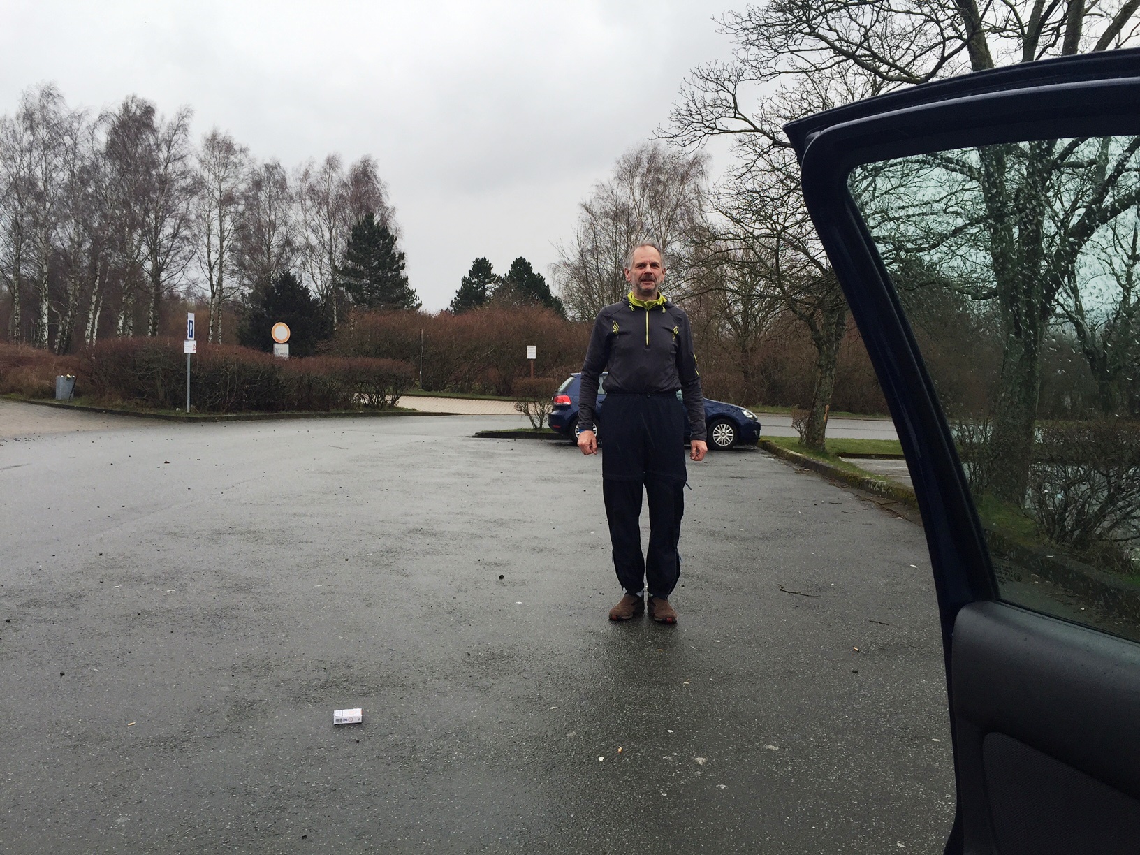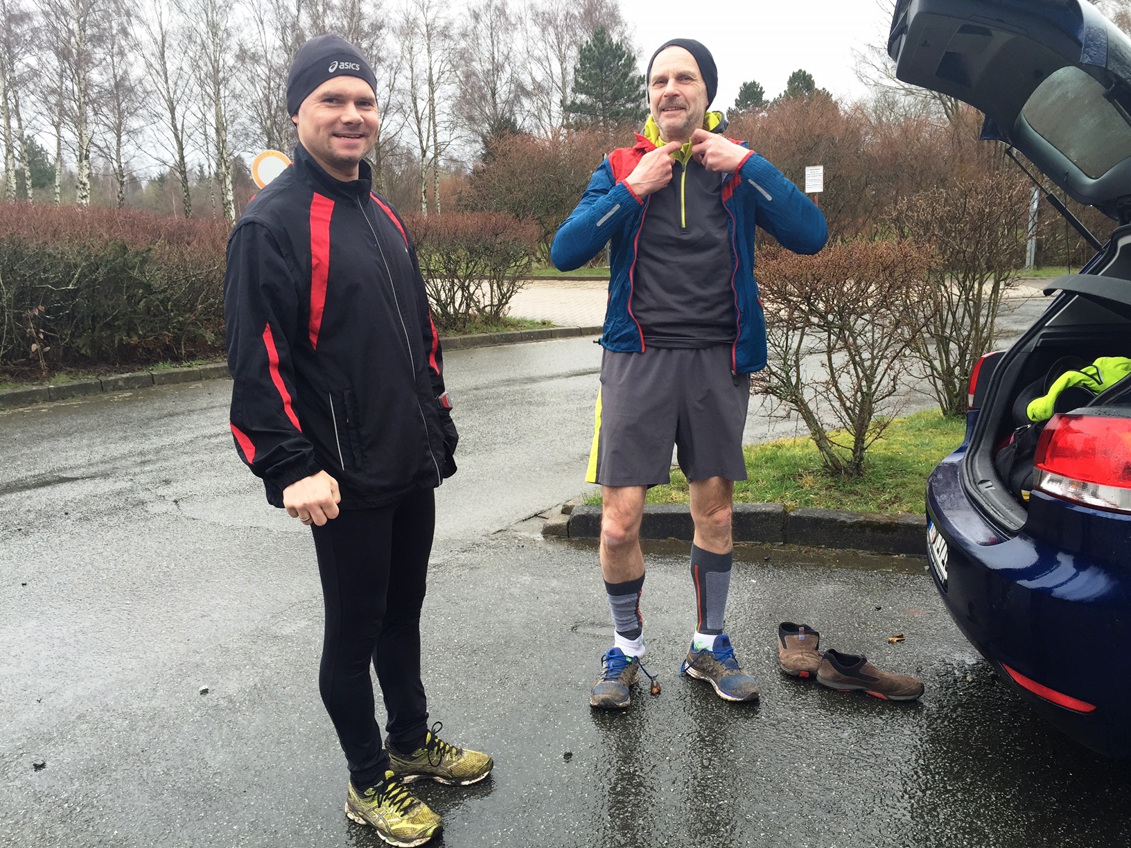 Zwischendurch hatte es aufgehört zu regnen. Als Werner kam, setzte der Regen wieder ein. Es waren aber Freudetränen, denn Werner verriet, dass dieser Lauf sein 150. M/U werden sollte! Er war total motiviert und freute sich so auf den Lauf! Kurz vor 9.00 Uhr kam ein ebenfalls gutgelaunter Lars, bekleidet im sommerlichen Outfit, an. So ein Optimist, dachte ich! Danach stellte sich heraus, dass er nur eine Runde von den dreien laufen wollte!