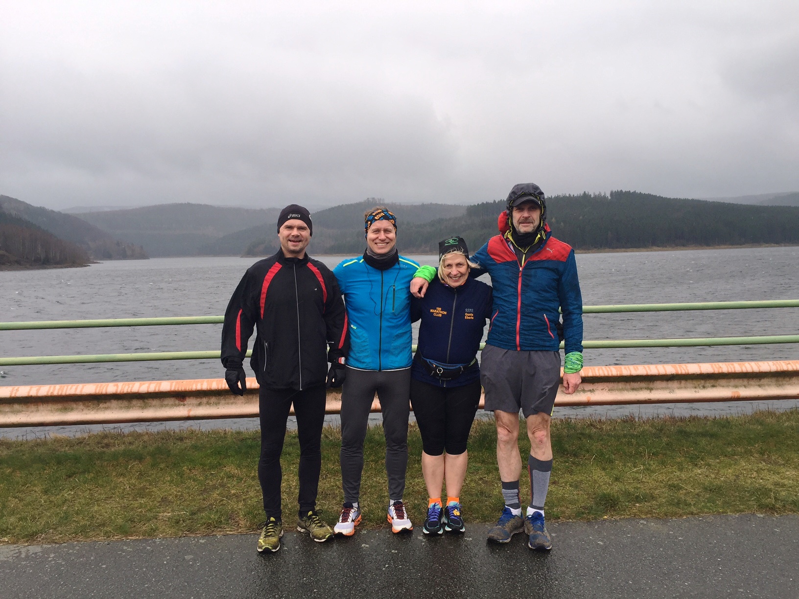 .… geht es auch! Ich hatte mich nun entschieden, den Marathon an der Granetalsperre zu laufen und damit einen weiteren Zähler anzustreben. Zusammen mit dem lauffreudigen Veranstalter Marc, seinem Freund Lars, Werner und mir sollte der Marathon stattfinden. Schlecht gelaunt und müde, weil ich in der Nacht davor schlecht geschlafen hatte, machte ich mich auf den Weg nach Langelsheim/Astfeld zur Granetalsperre. Es schüttete wie aus Eimern und ich war mir nicht sicher, ob ich nicht lieber umdrehen sollte. Aber irgendwas in mir hinderte mich daran. Rechtzeitig gegen 8.15 Uhr kam ich in Langelsheim an. Noch war keiner zu sehen. Gegen 8.45 Uhr erschien Werner.