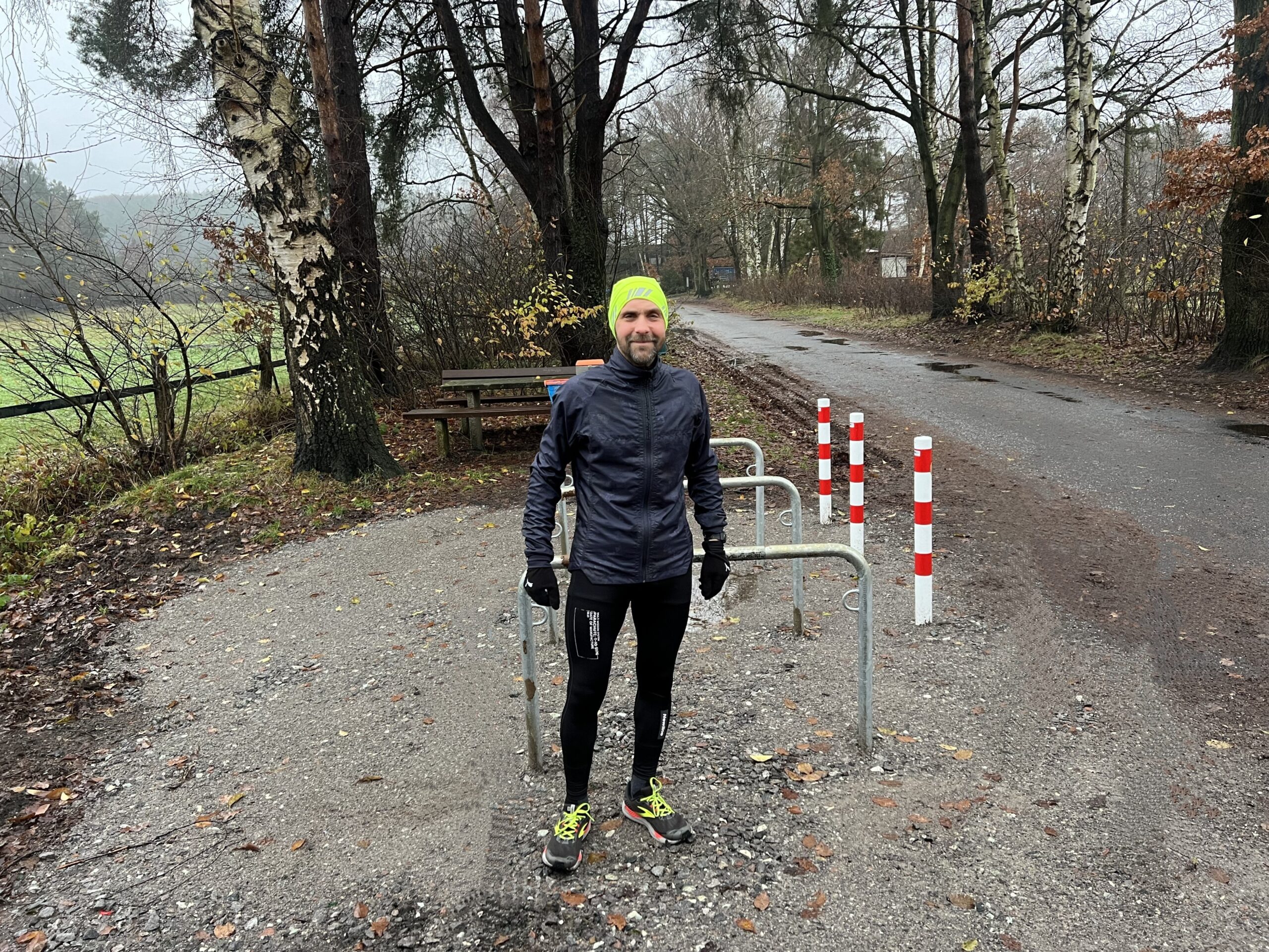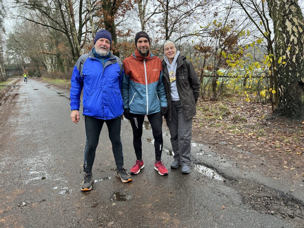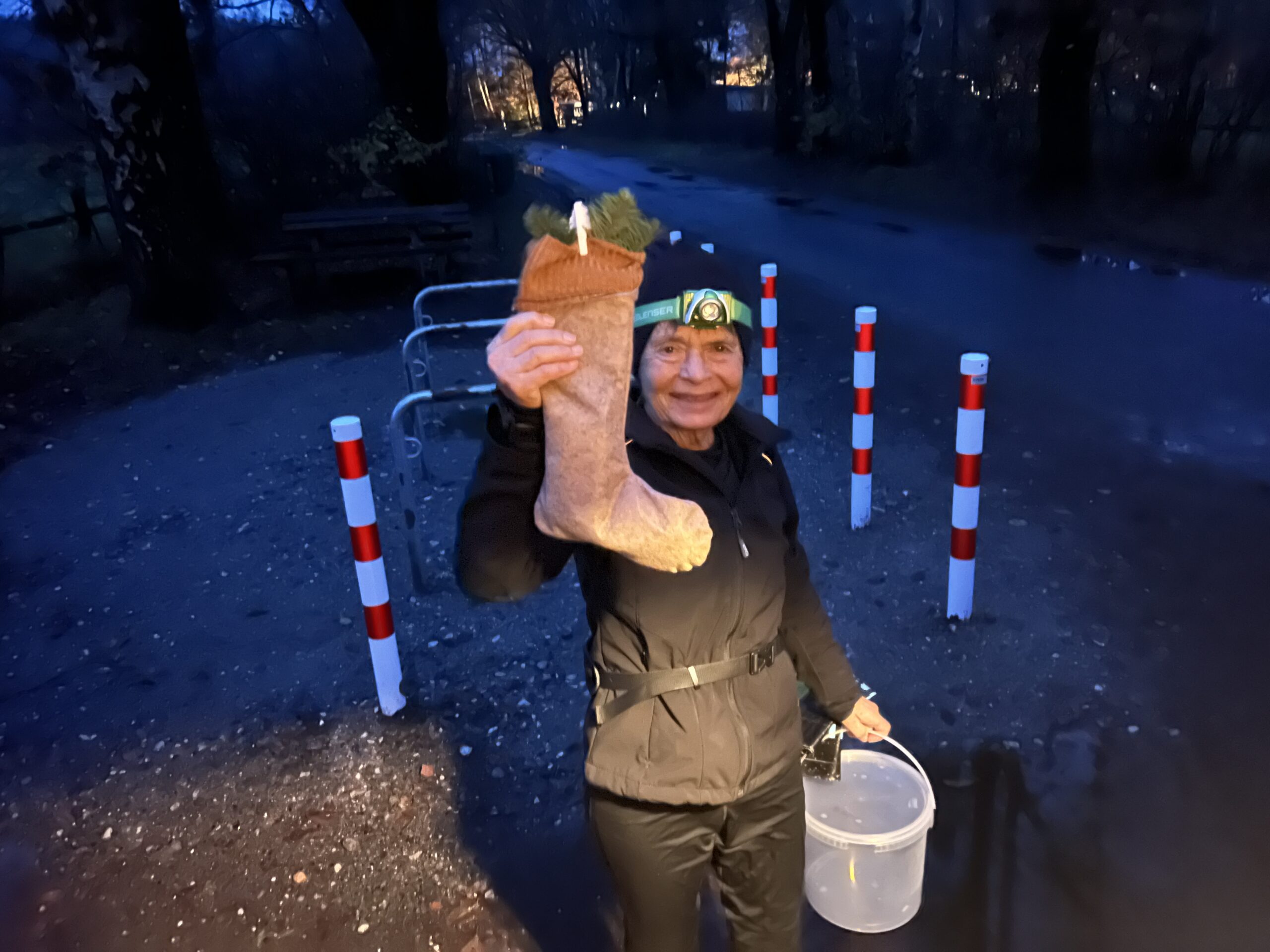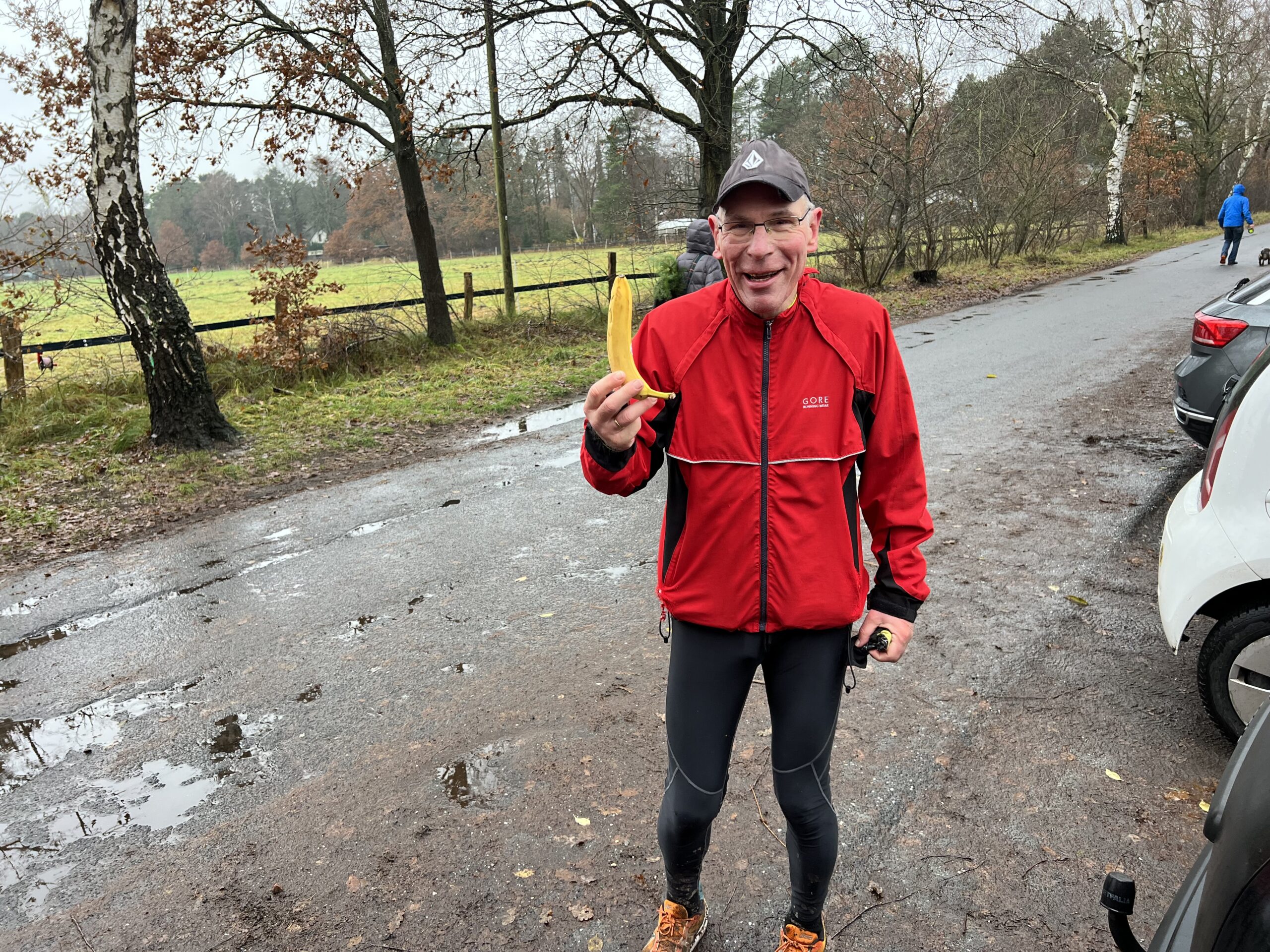 … Didi stand um 05:00 Uhr mit der Stirnlampe bereit zum starten. Eine Stunde später …… folgte Gerd, der sich auf die 42,604 km durch den Buchwedel freute.Rosi bekam erstmal ihre Nikolaussocke, die sie am Nikolaustag wetterbedingt nicht bekommen konnte. Dann ging es für sie und Cindy auf die Marathonstrecke durch den Buchwedel.Michael suchte in seinem Kofferraum nach seinem Weihnachtsgeschenk für den Veranstalter, bevor er … … seine Marathonzeit mitteilte.Aha, dafür sollten die Metallbügel sein!Christoph versuchte am Start die hässlichen Metallbügel verschwinden zu lassen. Könnte aber mit Fleckenkorrektur besser gehen. Im Buchwedel herrschte schon Weihnachtsstimmung.Der „Läuferweihnachtsmann“ war auch schon fleißig.Das ist die berüchtigte Steigung etwa bei Kilometer 5,5. Für jeden Läufer ist dieser Streckenabschnitt jedes Mal eine Herausforderung.Birgit und Christoph genossen die Atmosphäre im Buchwedel. Allerdings wäre sie mit Sonne schöner.Rosi und Cindy ganz entspannt unterwegsWolfgang meldete sich an.Rosi und Cindy sind ein eingespieltes Team.Diese Foto hat Seltenheitswert. Didi spaziert und kommuniziert mit Jakob! War wohl anstrengend, so musste Didi sich mit einem Brot, belegt mit Heidefrühstück und Petersilie, stärken.Fiete hielt Herrchen Olaf auf Trab und gab immer wieder eine neue Richtung an.Gerd holte sich eine „Banane to go“ aus seinem Auto und setzte zu einer neuen Runde an.Das Wetter war ungemütlich. Trotzdem begab ich mich für ein Selfie an die frische Luft.Birgit lief ein flottes Tempo in eine neue Runde.„Ich genieße noch den Buchwedel für eine Weile!“ Didi machte einen zufriedenen Eindruck.Hübscher BaumschmuckGerd – gut gelaunt unterwegsDidi wurde auf seinem Handy von Gerd fotografiert. Das ist eine gelungene Aufnahme, wie ich finde!Wolfgang sprintete ins Ziel, um …… seine Laufzeit des heutigen Trainigs abzugeben. Glückwunsch!Ein letztes Mal musste Birgit an dieser Pfütze vorbeilaufen.Im Ziel wartete Fiete im 100 MC Outfit ungeduldig und kläffend auf …… Frauchen Birgit, die trotz Verlaufens eine sub 05:00 Stunden lief und den 3. Platz erreichte. Herzlichen Glückwunsch, Birgit! Gerd lief mit einer neuen Hahnzeit über die Ziellinie. Gratuliere!Christoph sicherte sich den 1. Platz mit einer Sub 04:00 Stunden Laufzeit! Super, Christoph!Didi brauchte ab jetzt nur 3 Hahnzeiten und könnte sich dann über den 22. Hahn freuen! Didi, Christoph und Birgit wünschen allen Lesern eine besinnliche Vorweihnachtszeit.