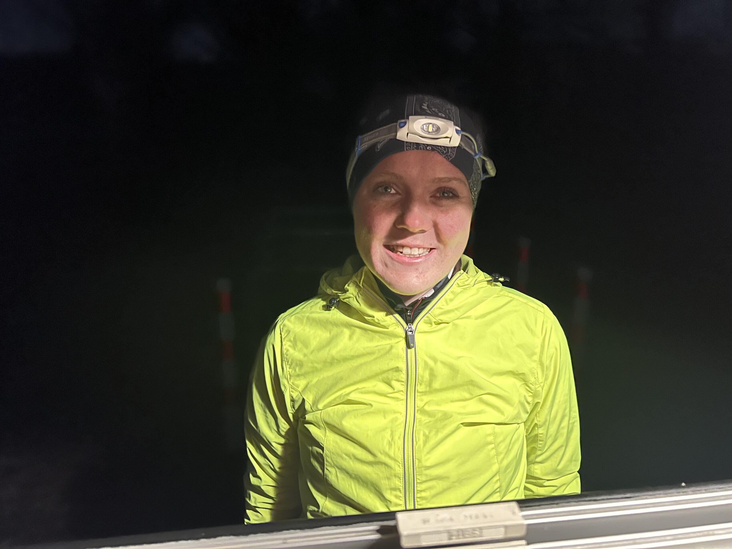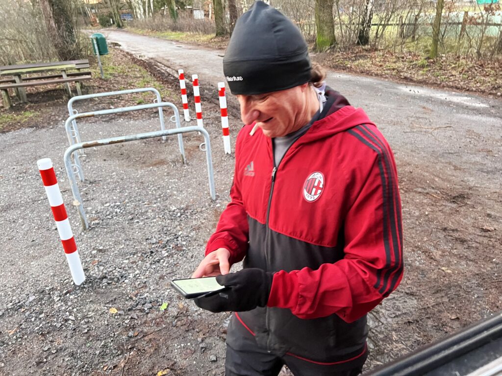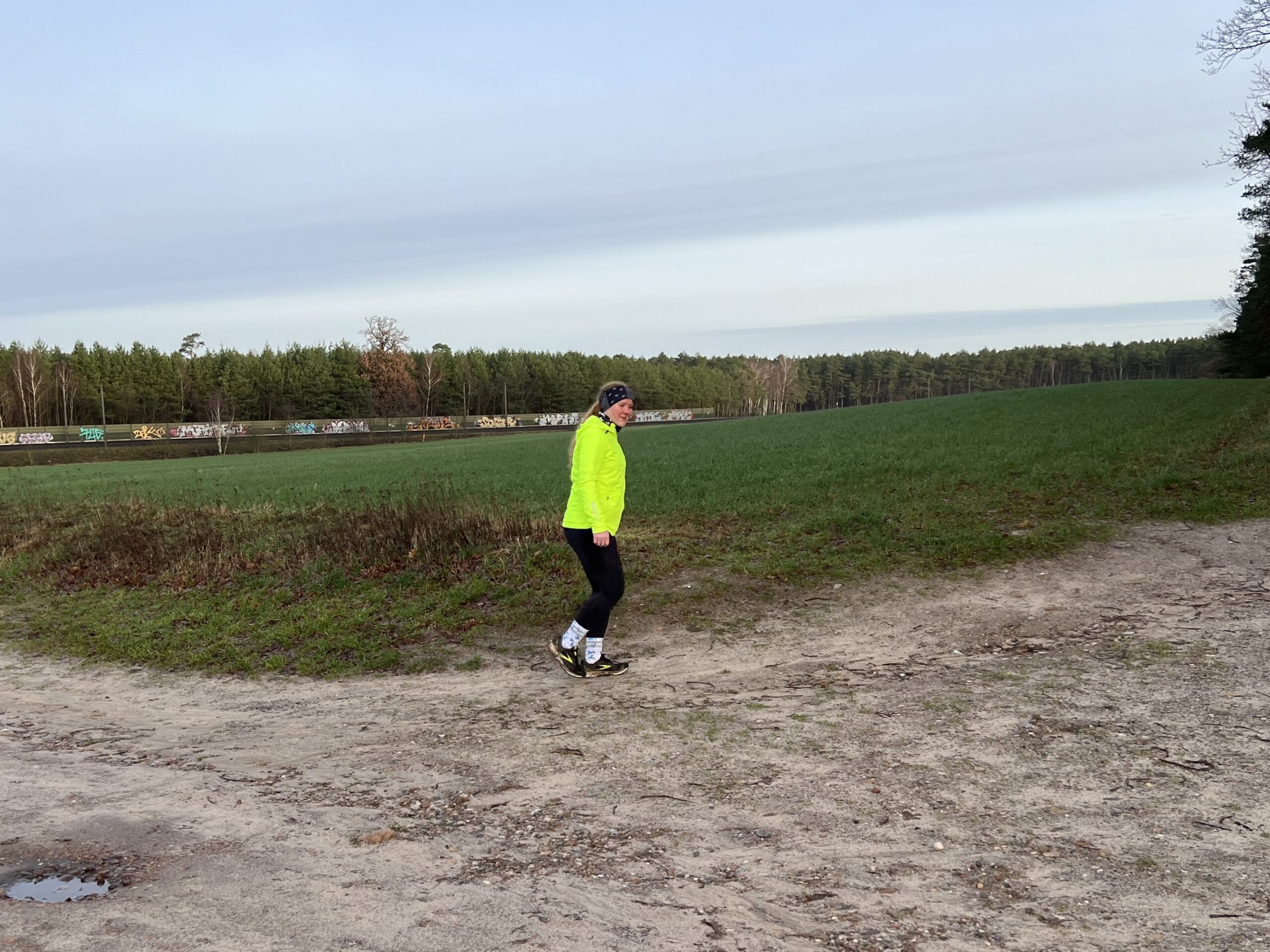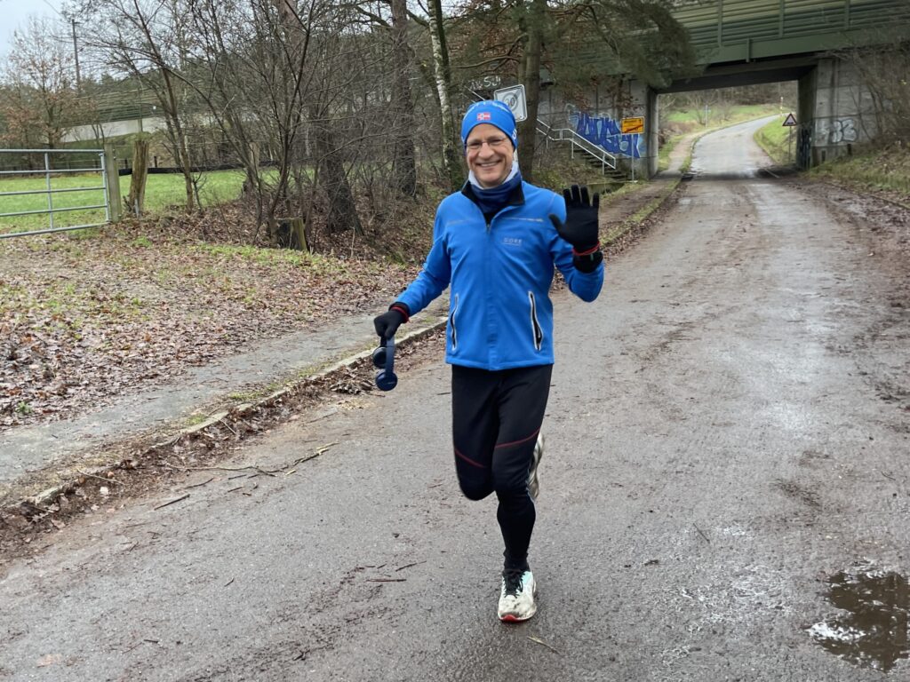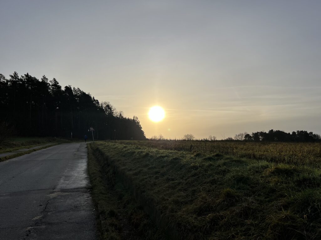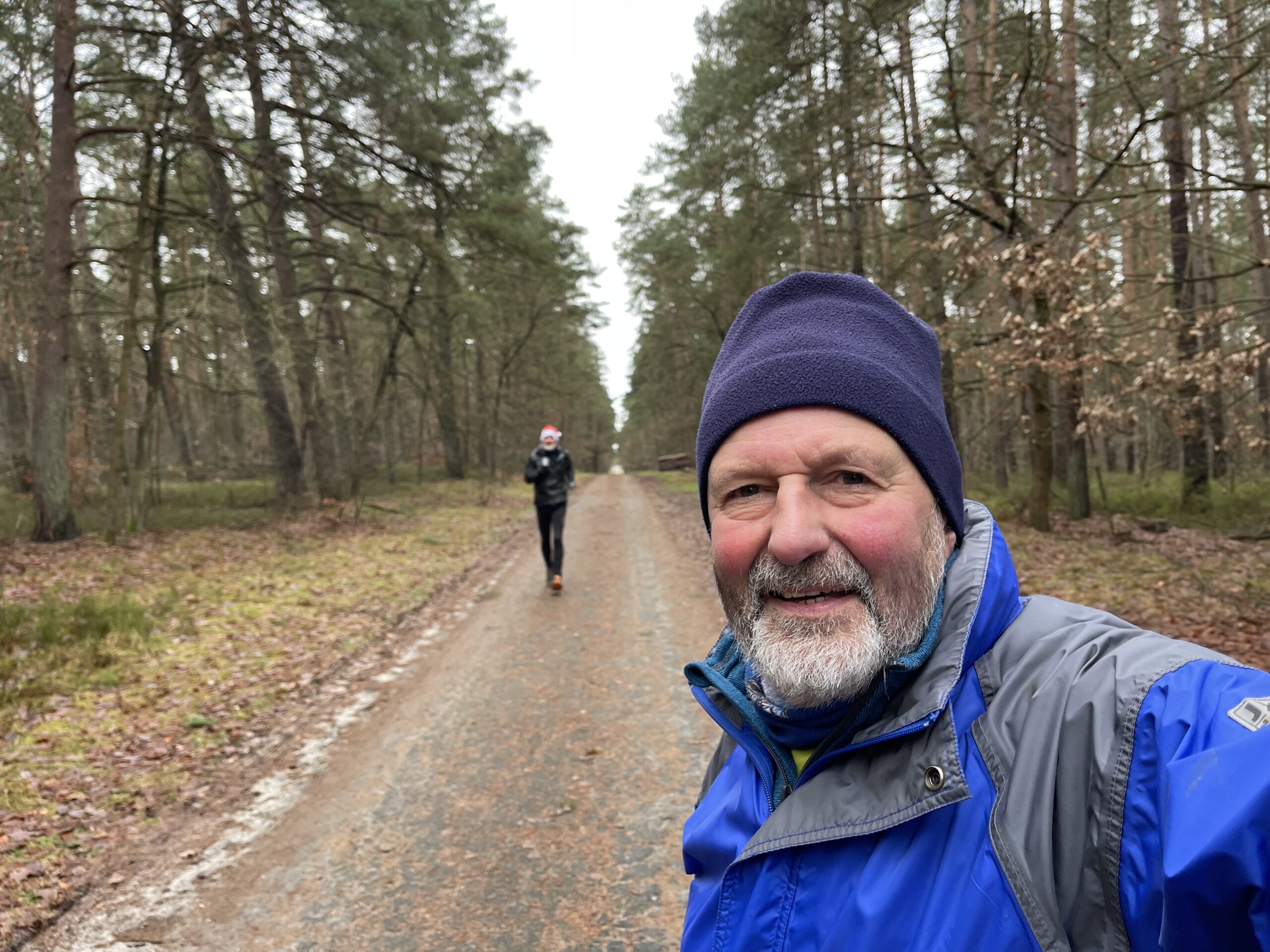 Michael startete mit Taschenampe und traf …… Didi, der im Dunkeln die Stirnlampe bevorzugt, bei Kilometer 7.Celina war etwas müde, trat aber ebenfalls mit Beleuchtung ans Fenster des „Wettkampfbüros“ und signalisierte ihre Bereitschaft zu starten.Kurz vor 08:00 Uhr zeigte sich die Sonne am Horizont, unterstützt von der noch leuchtenden Straßenlaterne.Etwas später deutete der Sonnen- …… aufgang am Horizont im Wald einen schönen Tag an.Michael war heute nicht ganz so schnell und teilte mir seine genaue Laufzeit mit. Glückwunsch, Michael!Eine malerische Kulisse durch die aufgehenden Sonne und die majestätische Erscheinung der Windräder – Danke, Didi für dieses wunderbare Foto!Celina beendete ihre zweite Runde mit der Sonne im Rücken. Die Sonne hatte mich zu Außenaufnahmen rausgelockt. Ich konnte einfach nicht genug Fotos von der … … Sonne und …… fröhlichen Läufern machen. Hier freute sich Jakob, dass er seine erste Runde in Begleitung der Sonne beenden konnte. Ein Windrad muss sich nicht immer drehen; sieht auch so gut aus und die Flügel schaden den Vögeln nicht.Ein Streckenabschnitt der Höhenrunde – am Horizont ist eine leichte Steigung zu erkennen.Nach dem Verlassen des Start- und Zielbereichs freute sich Celina auf die nächste Runde. Jakob wollte unbedingt Celina einholen und gab bei der Steigung des Start-und Zielbereichs richtig Gas.Zwei Ponys aus dem Ponyhof hatten einen kleinen Spaziergang unter der Leitung einer resoluten Reitlehrerin hinter sich und freuten sich auf die bevorstehende Huf- , Fell- und Mähnenpflege.Ingo war heute fix unterwegs.In der Nacht zum 24.12.2023 war ein Baum bei Kilometer 6 durch den Sturm am Vortag umgestürtzt und lag quer auf dem so nicht passierbaren Waldweg. Am …… 27.12.2023 war es dann wieder möglich, den Waldweg ganz normal zu gehen. „Mann, hat er ein Tempo drauf!“, schien Celina zu denken. Sie ließ Jakob „ziehen“ und zog es vor, mit Didi (der das Foto geschossen hatte) im moderaten Tempo weiterzuwalken und sich zu unterhalten.Ingo kam zum Fenster des „Wettkampfbüros“ und verkündete seine Zielzeit, bevor er die letzte Runde unter die Füße nahm. Somit konnte ich seinen Abholservice aktivieren.Celina im Ziel – Die Freude über den geschafften Zähler war ihr anzusehen. Glückwunsch, Celina!„Es grüßt euch Didi, der Veranstalter!“„Weihnachten ist zwar vorbei, aber die Mütze wärmt!“ Didi schmunzelte etwas über Ingos Kopfbedeckung.Ingo sprintete wie nichts Gutes ins ziel und hatte noch Zeit, …… mit Celina ein paar Worte zu wechseln. Ingo wollte wissen, ob Celina Wünsche für das Weihnachtsfest im Jahr 2024 hätte.Darauf konnte Celina so schnell keine Antwort geben, da Jakob fröhlich schon auf der Zielgerade erschien.Das war heute spannend, denn kurz nach Jakob tauchte Didi auf der Zielgerade auf und … … stoppte seine Zielzeit für den nächsten Hahn.So waren sie alle ohne längeres Warten bereit für ein gelungenes Zielfoto. Annett, in der Mitte der Läufertruppe, kam pünktlich zur angekündigten Zielzeit von Ingo und machte das gut gelaunte Quintett vollzählig.