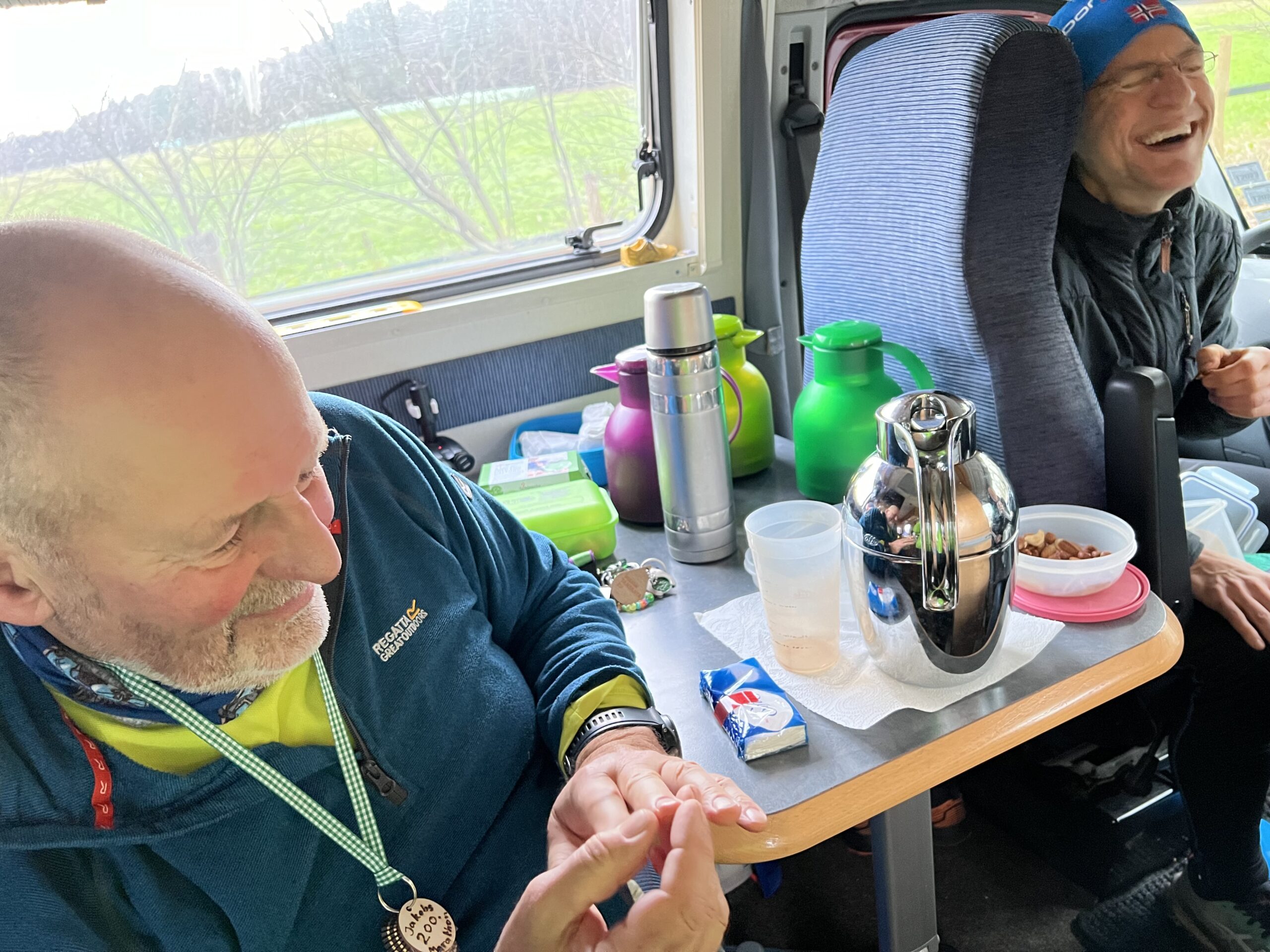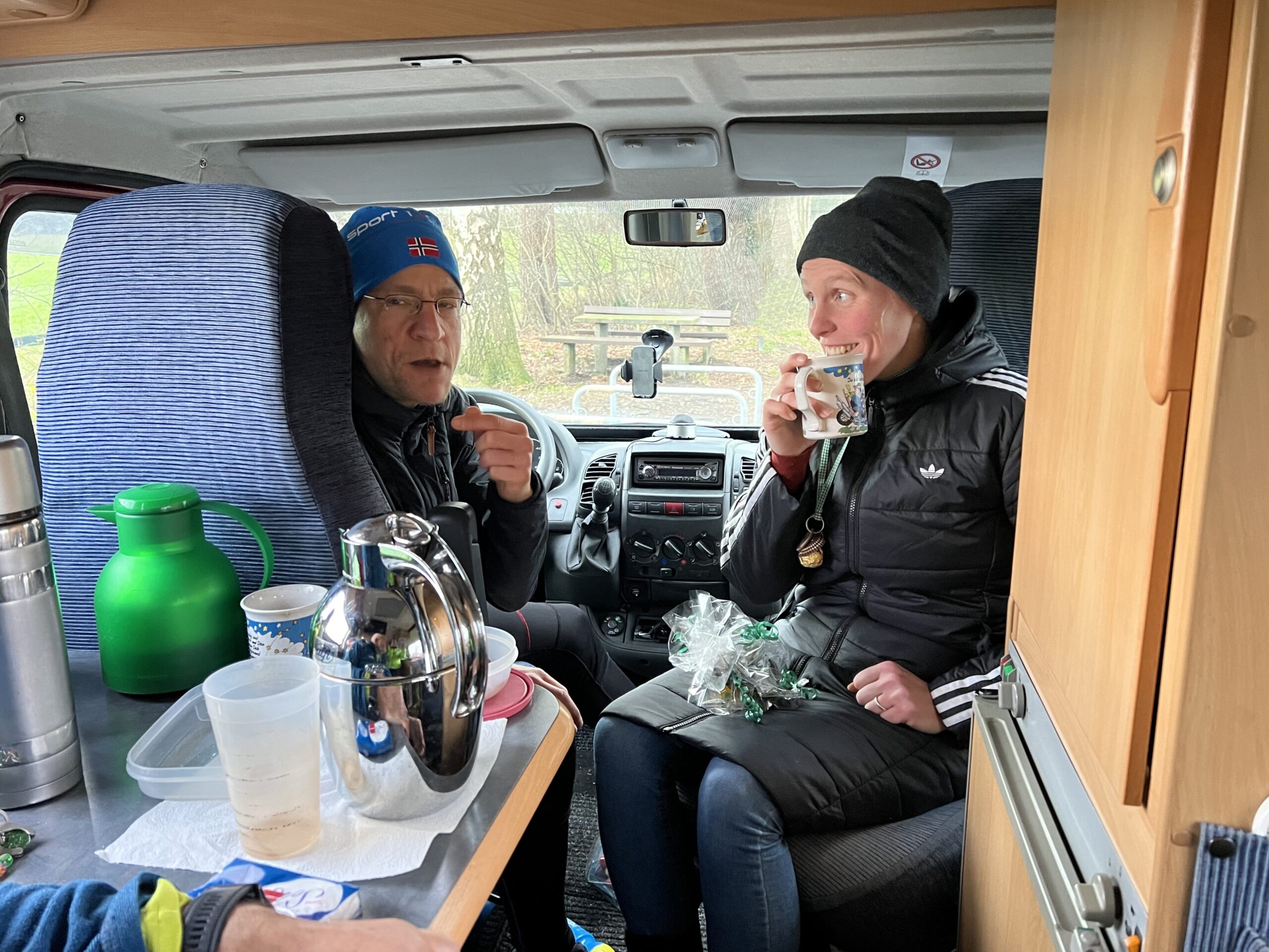Der Mond war klar und ziemlich hell am Himmel zu sehen. – „Der Mond verbirget sich, der Nebel grauer Schleier – Deckt Luft und Erde nicht mehr zu. … “ (Aus: „Morgen-Gedanken“)Es wurde langsam hell. Ich wollte raus aus dem WoMo und … … den Sonnenaufgang bewundern. „Der Himmel färbet sich mit Purpur und Saphiren, – Die frühe Morgenröte lacht. … – (Aus: „Morgen-Gedanken“)Rabea hatte die erste kleine Steigung geschafft und war auf dem Weg in den Buchwedel.Didi war schon um 05:00 Uhr gestartet und hatte hier soeben seine zweite Runde geschafft.Martin war um 06:00 Uhr gestartet und wollte Didi einholen. Das stellte sich als etwas schierig dar, denn …… er musste erst dieses Hindernis überwinden. „Wie komme ich hier rüber?“„Puh, das habe ich geschafft!“ Wie Martin das geschafft hatte, das sollte ein Geheimnis bleiben.Endlicht vereint, beschlossen Martin und Didi eine Runde zusammen zu walken. Man hatte sich doch einiges zu erzählen.Rosi war heute nicht ganz so entspannt wie sonst mit Cindy unterwegs. Es war ja auch Sylvester und …… Cindy war höchst irritiert über die vorzeitige Sylvesterknallerei. Rosi behielt die Nerven, denn sie und Cindy, …… wollten Jakobs 200. M/U zusammen mit Rabea, Jakob, Martin und Didi feiern. Gemeinsam wollten Rabea und Jakob die nächste Runde unter ihre Füße nehmen, nachdem …… Rabea sich gestärkt und Jakob ein paar Dehnungsübungen getätigt hatte.Zwei gute Lauffreunde, die sich unterschiedlichen Proviant für die nächste Runde mitnahmen.Die Pferde vom Ponyhof durften auch mal draußen speisen.Hatte mich mit neuem Neonpaparazzioutfit eingekleidet. Ein überglücklicher Martin im Ziel – Das war heute sein erster Marathon nach seiner Laufpause. Glückwunsch, Martin!Jakob und Rabea auf der Strecke Ein gutes Timing: Rabea und Jakob liefen gemeinsam mit dem Veranstalter Didi ins Ziel. Jakob konnte sich über seinen 200. M/U freuen. Glückwunsch, lieber Jakob!Es fehlten noch Rosi und Cindy. Da wir etwa 15 Minuten auf sie warten mussten, luden Didi und ich Jakob und Rabea zu einem Becher Tee in unser WoMo ein.Es herrschte eine gemütliche Unordnung im WoMo. Das fand Jakob lustig, während Didi schmunzelte und gern etwas Ordnung vorzeigen und beide Sitze zum Tisch umgedreht hätte haben wollen.„So, dann kommen wir zur Ehrung des heutigen Jubilars Jakob!“ Nicht nur Jakob, nein auch Rabea, hörte aufmerksam zu. Beim Händeschütteln verhedderten sich Jakobs und Didis Hände und sie konnten vor Lachen die Hände fast nicht auseinander bekommen. „Sind die nicht albern?“, schien Rabea zu denken.Endlich klappte es und die drei Laufreunde stellten sich für ein erstes Jubiläumsfoto in Position. … Dann waren Rosi und Cindy auch im Ziel und ein zweites Jubiläumsfoto enstand. Für alle Teilnehmer und auch für mich gab es von Jakob eine handgefertigte Medaille. Danke, Jakob!