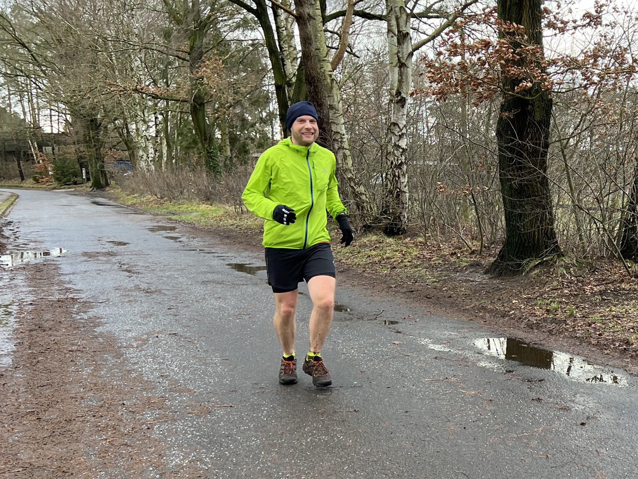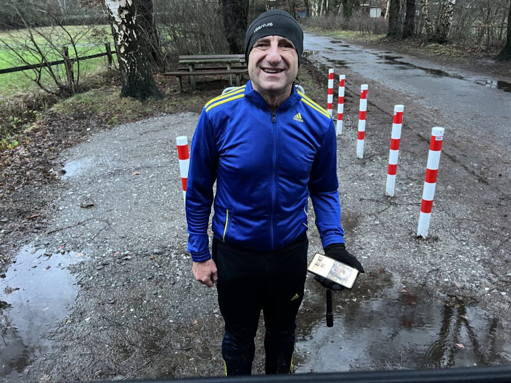 Michael war ziemlich durchgefroren, als er mir seine Zeit mitteilte. „Bis nächste Woche!“ Dann rannte er zu seinem Auto, um sich trockene Sachen anzuziehen.Faustregel für Marathonlaufen im Winter oder bei schlechtem Wetter: „Zieh dich so an, als wäre es 10 Grad wärmer als das Thermometer anzeigt! Jakob bevorzugte eine lange Hose, während Thomas, der zum ersten Mal im Buchwedel am Marathon teilnahm, lieber in kurzer Hose lief.Von einer Pfütze war an dieser Stelle keine Rede mehr. Hier musste eine schnelle Entscheidung getroffen werden: Celina entschied sich, rechts an diesem „Bächlein“ vorbei zu laufen, während Dirk sich entschied, auf der anderen Seite einen etwas größeren Bogen um das „Rinnsal“ zu machen.Inzwischen schaute die Sonne aus ihrem Versteck heraus und versuchte, den Wasserpegel der Pfützen zu minimieren.Die Mütze schützte meinen Kopf gegen eine etwas krätigere und doch recht frische Brise.Die Brennessel ist winterhart und braucht deshalb im Winter keinen speziellen Schutz.Hier angekommen, die Straße hinunter und die Runde ist geschafft! Dies war in jeder Runde die erste gemeine Steigung. Da müsste man fast schon ein Pferd satteln, um diesen „leichten“ Anstieg bewältigen zu können.Wasser gibt es genug!Die Pfützen im Buchwedel waren für Jakob kein Problem, da zwischen den kleineren Ansammlungen von Wasser genug Platz war, um vorbei laufen zu können.. Allerdings bestand Ausrutschgefahr durch den Matsch. Aber Jakob hatte alles im Griff.Celina und Dirk beendeten die zweite Runde auf dem relativ pfützenfreien Abschnitt im Start- und Zielbereich.Thomas musste sich bemühen, um an dieser Stelle keine nassen Füße zu bekommen. Er managte diese Prüfung durch seine Trittsicherheit und optimale Laufhaltung. Gut gelaunt nahm Thomas seine letzte Runde unter die Füße.Didi, der Erfinder dieser Strecke (Höhenrunde), legte seine Verkleidung als Batman später ab, denn er wollte seine letzte Runde als normaler Mensch zutücklegen.Der zweite Newcomer Dirk begann die Höhenrunde total relaxt ein letztes Mal. Thomas lief in einer Sub 5 ins Ziel. Er hatte hiermit als Newcomer auf dieser sehr anspruchsvollen Strecke und unter den fiesen Wetterbedingungen die Herausforderung angenommen. Diesen Test bestand er mit der Note 1. Glückwunsch, Thomas! Leichtfüßig und mit Kopfhörern konnte Jakob dem Tagessieg entgegenlaufen. Gratuliere, Jakob! Da erschien Didi, der unbedingt …… mit einer neuen Hahnzeit auf seiner Uhr …… das Ziel erreichen wollte. Geschafft! Gratuliere, Schatzi!Die letzte Runde hatte Dirk jetzt geschafft und konnte sich auf einen 3. Platz freuen, Glückwunsch! Mit dem Handy lieferte er …… ein gelungenes Foto von mir! Danke, Dirk! Ich sehe ja richtig energisch auf dem Foto aus.Hurra, hurra! Ins Ziel lief jetzt auch eine glückliche Celina! Gratulation, liebe Celina!Inzwischen hatte sich Didi im WoMo aufgewärmt und hörte Celina aufmerksam zu, als sie über ihre Eindrücke vom Lauf erzählte.Jeder Läufer bekam ein Glücksschweinchen vom Orgateam Eberle. Das Schweinchen soll Glück für alle ihre kommenden Läufe symbolisieren. – Lieber Dirk, vielen Dank für dieses Foto!
