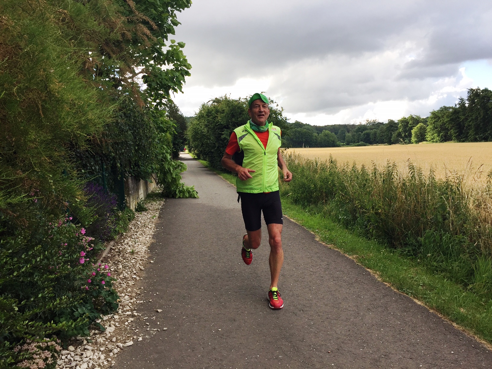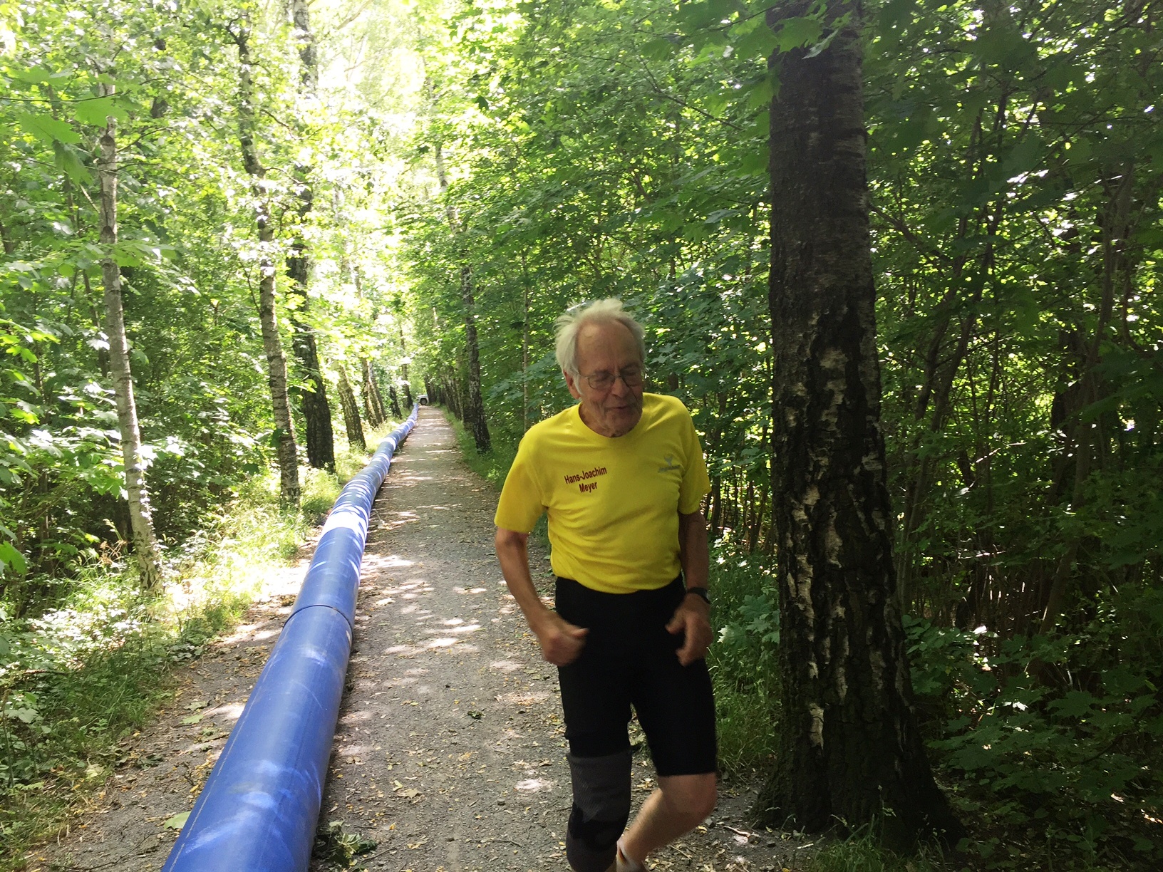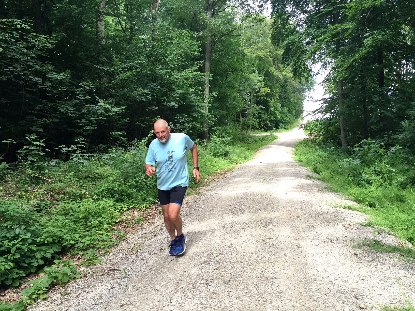 Ups, da kam der schnelle Dietrich wieder angepest! Was man nicht sehen kann, er läuft tatsächlich eine Steigung hoch. Irgendwo müssen die Höhenmeter ja auch herkommen!