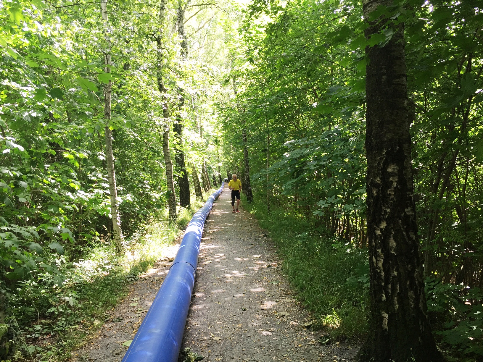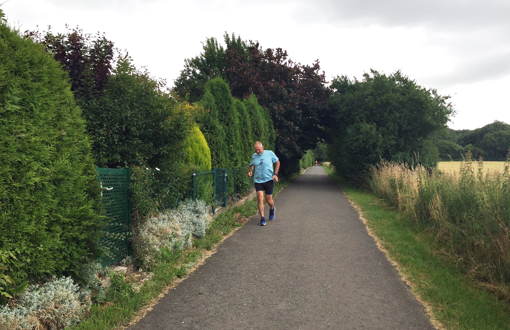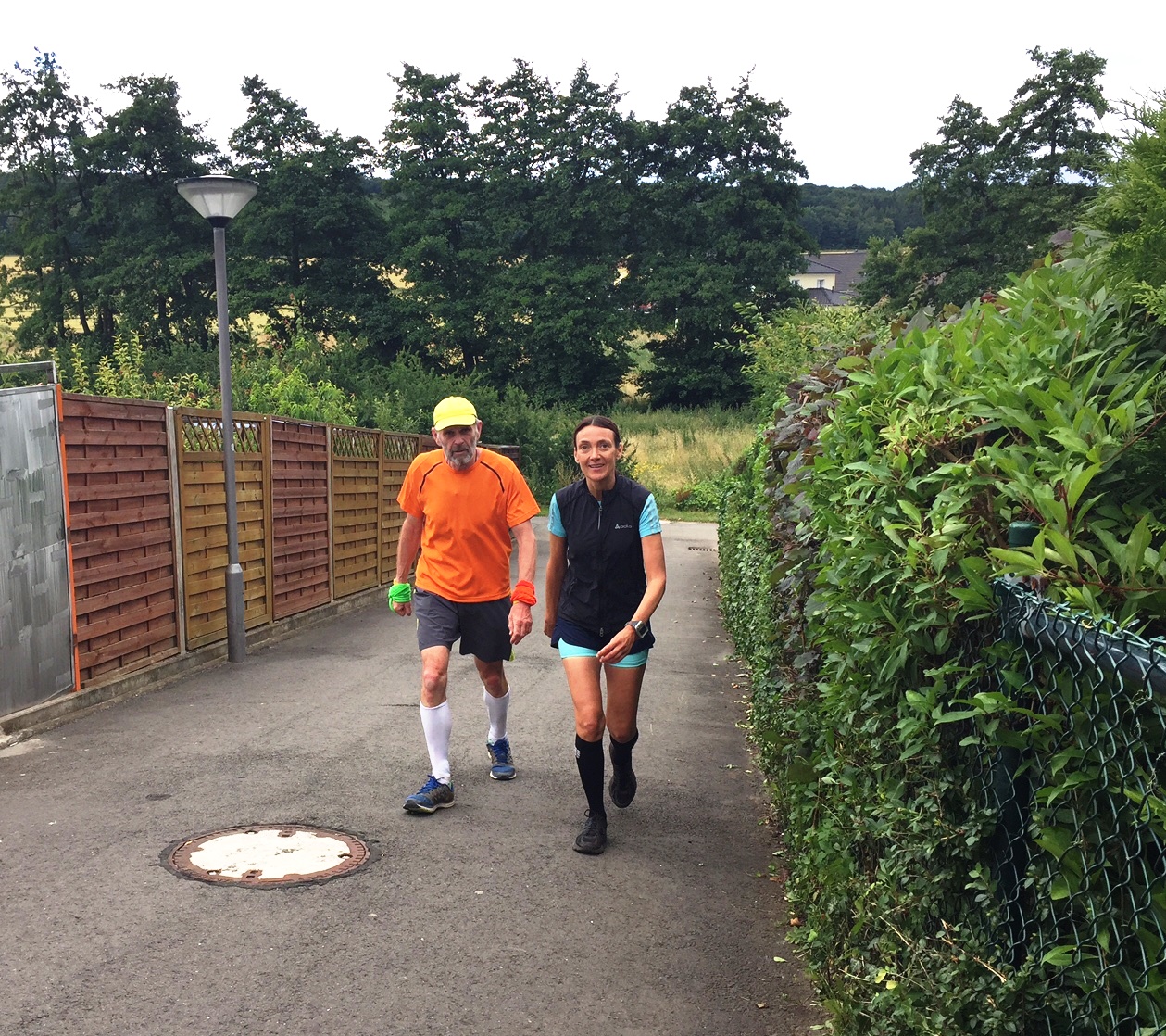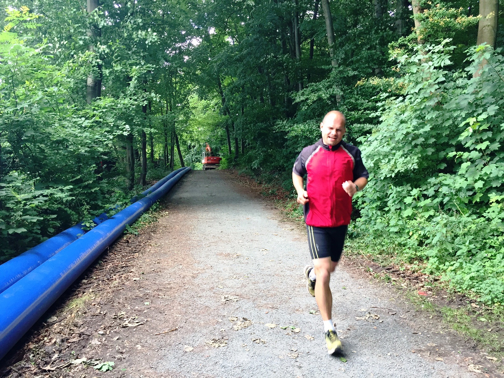Ups, da kam der schnelle Dietrich wieder angepest! Was man nicht sehen kann, er läuft tatsächlich eine Steigung hoch. Irgendwo müssen die Höhenmeter ja auch herkommen!