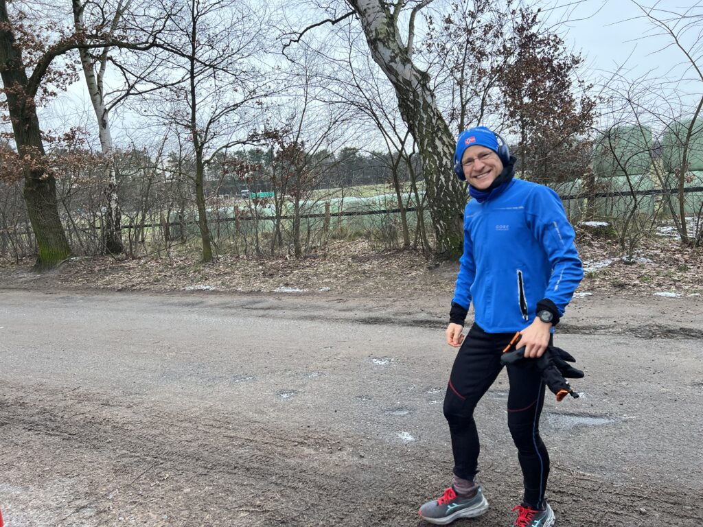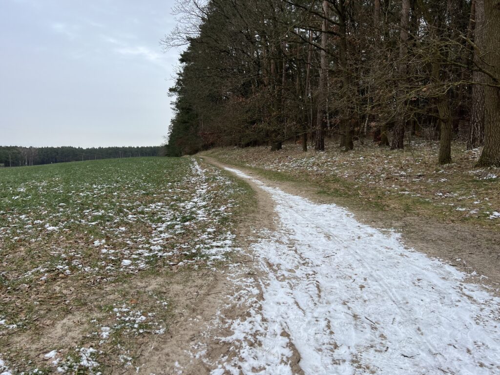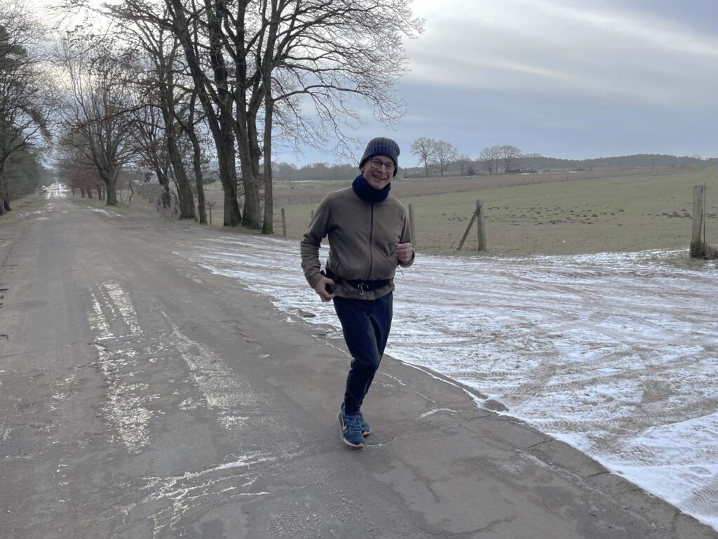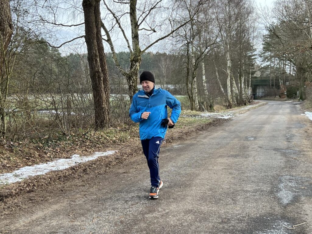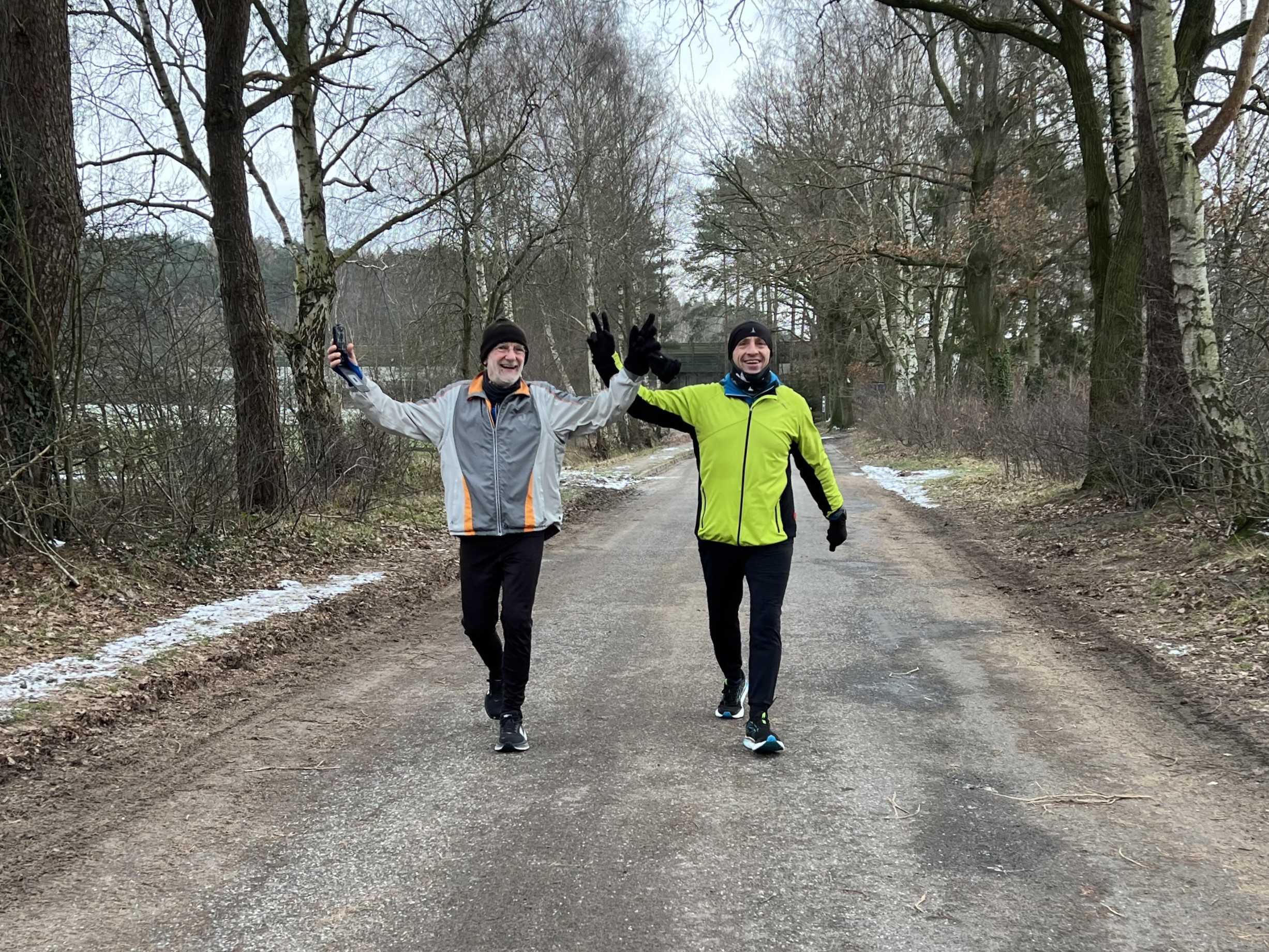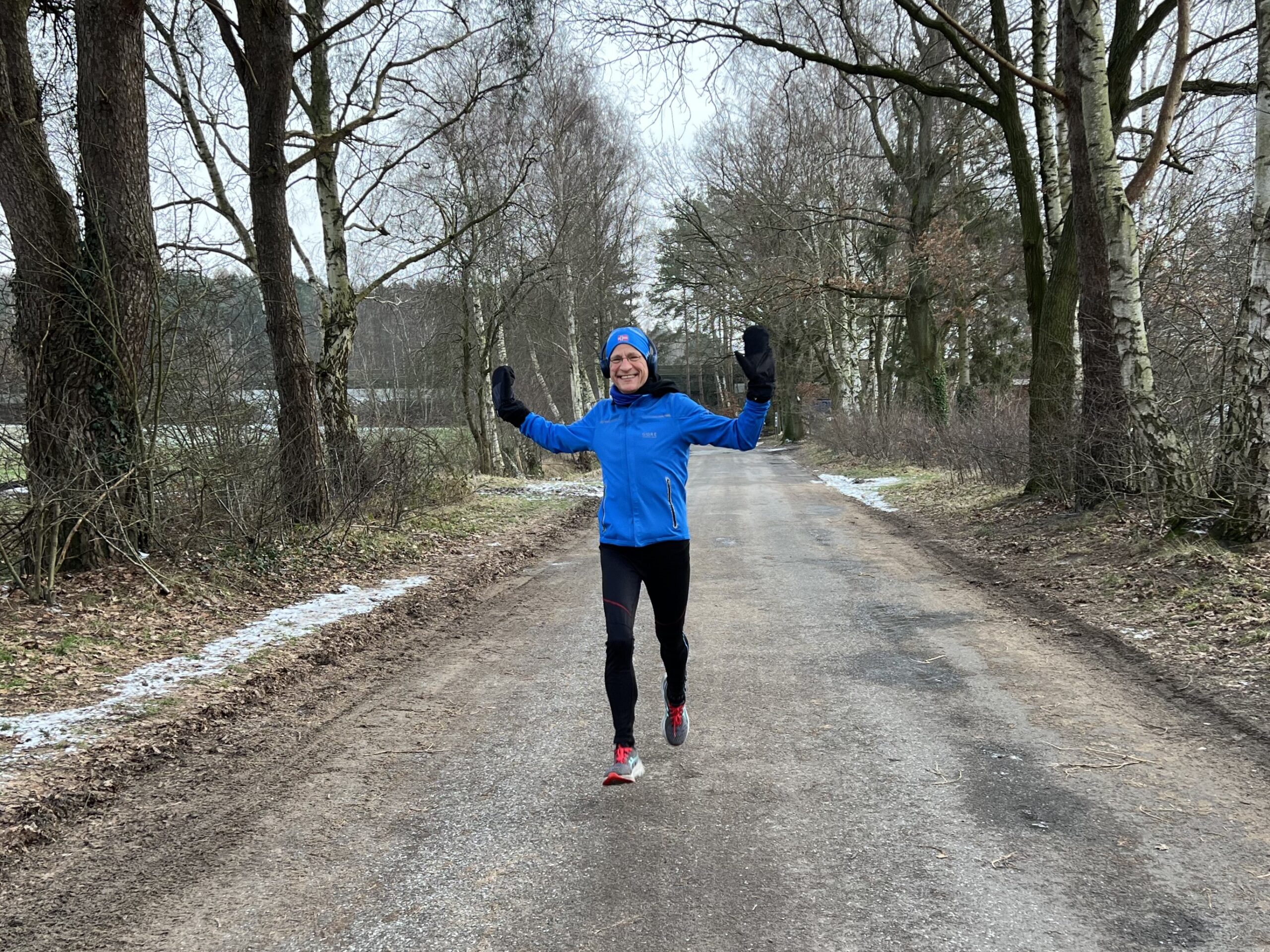 Selfie von Michael und Didi – allein im dunklen Wald (Buchwedel)„Gebe hiermit gehorsam meine Laufzeit an!“ Michael wollte am nächsten Mitwoch (24.01.2024) wieder dabei sein. Didi und ich freuen uns!Martin war trotz eisigen Windes fröhlich und leichtfüßig unterwegs. Er kommt immer wieder gerne zu uns.Der Buchwedeler Dauerteilnehmer Jakob war mit guter Laune bereit zu starten. Dirk war das zweite Mal dabei und startete im winterlich passenden Outfit und mit einem Stück Apfel in der Hand.Etwas bahnte sich hier an. Diese Wolken sprachen ihre eigene Sprache, …… die Sonne traute sich nicht wirklich raus aus ihrem Versteck und das hatte Folgen. Es wehte ein eisiger Wind und die Straße war spiegelglatt. Auf dem Waldboden lag eine dünne Schicht festgetretener Schnee und bedeutete etwas weniger Rutschgefahr für Läufer und Spaziergänger.„Schneewittchen“ lässt ihr blondes Haar vom Wind durchpusten.Die Beschaffenheit des Waldbodens an dieser Stelle schöpfte Hoffnung, dass es dann im Wald nicht unbedingt zu glatt sein musste.Wojciech lief heute einen Sub 6-Stunden Marathon. Hier beendete er seine dritte Runde.Freies Feld mit festgetretenem Schnee, der leicht gefroren zu sein schien, bedeutete Vorsicht, es könnte glatt sein.Didi hatte sich eine bestimmte Hahnzeit als Ziel gesetzt. Die Buchwedeler Winterlandschaft wirkte etwas langweilig, da … … kaum Schnee …… auf dem Waldboden lag und ohne die Sonne eine triste Stimmung vermittelte.. So, jetzt ging es für Wojciech nach der Stärkung in die vierte und letzte Runde.Das ist der Knotenpunkt, wo verschiedene, von Didi ausgesuchte und vermessene Laufstrecken im Buchwedel zusammentreffen. – Von unten kommend geht es rechts ab weiter auf der Höhenrunde. – Bei der Langen Runde kommt man von links und läuft weiter geradeaus auf der Strecke der Höhenrunde. Die Mittlere Runde verläuft ebenso wie die Lange Runde von links und dann aber rechts ab entgegengesetzt zur Höhenrunde.Martin hatte sich auf das Laufen im Buchwedel gefreut. Er war froh, dass der Boden streckenweise nicht glatt war und er somit das Lauftempo hier und da beschleunigen konnte.Auch Kai genoss die sehr abwechslungsreiche Strecke der Höhenrunde. Didi freute sich, dass er mit Lauffreunden im Buchwedel unterwegs sein konnte. Martin war nach einer Erkältung mit seiner heutigen Laufleistung mehr als zufrieden. „Ich bin 10 Minuten schneller als letztes Mal gewesen!“ Kai war diesmal ebenfalls schneller als letztes Mal unterwegs.Didi entschied sich, seinen 1476. Zähler im Laufschritt zu finishen.Jakob schwebte in Richtung Tagessieg! Glückwunsch, Jakob!Ihre letzte Runde beendeten Wojciech und Dirk gemeinsam.