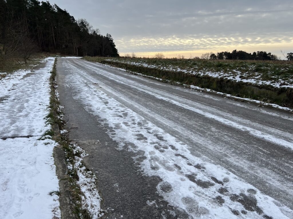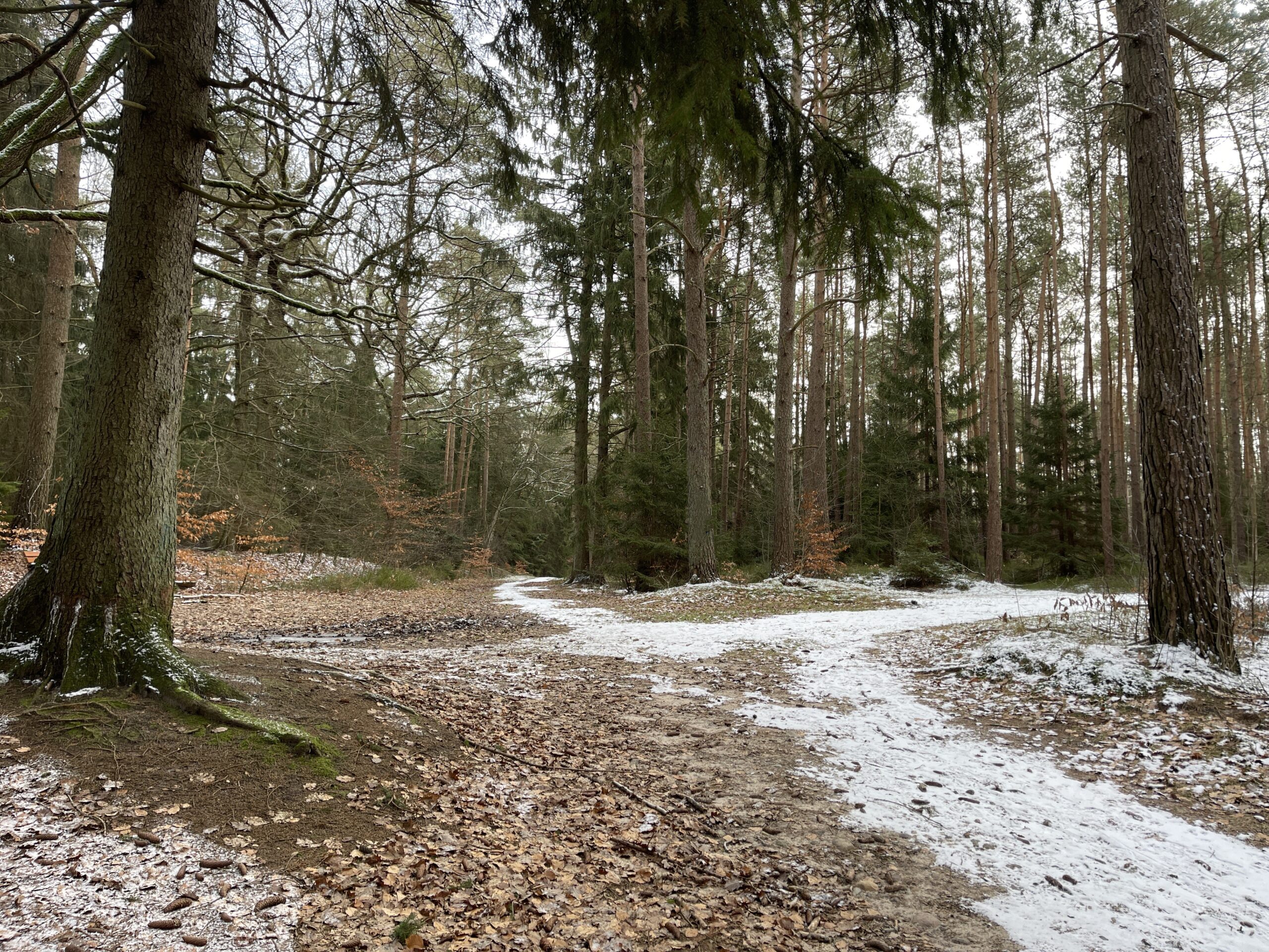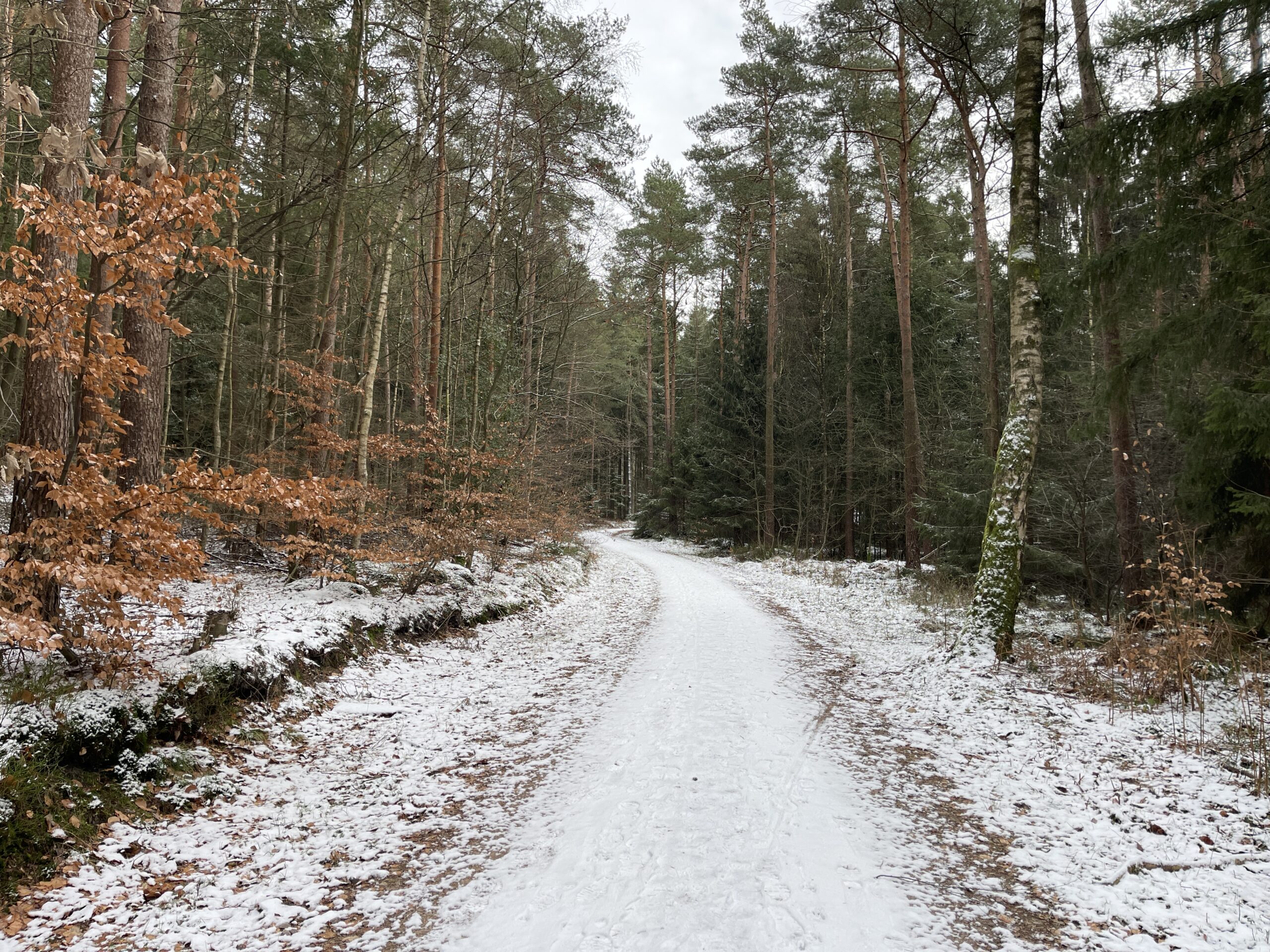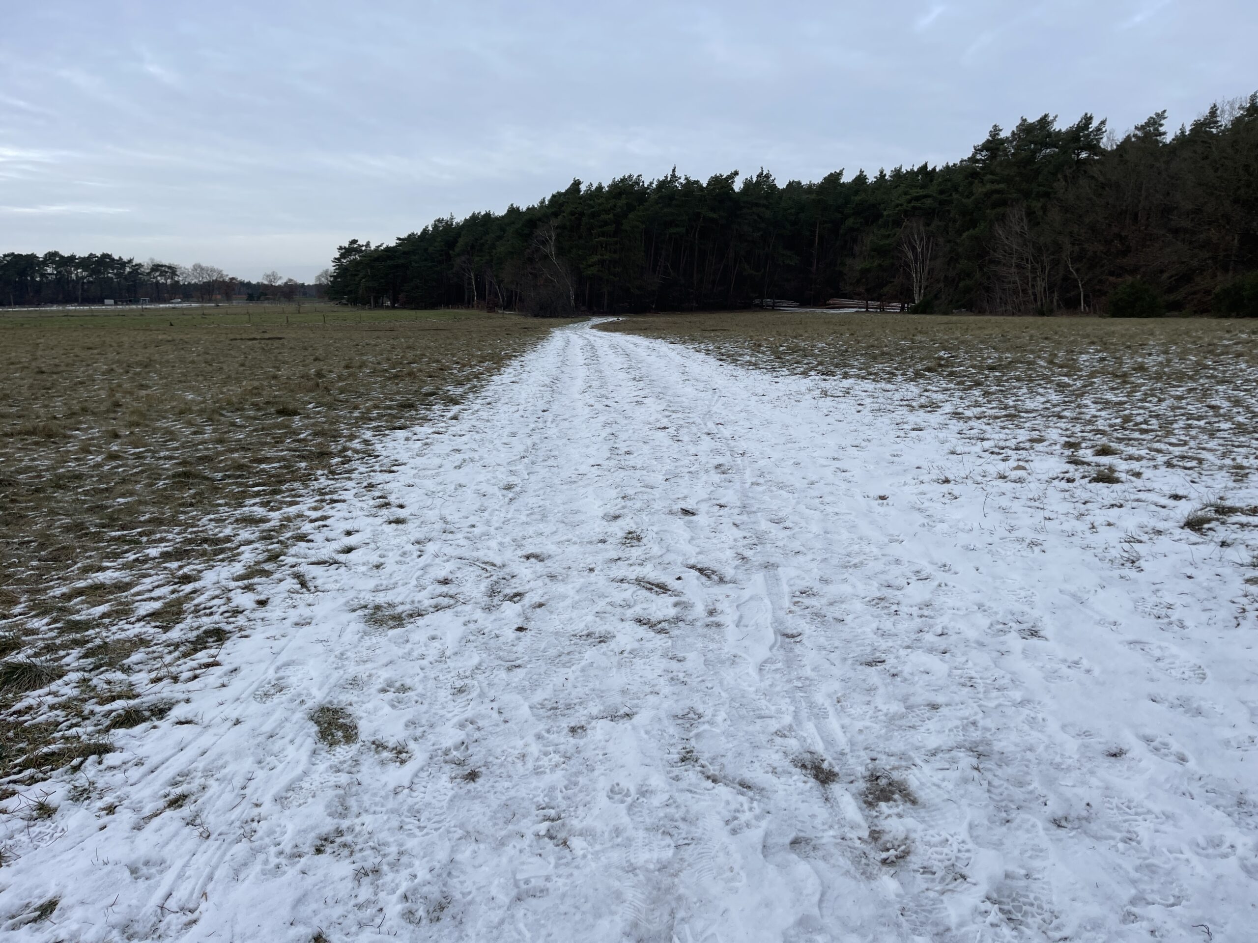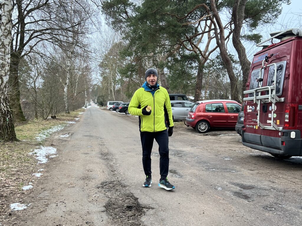 Selfie von Michael und Didi – allein im dunklen Wald (Buchwedel)„Gebe hiermit gehorsam meine Laufzeit an!“ Michael wollte am nächsten Mitwoch (24.01.2024) wieder dabei sein. Didi und ich freuen uns!Martin war trotz eisigen Windes fröhlich und leichtfüßig unterwegs. Er kommt immer wieder gerne zu uns.Der Buchwedeler Dauerteilnehmer Jakob war mit guter Laune bereit zu starten. Dirk war das zweite Mal dabei und startete im winterlich passenden Outfit und mit einem Stück Apfel in der Hand.Etwas bahnte sich hier an. Diese Wolken sprachen ihre eigene Sprache, …… die Sonne traute sich nicht wirklich raus aus ihrem Versteck und das hatte Folgen. Es wehte ein eisiger Wind und die Straße war spiegelglatt. Auf dem Waldboden lag eine dünne Schicht festgetretener Schnee und bedeutete etwas weniger Rutschgefahr für Läufer und Spaziergänger.„Schneewittchen“ lässt ihr blondes Haar vom Wind durchpusten.Die Beschaffenheit des Waldbodens an dieser Stelle schöpfte Hoffnung, dass es dann im Wald nicht unbedingt zu glatt sein musste.Wojciech lief heute einen Sub 6-Stunden Marathon. Hier beendete er seine dritte Runde.Freies Feld mit festgetretenem Schnee, der leicht gefroren zu sein schien, bedeutete Vorsicht, es könnte glatt sein.Didi hatte sich eine bestimmte Hahnzeit als Ziel gesetzt. Die Buchwedeler Winterlandschaft wirkte etwas langweilig, da … … kaum Schnee …… auf dem Waldboden lag und ohne die Sonne eine triste Stimmung vermittelte.. So, jetzt ging es für Wojciech nach der Stärkung in die vierte und letzte Runde.Das ist der Knotenpunkt, wo verschiedene, von Didi ausgesuchte und vermessene Laufstrecken im Buchwedel zusammentreffen. – Von unten kommend geht es rechts ab weiter auf der Höhenrunde. – Bei der Langen Runde kommt man von links und läuft weiter geradeaus auf der Strecke der Höhenrunde. Die Mittlere Runde verläuft ebenso wie die Lange Runde von links und dann aber rechts ab entgegengesetzt zur Höhenrunde.Martin hatte sich auf das Laufen im Buchwedel gefreut. Er war froh, dass der Boden streckenweise nicht glatt war und er somit das Lauftempo hier und da beschleunigen konnte.Auch Kai genoss die sehr abwechslungsreiche Strecke der Höhenrunde. Didi freute sich, dass er mit Lauffreunden im Buchwedel unterwegs sein konnte. Martin war nach einer Erkältung mit seiner heutigen Laufleistung mehr als zufrieden. „Ich bin 10 Minuten schneller als letztes Mal gewesen!“ Kai war diesmal ebenfalls schneller als letztes Mal unterwegs.Didi entschied sich, seinen 1476. Zähler im Laufschritt zu finishen.Jakob schwebte in Richtung Tagessieg! Glückwunsch, Jakob!Ihre letzte Runde beendeten Wojciech und Dirk gemeinsam.