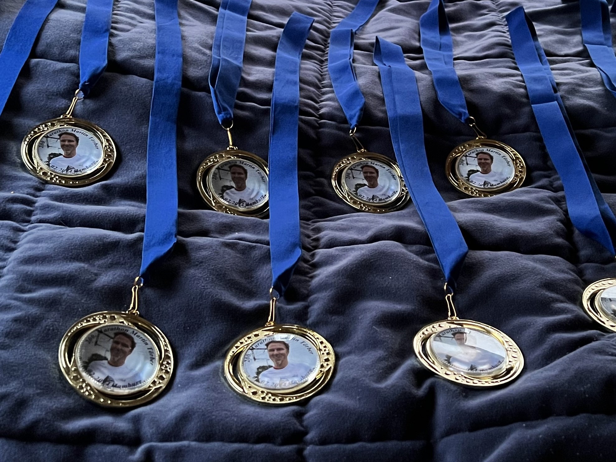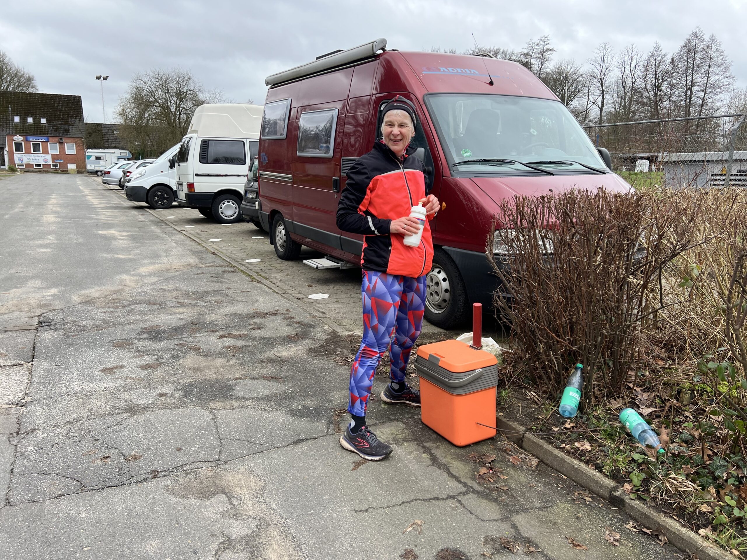 Mit der Stirnlampe begab sich Didi um 07:00 Uhr auf den etwas mehr als 7 Kilometer langen Rundkurs, der für eine Marathondistanz 6 Mal zu durchlaufen war.Karsten hatte wohl noch nicht gefrühstückt und freute sich nach seiner Ankunft mit dem Fahrrad auf sein Franzbrötchen. Guten Appetit, Karsten! – Im Hintergrund überlegte Alexander, ob er sein Auto mit Verpflegung nicht doch näher zum Start- und Zielbereich umparken sollte, um nicht zu viele Meter extra laufen zu müssen.Inka hatte wieder einen sehr leckeren Kuchen gebacken, der zur Feier des Tages mit Pfeifenreinigern sehr kreativ dekoriert war. Du hast immer so tolle Ideen, Inka!Didi wurde nach sener ersten Runde mit Früchtetee aus dem WoMo versorgt und berichtete über die Wegbeschaffenheit der Strecke. Martin, Biggi, Thomas und Frank hörten aufmerksam zu. Der Rundkurs, … … den die Teilnehmer mental verinnerlichen mussten . Erste Reihe v.l.: Veranstalter Stephan, Biggi und der Jubilar Martin T. – Zweite Reihe v.l.: Mitveranstalterin Inka, Celina, Cornelia, Burkhard, Jakob, Alexander, Roland und Karsten – Letzte Reihe: Martin K. und Frank (nicht zu übersehen!)Stephan gab die letzten Instruktionen zur Strecke. Keine Fragen? Dann …… wurden die Uhren gestellt und …… das Läuferfeld setzte sich in Bewegung.Martin, Frank und Roland ließen ihrer guten Laune freien Lauf!Jeder Finisher sollte anschließend mit einer Medaille belohnt werden. Danke, Stephan! Die Idee war super!Ich passte wieder in meine 100 MC Jacke, die ich rechtzeitig zu diesem Jubiläum beim Schneider hatte erweitern lassen! Sieht doch gut aus, oder?Alexander im neonfarbigen Outfit war in den ersten beiden Runden bei der Eskorte um Martin T. dabei und gab das Tempo an. Martin T. wurde von Celina, Karsten, (verdeckt), Inka und Stephan von Beginn bis zum Ende begleitet. Im Hintergrund hatte Cornelia die Eskorte voll im Blick.Die Batterie von Eriks Autoschlüssel war leer und musste ausgewechselt werden. Dann war die Welt in Ordnung und Erik konnte mit seinem Auto zum Start fahren. Die Kollau ist ein knapp 8 Kilometer langer Bach im Norden Hamburgs. Er entspringt im Stadtteil Schnelsen, durfließt Niendorf und Lokstedt und mündet an der Grenze zu Groß Borstel in die Tarpenbek. Über die ganze Strecke …… läuft der Kollauwanderweg neben dem Bach entlang. Thomas und Jakob genossen den Streckenverlauf entlang der Kollau.Frage: Welche Bedeutung hat diese Zahl? Antwort: Es sollte Didis 599. verschiedenste Strecke werden.Cornelia musste wie …… Didi eine weitere Runde unter die Füße nehmen.Der Dauerregen der letzten Wochen hatte seine Visitenkarte hinterlassen. Roland und Frank hatten sich inzwischen von Martin K. „getrennt“ und liefen ein recht schnelles Tempo. Später verschaffte sich Roland einen Vorsprung und erreichte vor Frank den 4. Platz.Dieser befestigter Sandweg führte die Läufer am Zaun des Niendorfer Wildgeheges entlang. Natur pur findet man im Niendorfer Gehege. Hier können inmitten des Waldes frelebende Tiere beobachtet werden. Im Damwildgehege sind neben Hirschen und Rehen auch Hasen und Füchse zu sehen, wenn man Glück hat.Burkhard hatte Lust auf eine weitere Runde, stärkte sich aber erst an dem …… von Martins Ehehfrau Solveig aufgebauten Verpflegungsstisch.Am Auto der Törberfamily wurde die Zahl 200 festgeklemmt. Aber die zusammengesetzen Buchstaben wollten sich nicht zum „HERZLICHEN GLÜCKWUNSCH“ finden. Erik war unglaublich schnell und holte sich den Tagessieg. Glückwunsch, Erik!Didi hatte Spaß am Fotografieren, besonders, wenn …… Martin K. , …… Stephan, der Jubilar Martin T. , …… Burkhard, Karsten und Celina ihm vor die Linsen kamen.Martin T., Celina und Inka hatten sich einiges zu erzählen. Im Hintergrund versuchten Karsten, Burkhard und Stephan sie einzuholen, aber es war ihnen, …… nicht gelungen, trotz einer veränderten Position, Didi als Paparazzi zu entkommen.Der Text erinnert an die Hymne des FC Liverpool „You´ll never walk alone!“, gesungen von Gerry and the Pacemakers. Mit diesem Text wird versucht, die Allgemeinheit aufzufordern, den Müll zu minimieren! Clever!Jakob und Thomas liefen gemeinsam ins Ziel und durften …… von mir die wohl verdiente Medaille umgehängt bekommen.Biggi war noch nicht fertig, stärkte sich an ihrer Verpflegung und stellte ihre Ausdauer unter Beweis! Das sollte ihr zweiter „Doppeldecker“ werden!Die beiden Törberbrothers Lasse (links) und Mats hielten zwischenzeitlich die Stellung, während Mutter Solveig sich die Beine vertrat. Martin K. lief energisch die letzten Kilometer in Richtung Ziel, um seine Medaille in Empfang zu nehmen.Die Eskorte des Jubilars hatte Didi eingeholt und plante einen gemeinsamen Zieleinlauf. Kurz vor dem Ziel gab Didi unerwartet Gas, um in großen Schritten den Marathon mit seiner gewünschten Hahnzeit finishen zu können. Der Jubilar amüsierte sich köstlich.Bei der Ehrung wurde die Eskorte mit einer Medaille belohnt. Martin T. bekam vom Veranstalter Stephan einen Pokal. Von Didi und mir bekam Martin T. als Erinnerung die Zahl 200. Karsten, Burkhard, Stephan und Celina waren gerührt. Für das Finisherfoto stellte sich Inka dazu. Die Medaille der Läufer und die Geschenke des Jubilars verrieten die aufgeheiterte Stimmung dieser Veranstaltung. Aber … … das Feiern ging ja noch weiter. Solweig sorgte dafür, dass keiner an der Verpflegung zu kurz kommen musste. Martin T. war zufrieden und Burkhard freute sich mit ihm. Celina überlegte, ob sie bei dem reichlichen Verpflegungsangebot heute Abend kochen sollte. Die Teilnehmer der Eskorte und der Jubilar warteten auf … … Cornelia, die mit einer Laola-Welle im Ziel begrüßt wurde! Didi nutzte die Wartezeit, um zur Feier des Tages die Clubjacke anzuziehen.