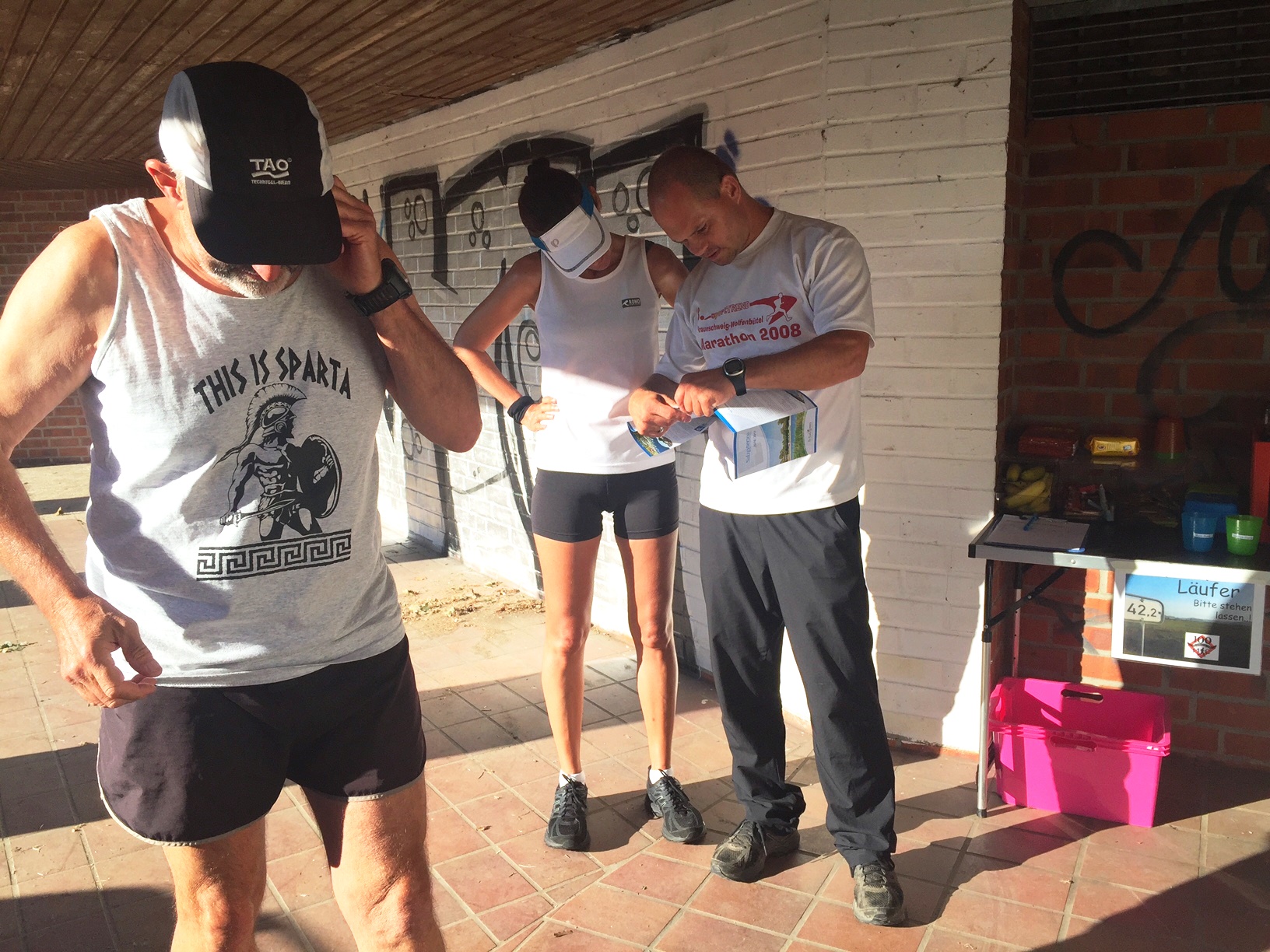 An der Verpflegungsstelle erwartete uns Marc sehnsüchtig. Da Sylke die Strecke noch nicht kannte, folgte für sie ein kurzes Briefing. Marc erklärte ihr die wichtigsten Details und erzählte uns, dass der Start sich vielleicht um einige Minuten verzögern könnte, da Alois und Jens sich durch den einen oder anderen Stau kämpfen mussten und deshalb vielleicht nicht ganz pünktlich ankommen würden.