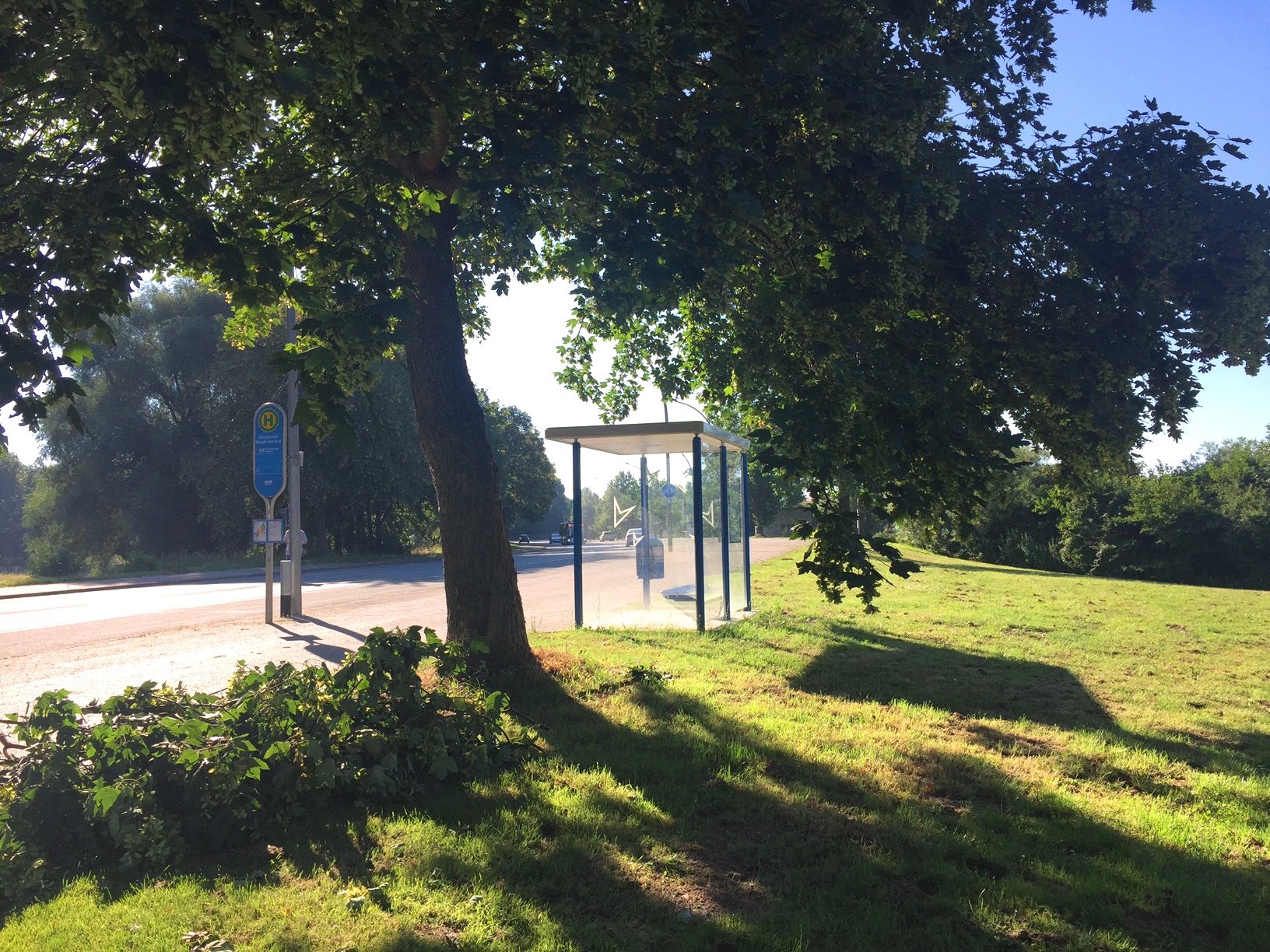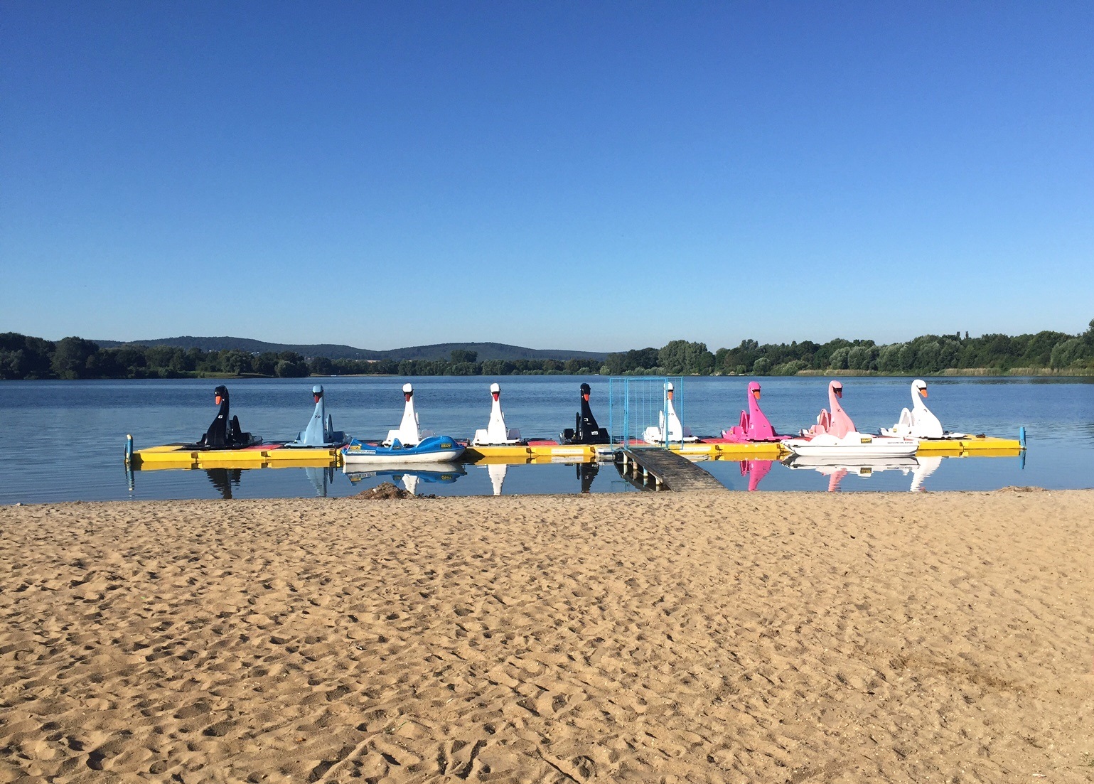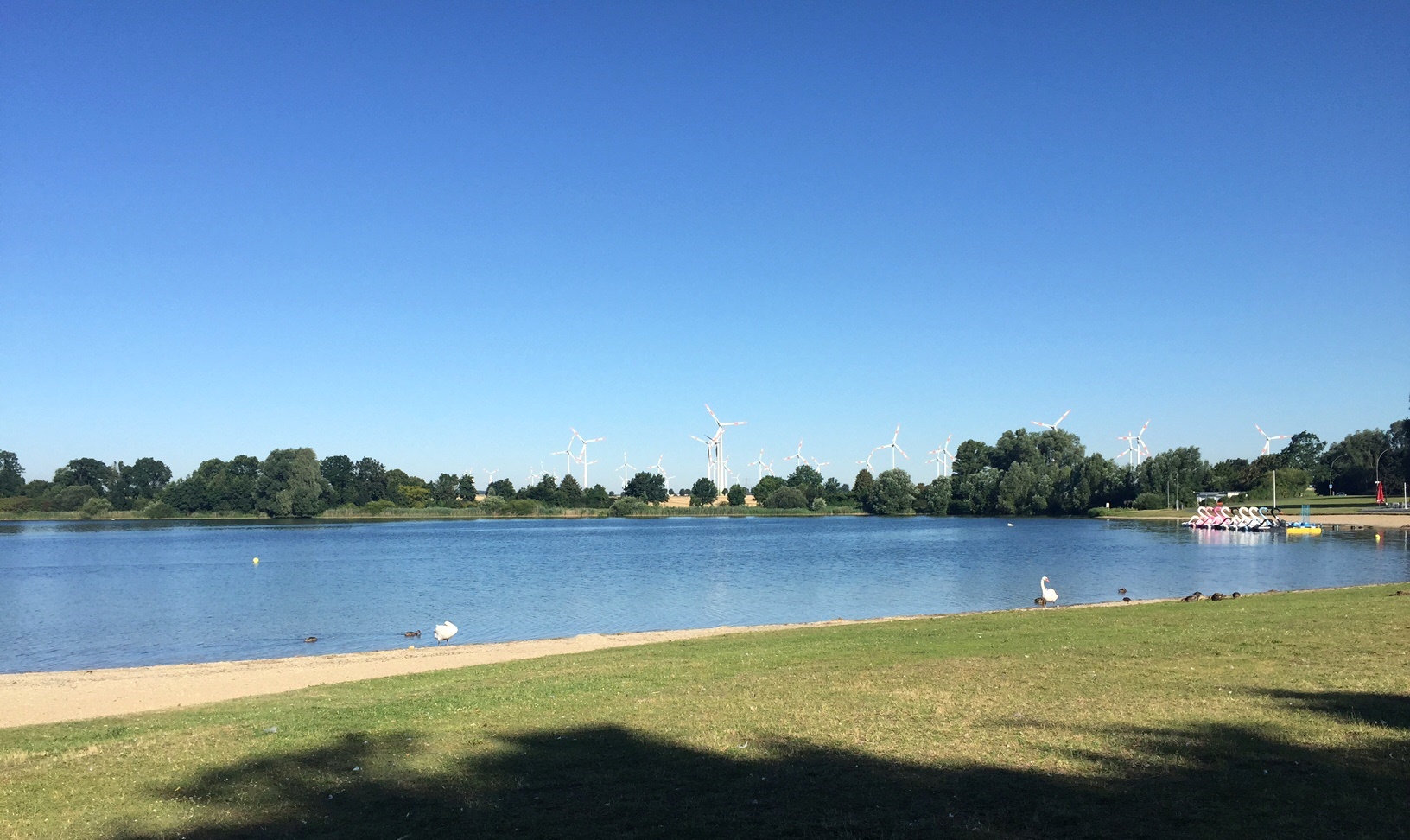 Mir fiel in der ersten Runde sofort auf, dass am Salzgittersee ein neues (und leider schattenfreies) Bushäuschen aufgestellt war Am See war alles ruhig. Diese übergroßen Schwäne warteten auf die Menschen, die sie in Bewegung setzen sollten. Noch war jedoch keiner zu sehen. Es herrschte jetzt schon eine Hitze, die kaum auszuhalten war. Die Uhr zeigte 8:29! Der Strand war menschenleer.