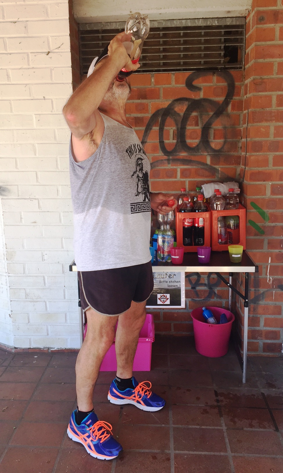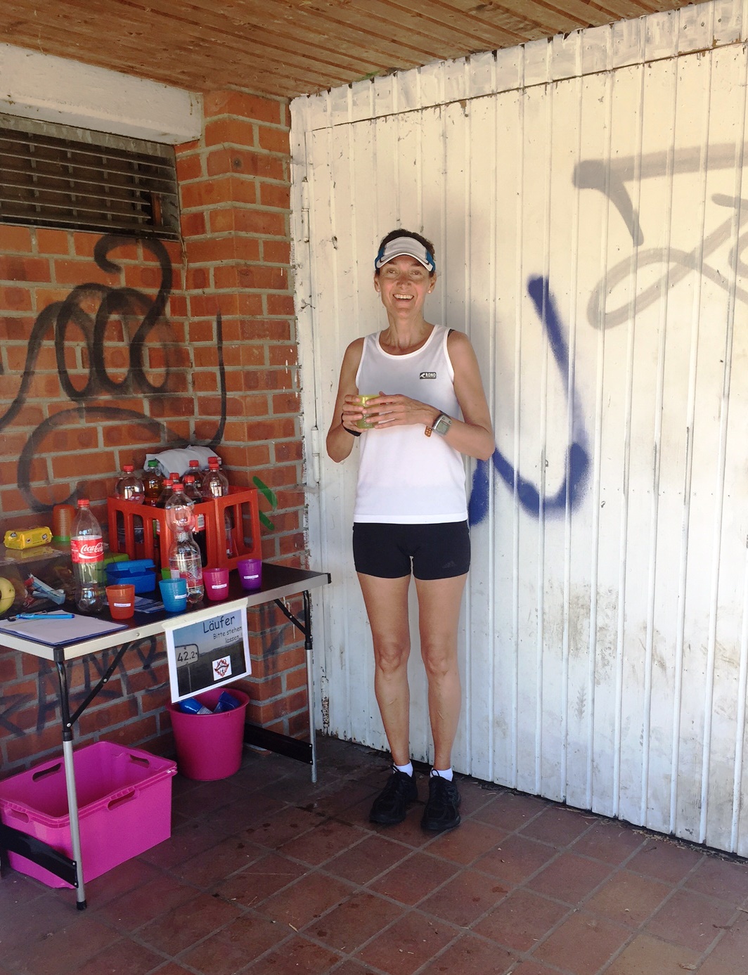 Kurz nach 9:00 Uhr erreichte ich die Verpflegungsstelle. Ich war froh, bei dieser Hitze eine Pause machen zu dürfen. Es ging den anderen Läufern wohl auch so. Im Schatten ein kühles Getränk zu sich zu nehmen, das tat gut!