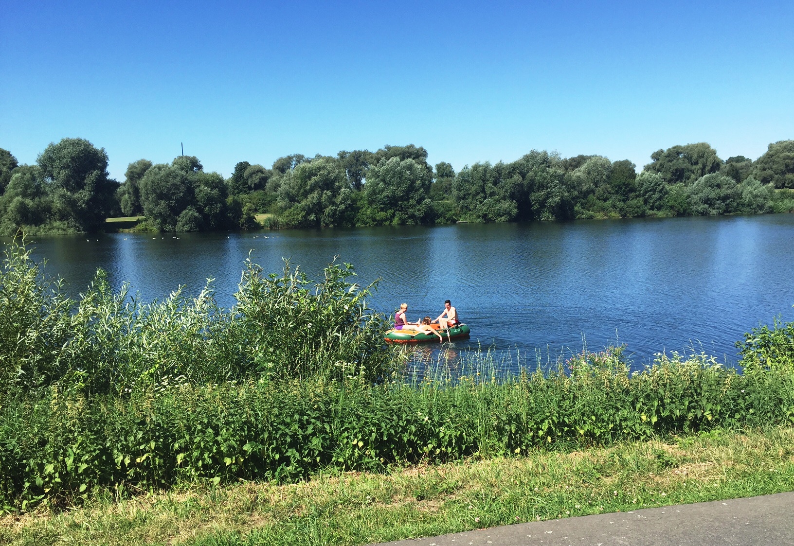 Bei diesem Anblick musste ich schmunzeln. Offensichtlich hatte der Ruderer leichte Probleme, das Schlauchboot in die richtige Fahrtrichtung zu bekommen. Die Insassen freuten sich und genossen den Aufenthalt auf dem See in einem “knallgrünen Schlauchboot“.