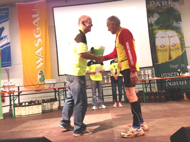 Bernhard war der Erste, der mir gratulierte. Aber besonders geehrt fühlte ich mich, als Gerd Papcke aufstand, zu mir kam und mir gratulierte. Er wurde bei der Siegerehrung besonders geehrt. Mit 80 Jahren war er der älteste Teilnehmer. Er ist ein besonderer Mensch. Ich erlebe ihn bei den Läufen nur fröhlich und gelassen. Er läuft, weil er gesund und fit bleiben möchte und nicht um irgendwelche Bestzeiten zu „knacken“. Bleibe dem Club lange erhalten, lieber Gerd!
