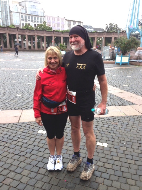 Pünktlich zum Start setzte ein leichter Nieselregen ein. Ich war mir sicher, dass ich mich richtig angezogen hatte. Das „`runterzählen“ begann und es dauerte nur wenige Sekunden bis zum Start. Zunächst ging es ziemlich bergab. So macht Laufen Spaß! Dann allerdings musste ich richtig „ackern“. Gerd holte mich dann ein, lief vor und wurde immer kleiner, bis er am Horizont ganz verschwand! Bald wurden mir die etwa 600 Höhenmeter bewusst. Trotzdem fühlte ich mich gut und hatte keine Probleme mit der Einteilung meiner Kräfte. Es hat richtig Spaß gemacht wieder eine bergige Strecke zu laufen! Zwischendurch setzte die Garminuhr aus, kriegte sich wieder ein und zeigte dann wieder die richtige Zeit an.