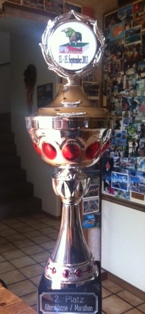 Der Pokal für den 2. Platz meiner Altersklasse durfte natürlich nicht fehlen! Der aufmerksame Gerd fragte, warum mein Pokal anders aussah, als sein Pokal. Mein Pokal besaß nämlich Perlen. Bernhard hatte die richtige Antwort: „Na, das ist doch klar! Sie ist doch eine Frau!“