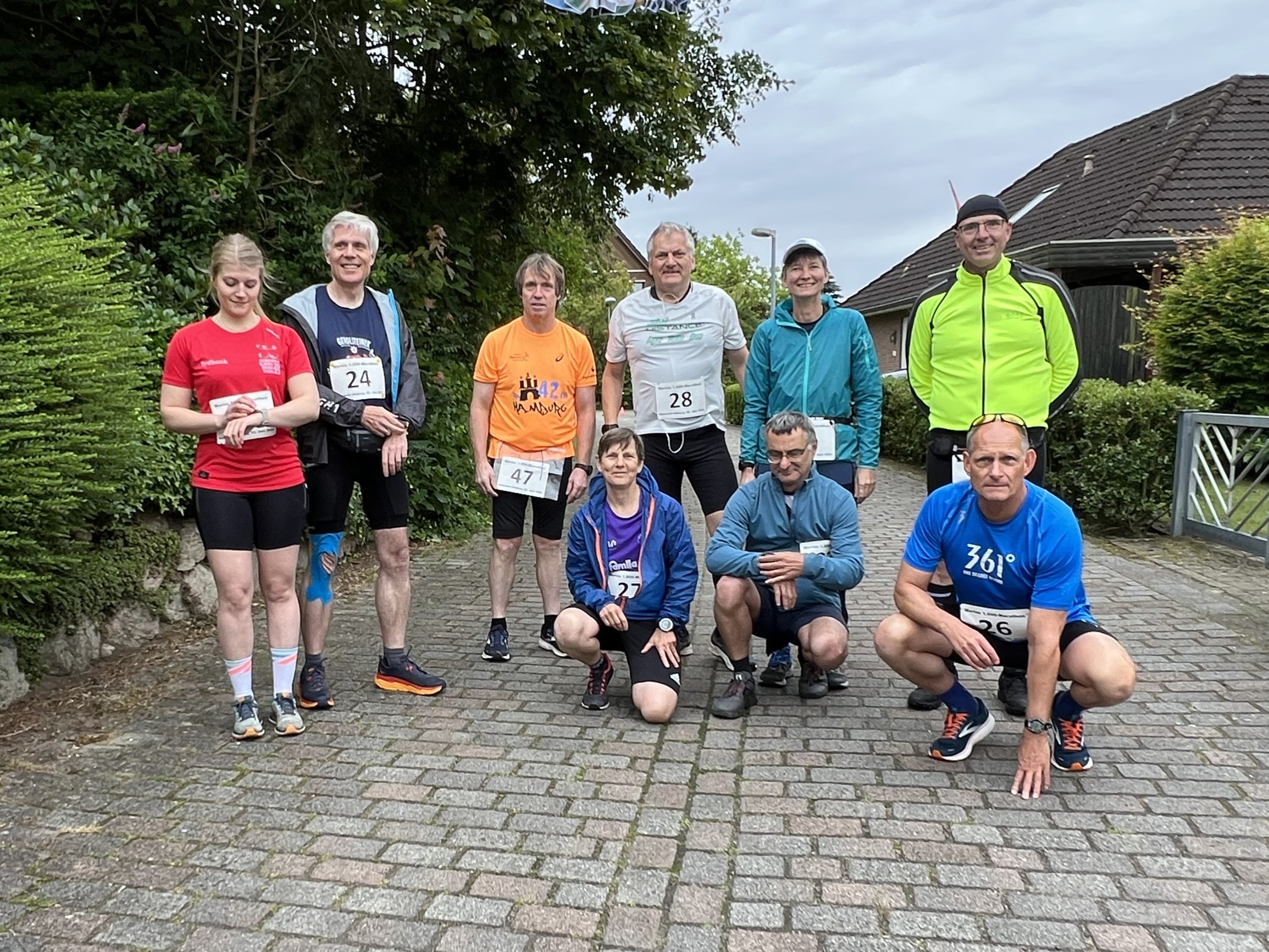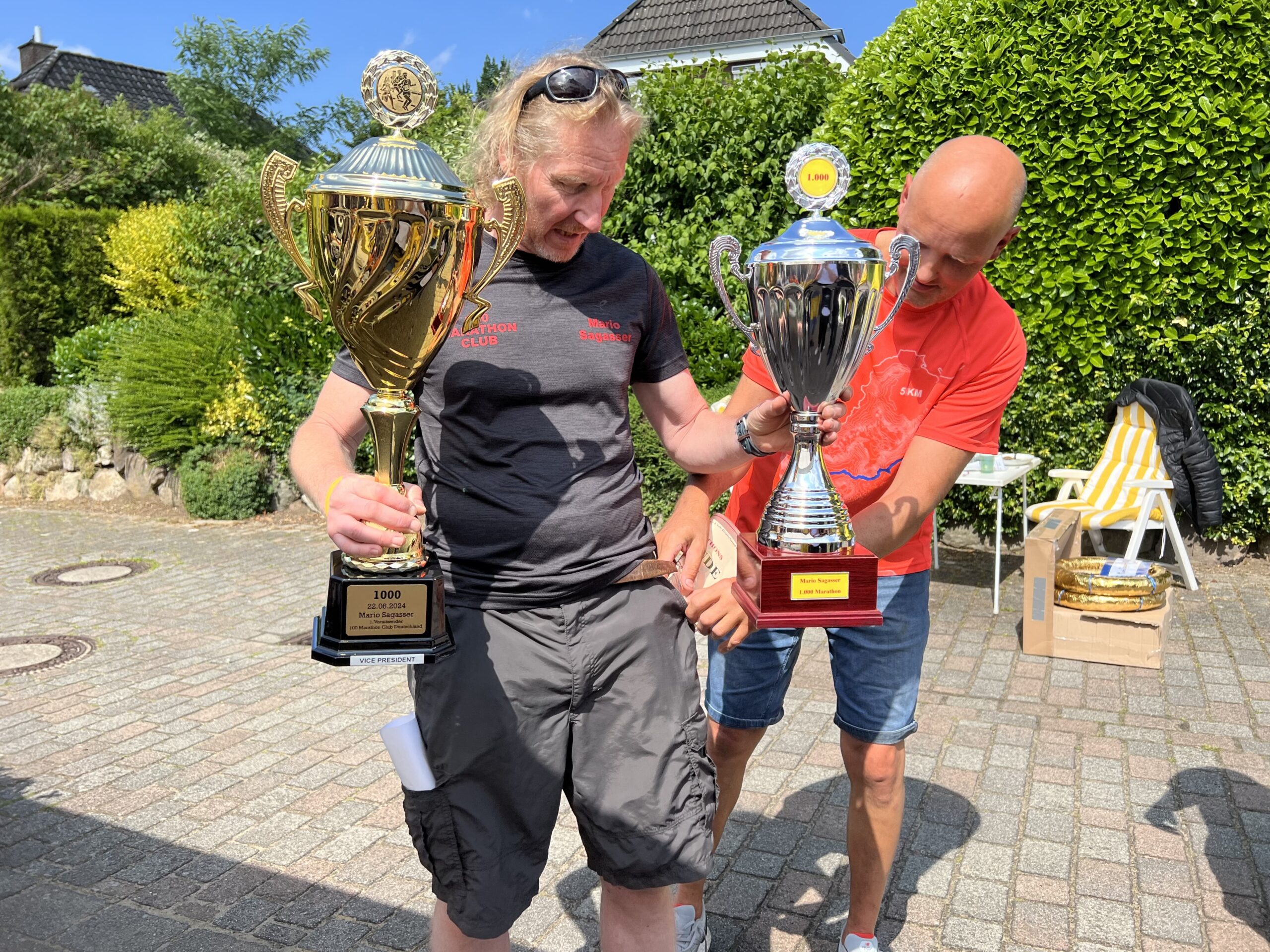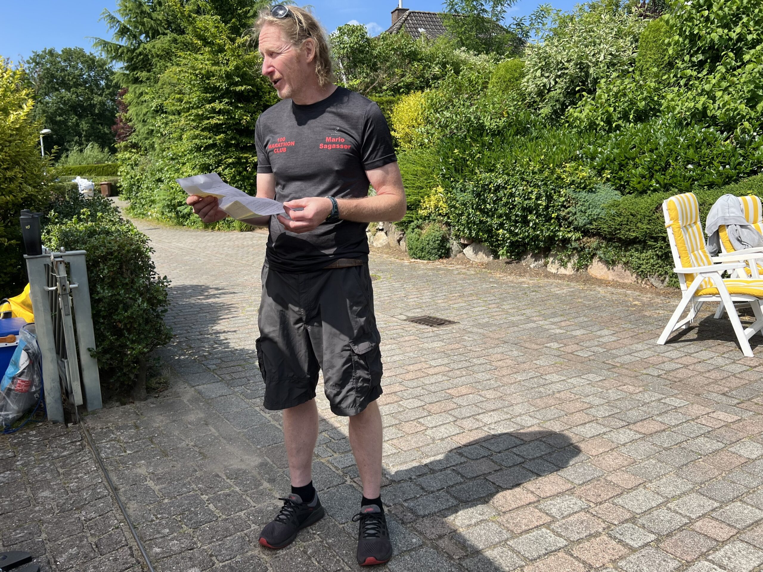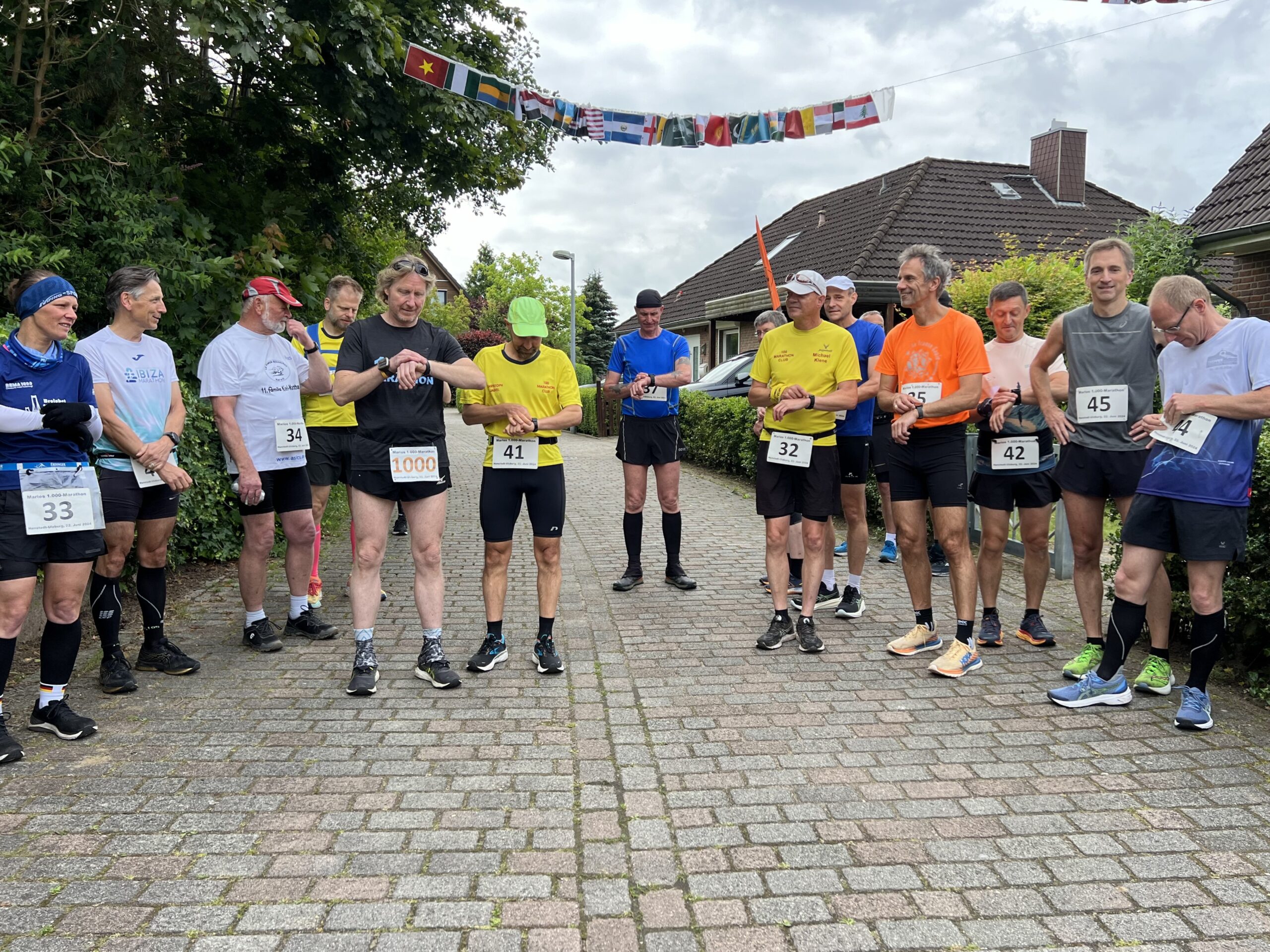 … lief Mario auf seiner Hausstrecke in Henstedt-Ulzburg seinen 1000. M/U. Die 1,5 Kilometer lange Strecke war 28x zu bewältigen. Etwa 40 Läuferinnen und Läufer kamen an diesem sonnigen Tag nach Schleswig-Holstein, um mit Mario seinen großen Tag zu feiern. Didi und ich waren mit dem WoMo am Vortag angereist, um uns einen WoMo-Platz in der Nähe des Wohnhauses der Familie Sagasser zu sichern. Gaby, Achim und Jessica waren ebenfalls am Vortag angekommen. Die Übernachtungsgäste wurden mit Pizza und Getränken versorgt.