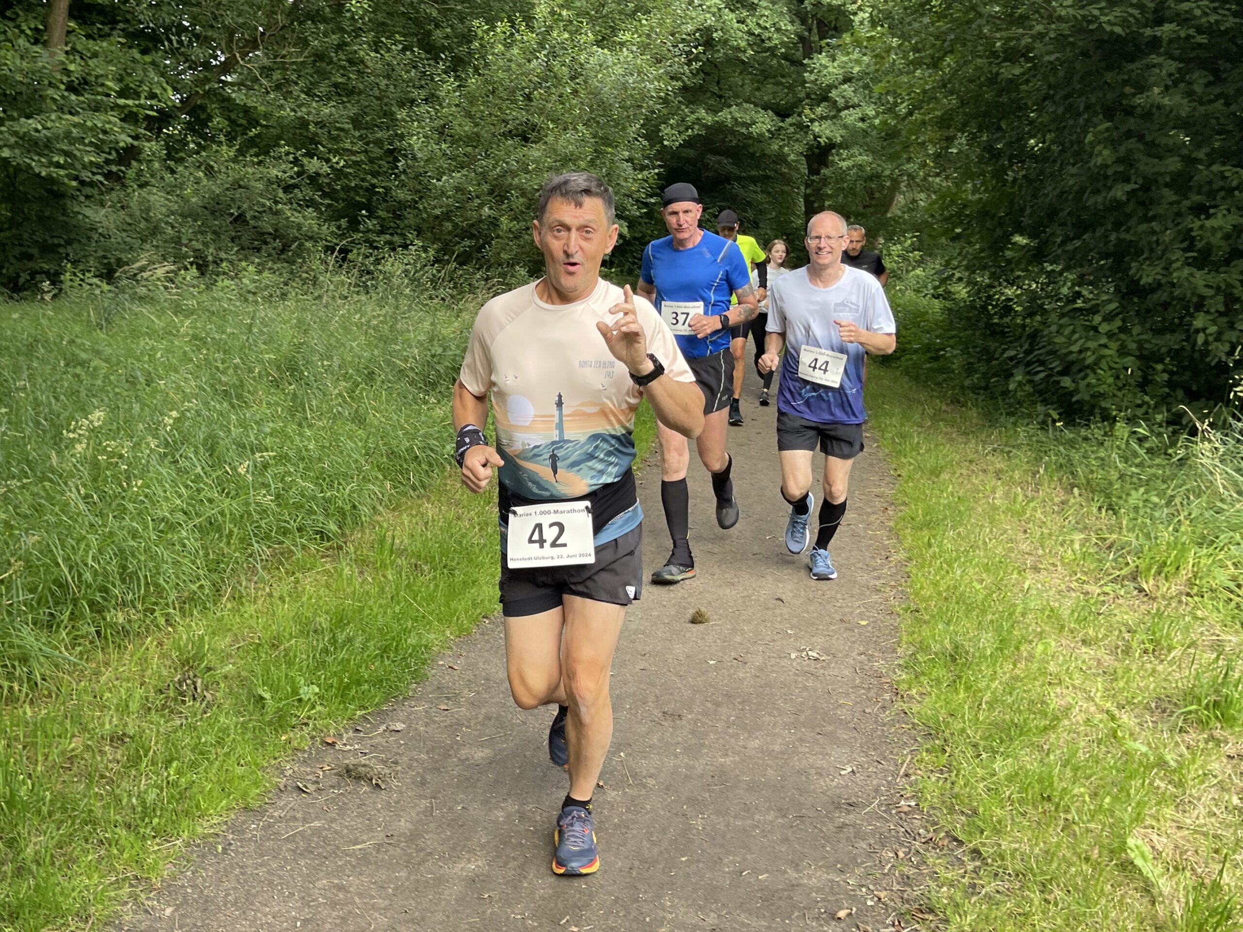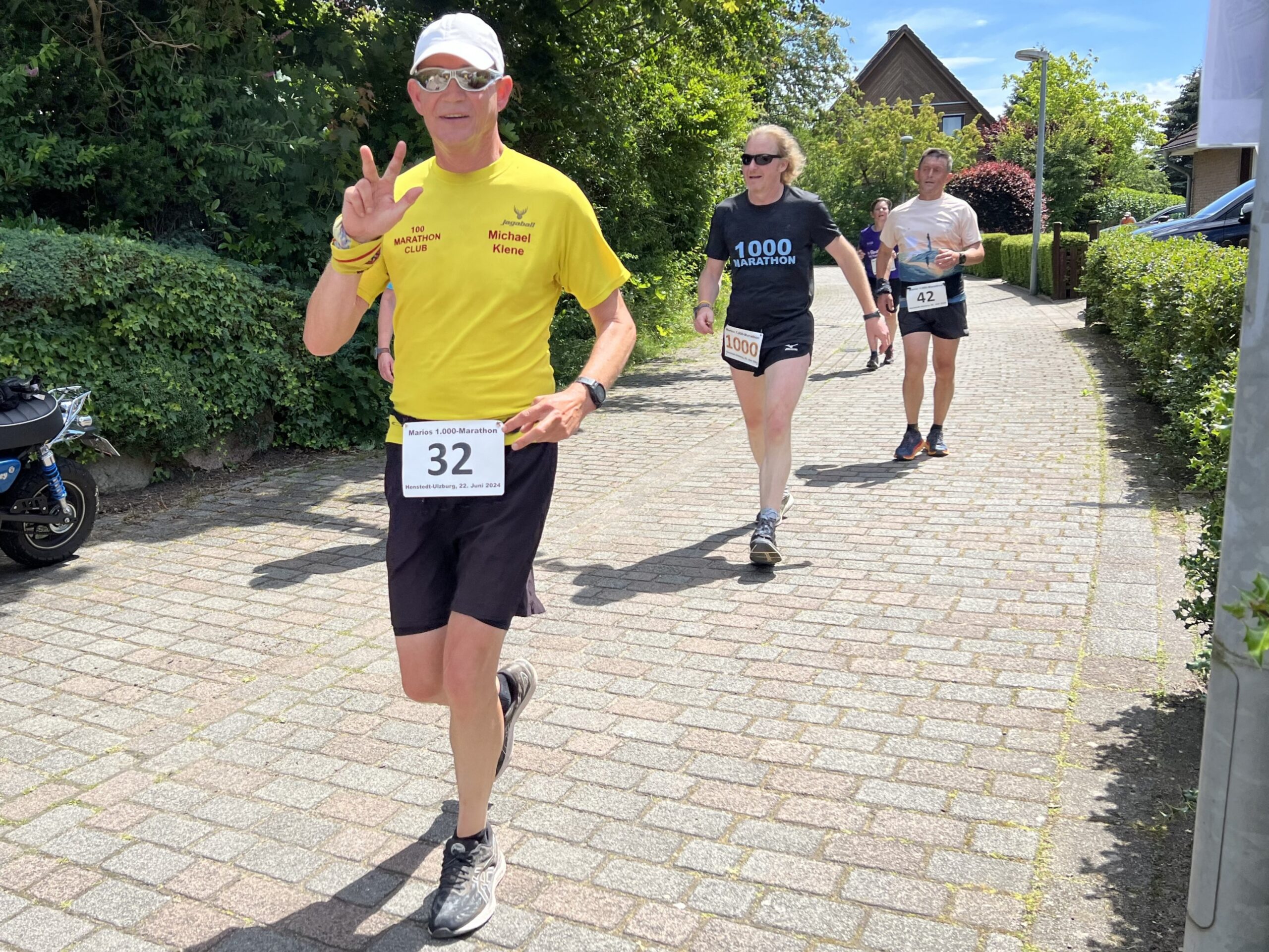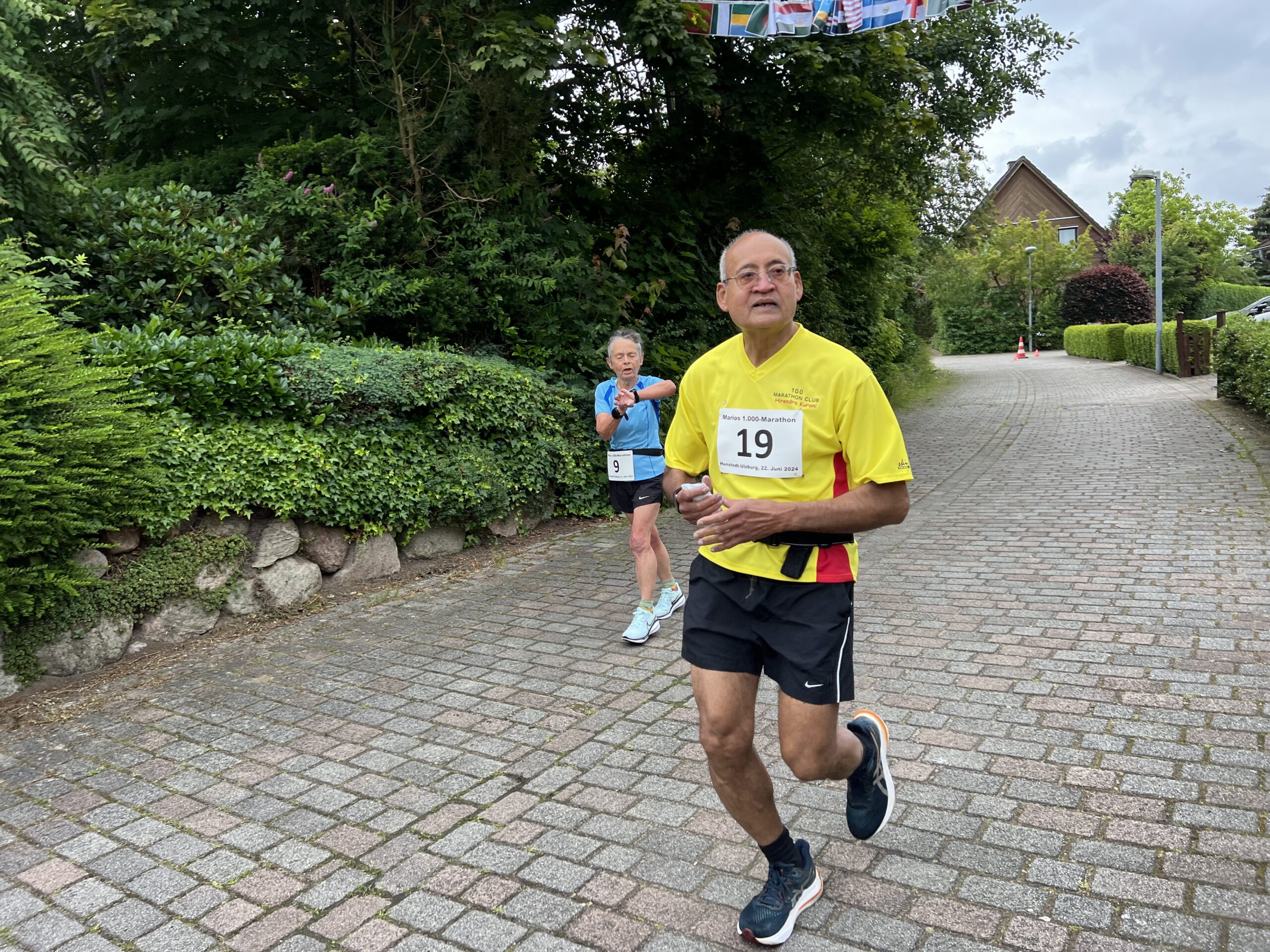 Mario entwickelte zusammen mit Doris eine Leidenschaft für Reisen und das Sammeln von Marathons in Ländern auf der ganzen Welt. – Als Doris und Mario 30 Länderpunkte erreicht hatten, traten sie dem Country Club bei und sammelten fleißig weitere Länderpunkte. Sigrid (Ehren- und Gründungsmitglied des 100MC) hat 41, Doris inzwischen 96, Mario 100 und Didi 42 Länderpunkte gesammelt.Die teilnehmenden Läuferinnen und Läufer hatten die Möglichkeit um 7:00 Uhr, um 8:00 Uhr oder um 9:00 Uhr zu starten. Der frühe Vogel fängt den Wurm, sagten sich die 7 Uhr Starterinnen und Starter, als sie von Mario auf die Strecke geschickt wurden.Rosi, Hiren, …… Sigrid, Christine, Davor, Cornelia (von Christine verdeckt), wie auch Christian und Hajo hatten hier die erste Runde geschafft.Davor und Cornelia gut gelaunt im Gleichschritt unterwegsHajo war froh, um 7:00 Uhr gestartet zu sein, wie auch …… Didi.Regine, Kirsten, Gaby und Anna-Lena hatten ein flottes Tempo drauf. Im Hintergrund: Hajo Caro und ihr Ehemann Steven besetzten das Wettkampfbüro, während ich auf die Aufstellung des nächsten Starterblocks wartete. Ole und Christoph waren vertieft in ein Männergespräch.Fast alle 8:00 Uhr Starterinnen und Starter freuten sich, dass es bald losgehen sollte. Gerd kann super schnell marschieren. Inzwischen war es ziemlich warm geworden und Doris H. zog es vor, ihre Jacke lieber in die Hand zu nehmen.Jaqueline mit Tempoläufer Arne – Im Hintergrund : HirenPascal und Doris hatten sich vernünftigerweise für den 7:00 Uhr Start entschieden. Es wurde im Laufe des Tages doch sehr warm.Stephan, Inka und Alexander genossen den Lauf in vollen Zügen.Mutter und Tochter Eisele liefen im hurtigen Tempo.Ob Michael mit dem Selfie einverstanden war, ich weiß nicht! Jobst und ich waren von dem Selfie jedenfalls begeistert!Für die Grande Dame wurde eine Gasse gebildet und … … dann konnten die 9:00 Uhr Starterinnen und Starter auf die Strecke geschickt werden.Jens-Peter und Ole mussten heute diese Brücke 28x überqueren!Christph und Volker konnten bei dem Tempo sogar lachen!Mario, Michael K. und Jobst kennen sich schon lange und haben einige Marathonläufe zusammen bestritten.Mukir lief genau so leichtfüßig wie Jörg und Karsten. Auch Martina und Micha liefen 28x über diese Brücke!Caro und Steven zeigten sich sehr entspannt im Wettkampfbüro. „Wir haben alles im Griff!“Die Runden der 1,5 Kilomter langen Strecke wurden gezählt und notiert. Mukir, Michael N. und Sven konnten sich voll darauf verlassen, dass im Wettkampfbüro korrekt gearbeitet wurde.Ehepaar Micha und Jana Bieler nahmen mit Martina eine neue Runde unter ihre Füße.Regine ist immer gut drauf …… und Torsten auch.Doris und Wojciech vor Ole und AffenzahnDie beiden schnellen Michaels (im Hintergrund) sollten bald Ole und Affenzahn einholen.Jörg und Karsten umgeben von grünen Bäumen und PflanzenMicha, Jana (die Martina verdeckt) und Christoph liefen der Sonne entgegen. Jacqueline und Arne, der mit seiner Sonnenbrille etwas angeben wollteChristoph und Jessica am VerpflegungstandChristoph und Wojciech scherzten am Verpflegungsstand. Doris schien erleichtert zu sein, dass alles so gut lief.Marios Patenkind Pascal und seine Anna-Lena mit guter Laune Rosi musste heute ohne Cindy laufen. Volker hatte sehr schnell die Führung übernommen.Hier sind sie schon wieder!Arne ist immer für einen Scherz zu haben und setzt sich den Verkehrskegel auf den Kopf.Jörg, Karsten und Christian auf der Greifswalder Straße unterwegs – Doris kommt immer näher!Die Laufstrecke verlief ein kurzes Stück entlang der Pinnau, ein kleiner beschaulicher Fluss. – Die Pinnau entspringt in Henstedt-Ulzburg, fließt anfangs nach Süden, ab Pinneberg nach Westen und mündet irgendwann in die von Südosten heranfließende Elbe.Jessica und Anna-Lena hatten die Sonne im Rücken.Kirsten und Mutter Gaby stärkten sich am Verpflegungstand. Im Hintergrund sieht man das gut besetzte WettkampfbüroRita und Dieter freuten sich über ein bisschen Schatten.Die Greifswalder Straße war an diesem Tag sehr stark frequentiert.Ralf gehörte zu den 9:00 Uhr Startern.Regine suchte verzweifelt die passende Musik, um die mittlerweile steigenden Temperaturen ignorieren zu können.Erik und Inka hielten kurz am Verpflegungsstand an, um zu trinken. Christoph schaute auf seine Uhr und schien mit seinem Tempo zufrieden zu sein.„Sabine, kannst du mir sagen, warum ich meine Lieblingsmusik nicht finde?“Michael K., Mario und Mukir auf dem Weg in die letzte Runde„Ich habe fertig!“ Christoph war froh, im Ziel angekommen zu sein.Der 1. Marathon für Anna-Lena und Pascal – Glückwunsch an euch!Ralf, Michael und Mukir begleiteten Mario ins Ziel. Jana hielt Marios 1000. Zieleinlauf von hinten fotografisch fest.Im Ziel wurde Mario wie ein Superstar begrüßt! Glückwunsch, Mario zu dieser Leistung!Die 1000 hast du erreicht, Mario! Doris lief heute den 568. Lauf über mindestens 42,195 km. Herzlichen Glückwunsch! Zusammen mit Mario sind es 1568 Läufe über mindestens 42,195 km! Hut ab!Nach Marios Zieleinlauf gab es Gelegenheit zum Smalltalk untereinander. Die Siegerehrung mit Urkunde und PokalGerd gratulierte Mario und …… überreichte die Urkunde. Nach der Becker-Faust übergab Gerd Mario seinen wohlverdienten Pokal.Herzlichen Glückwunsch, Mario!Nach der offiziellen Siegerehrung überquerte Didi die Ziellinie und hatte damit den 1515. M/U und eine weitere Hahnzeit geschafft. Glückwunsch!Von Michael N. aus Dänemark bekam Mario einen goldenen Pokal. Mario war sichtlich erleichert und bedankte sich …… bei Doris, seinen Töchtern und seinen Laufreunden, ihn unterstützt zu haben. Jobst hielt eine Laudatio für Mario und lobte ihn für seine Leistungen und sein ehrenamtliches Engagement als 1. Vorsitzender des 100 Marathon Club.
