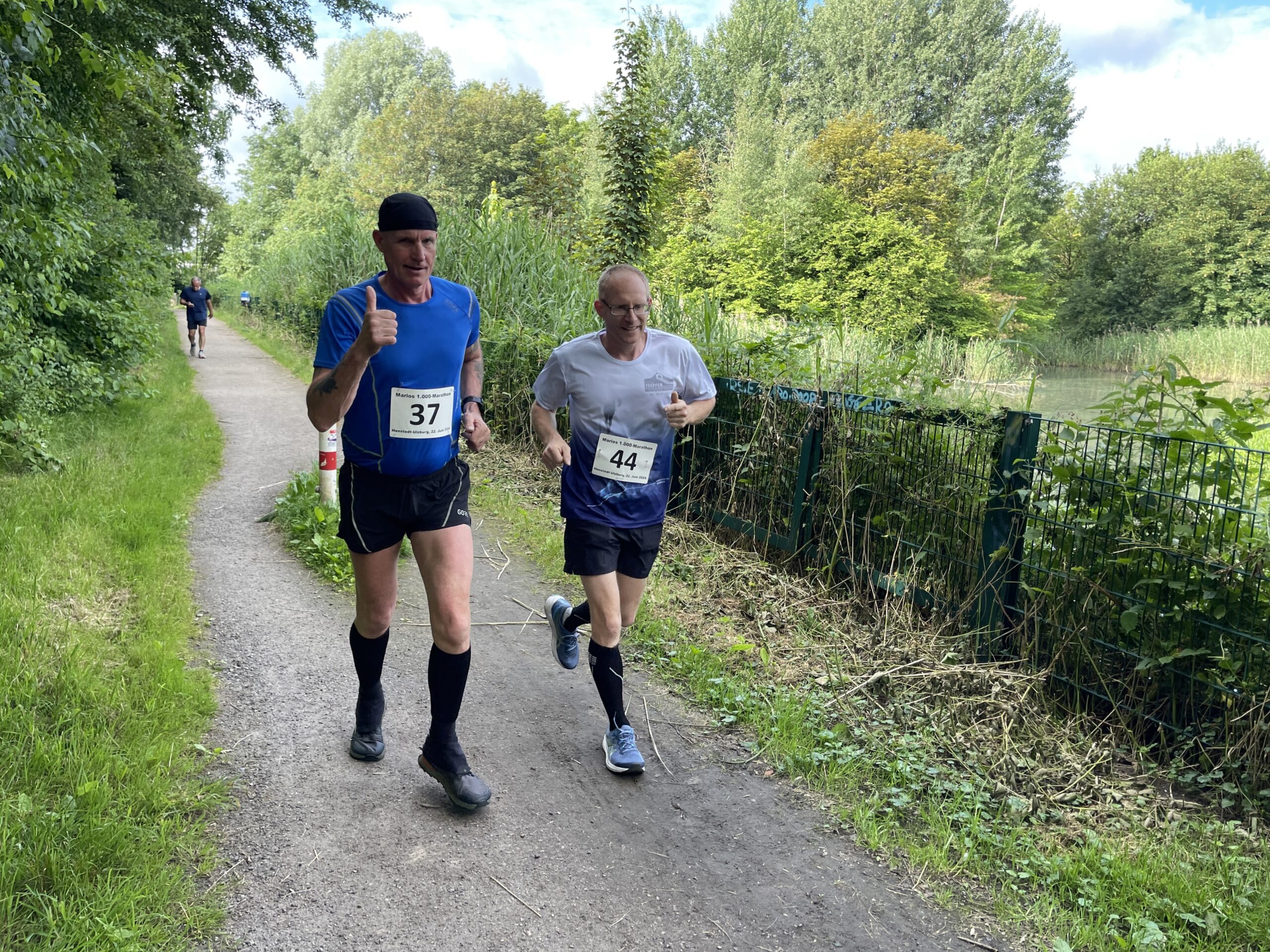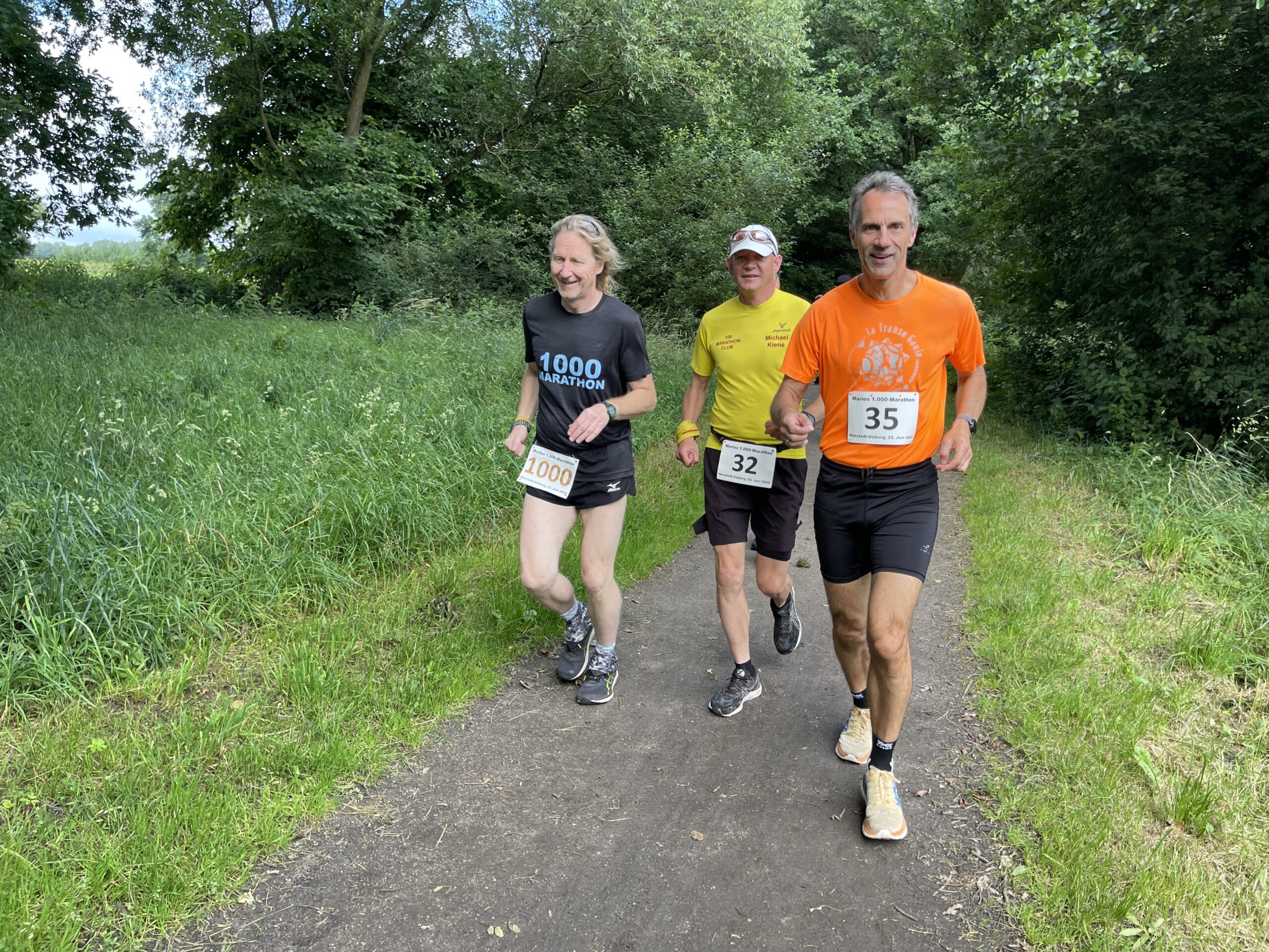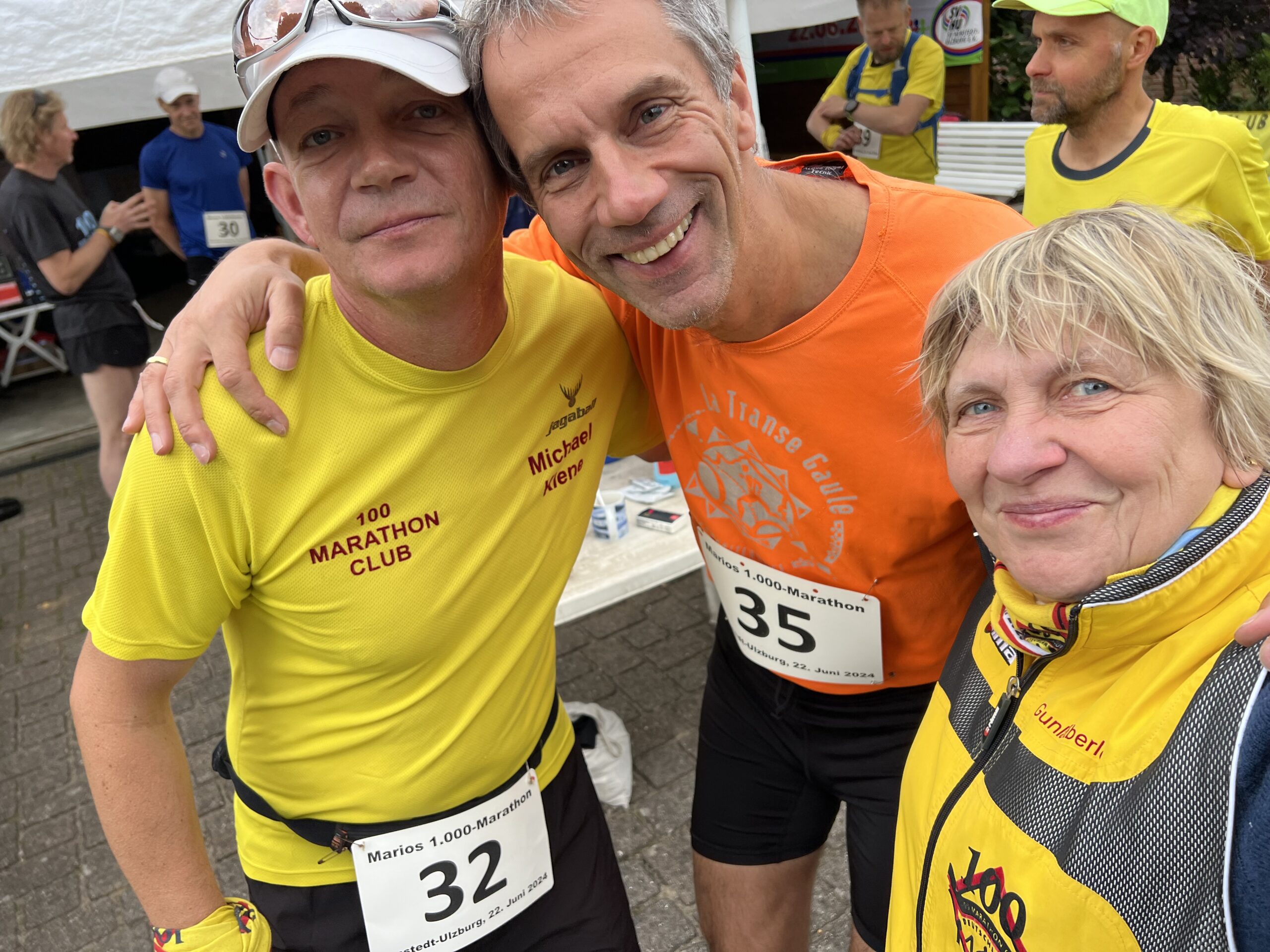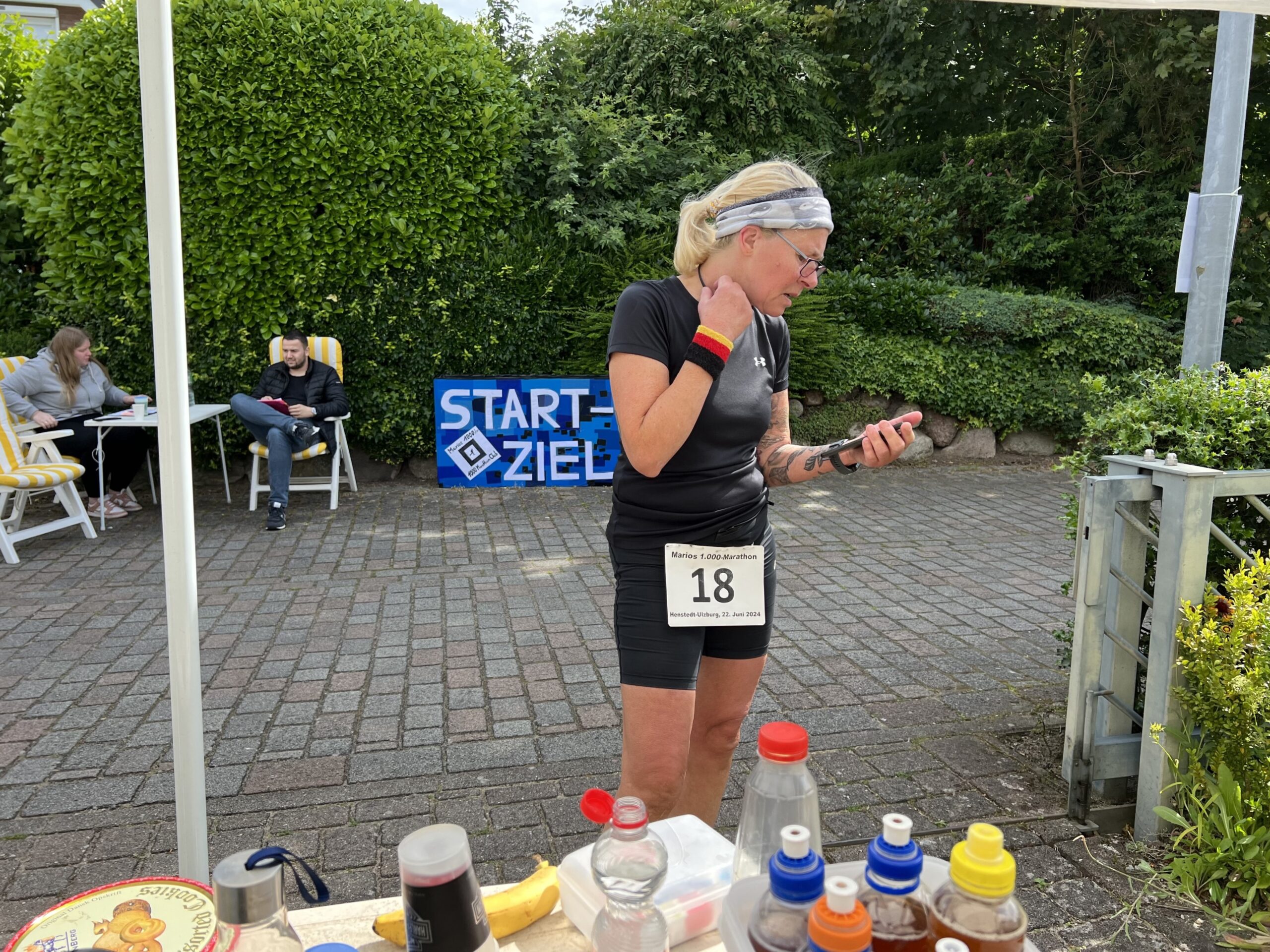Mario entwickelte zusammen mit Doris eine Leidenschaft für Reisen und das Sammeln von Marathons in Ländern auf der ganzen Welt. – Als Doris und Mario 30 Länderpunkte erreicht hatten, traten sie dem Country Club bei und sammelten fleißig weitere Länderpunkte. Sigrid (Ehren- und Gründungsmitglied des 100MC) hat 41, Doris inzwischen 96, Mario 100 und Didi 42 Länderpunkte gesammelt.Die teilnehmenden Läuferinnen und Läufer hatten die Möglichkeit um 7:00 Uhr, um 8:00 Uhr oder um 9:00 Uhr zu starten. Der frühe Vogel fängt den Wurm, sagten sich die 7 Uhr Starterinnen und Starter, als sie von Mario auf die Strecke geschickt wurden.Rosi, Hiren, …… Sigrid, Christine, Davor, Cornelia (von Christine verdeckt), wie auch Christian und Hajo hatten hier die erste Runde geschafft.Davor und Cornelia gut gelaunt im Gleichschritt unterwegsHajo war froh, um 7:00 Uhr gestartet zu sein, wie auch …… Didi.Regine, Kirsten, Gaby und Anna-Lena hatten ein flottes Tempo drauf. Im Hintergrund: Hajo Caro und ihr Ehemann Steven besetzten das Wettkampfbüro, während ich auf die Aufstellung des nächsten Starterblocks wartete. Ole und Christoph waren vertieft in ein Männergespräch.Fast alle 8:00 Uhr Starterinnen und Starter freuten sich, dass es bald losgehen sollte. Gerd kann super schnell marschieren. Inzwischen war es ziemlich warm geworden und Doris H. zog es vor, ihre Jacke lieber in die Hand zu nehmen.Jaqueline mit Tempoläufer Arne – Im Hintergrund : HirenPascal und Doris hatten sich vernünftigerweise für den 7:00 Uhr Start entschieden. Es wurde im Laufe des Tages doch sehr warm.Stephan, Inka und Alexander genossen den Lauf in vollen Zügen.Mutter und Tochter Eisele liefen im hurtigen Tempo.Ob Michael mit dem Selfie einverstanden war, ich weiß nicht! Jobst und ich waren von dem Selfie jedenfalls begeistert!Für die Grande Dame wurde eine Gasse gebildet und … … dann konnten die 9:00 Uhr Starterinnen und Starter auf die Strecke geschickt werden.Jens-Peter und Ole mussten heute diese Brücke 28x überqueren!Christph und Volker konnten bei dem Tempo sogar lachen!Mario, Michael K. und Jobst kennen sich schon lange und haben einige Marathonläufe zusammen bestritten.Mukir lief genau so leichtfüßig wie Jörg und Karsten. Auch Martina und Micha liefen 28x über diese Brücke!Caro und Steven zeigten sich sehr entspannt im Wettkampfbüro. „Wir haben alles im Griff!“Die Runden der 1,5 Kilomter langen Strecke wurden gezählt und notiert. Mukir, Michael N. und Sven konnten sich voll darauf verlassen, dass im Wettkampfbüro korrekt gearbeitet wurde.Ehepaar Micha und Jana Bieler nahmen mit Martina eine neue Runde unter ihre Füße.Regine ist immer gut drauf …… und Torsten auch.Doris und Wojciech vor Ole und AffenzahnDie beiden schnellen Michaels (im Hintergrund) sollten bald Ole und Affenzahn einholen.Jörg und Karsten umgeben von grünen Bäumen und PflanzenMicha, Jana (die Martina verdeckt) und Christoph liefen der Sonne entgegen. Jacqueline und Arne, der mit seiner Sonnenbrille etwas angeben wollteChristoph und Jessica am VerpflegungstandChristoph und Wojciech scherzten am Verpflegungsstand. Doris schien erleichtert zu sein, dass alles so gut lief.Marios Patenkind Pascal und seine Anna-Lena mit guter Laune Rosi musste heute ohne Cindy laufen. Volker hatte sehr schnell die Führung übernommen.Hier sind sie schon wieder!Arne ist immer für einen Scherz zu haben und setzt sich den Verkehrskegel auf den Kopf.Jörg, Karsten und Christian auf der Greifswalder Straße unterwegs – Doris kommt immer näher!Die Laufstrecke verlief ein kurzes Stück entlang der Pinnau, ein kleiner beschaulicher Fluss. – Die Pinnau entspringt in Henstedt-Ulzburg, fließt anfangs nach Süden, ab Pinneberg nach Westen und mündet irgendwann in die von Südosten heranfließende Elbe.Jessica und Anna-Lena hatten die Sonne im Rücken.Kirsten und Mutter Gaby stärkten sich am Verpflegungstand. Im Hintergrund sieht man das gut besetzte WettkampfbüroRita und Dieter freuten sich über ein bisschen Schatten.Die Greifswalder Straße war an diesem Tag sehr stark frequentiert.Ralf gehörte zu den 9:00 Uhr Startern.Regine suchte verzweifelt die passende Musik, um die mittlerweile steigenden Temperaturen ignorieren zu können.Erik und Inka hielten kurz am Verpflegungsstand an, um zu trinken. Christoph schaute auf seine Uhr und schien mit seinem Tempo zufrieden zu sein.„Sabine, kannst du mir sagen, warum ich meine Lieblingsmusik nicht finde?“Michael K., Mario und Mukir auf dem Weg in die letzte Runde„Ich habe fertig!“ Christoph war froh, im Ziel angekommen zu sein.Der 1. Marathon für Anna-Lena und Pascal – Glückwunsch an euch!Ralf, Michael und Mukir begleiteten Mario ins Ziel. Jana hielt Marios 1000. Zieleinlauf von hinten fotografisch fest.Im Ziel wurde Mario wie ein Superstar begrüßt! Glückwunsch, Mario zu dieser Leistung!Die 1000 hast du erreicht, Mario! Doris lief heute den 568. Lauf über mindestens 42,195 km. Herzlichen Glückwunsch! Zusammen mit Mario sind es 1568 Läufe über mindestens 42,195 km! Hut ab!Nach Marios Zieleinlauf gab es Gelegenheit zum Smalltalk untereinander. Die Siegerehrung mit Urkunde und PokalGerd gratulierte Mario und …… überreichte die Urkunde. Nach der Becker-Faust übergab Gerd Mario seinen wohlverdienten Pokal.Herzlichen Glückwunsch, Mario!Nach der offiziellen Siegerehrung überquerte Didi die Ziellinie und hatte damit den 1515. M/U und eine weitere Hahnzeit geschafft. Glückwunsch!Von Michael N. aus Dänemark bekam Mario einen goldenen Pokal. Mario war sichtlich erleichert und bedankte sich …… bei Doris, seinen Töchtern und seinen Laufreunden, ihn unterstützt zu haben. Jobst hielt eine Laudatio für Mario und lobte ihn für seine Leistungen und sein ehrenamtliches Engagement als 1. Vorsitzender des 100 Marathon Club.
