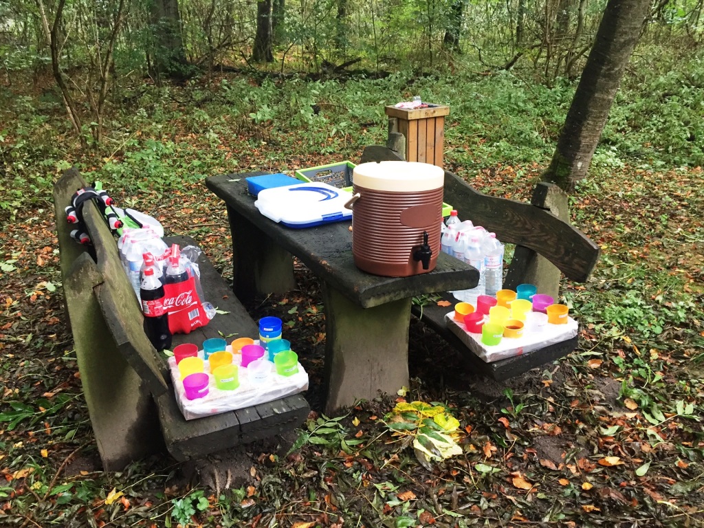 Hut ab für alle Läufer, die diese Höhenmeter an diesem Tag in Angriff nahmen! Aber ich glaube, dass es an der Verpflegung lag. Hier fehlte es an Nichts! Jeder Läufer durfte aus seinem Becher trinken. Es gab warmen Tee und allerlei läufergerechte Verpflegung. Auch Cola, Apfelschorle und Wasser fehlten nicht! Danke, liebe Sylke, auch im Namen aller Läufer, für deine sehr gut bestückte Verpflegung!