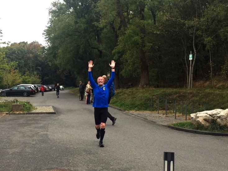 Im Ziel warteten Anne und ich. Es war inzwischen recht frisch geworden. Dann endlich setzte er sich in Bewegung! Mit einer Weberzeit in der Tasche lief er über die Ziellinie.