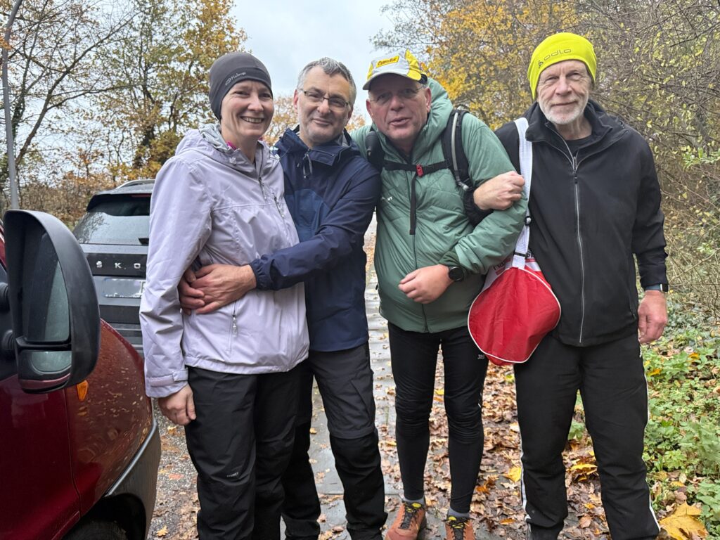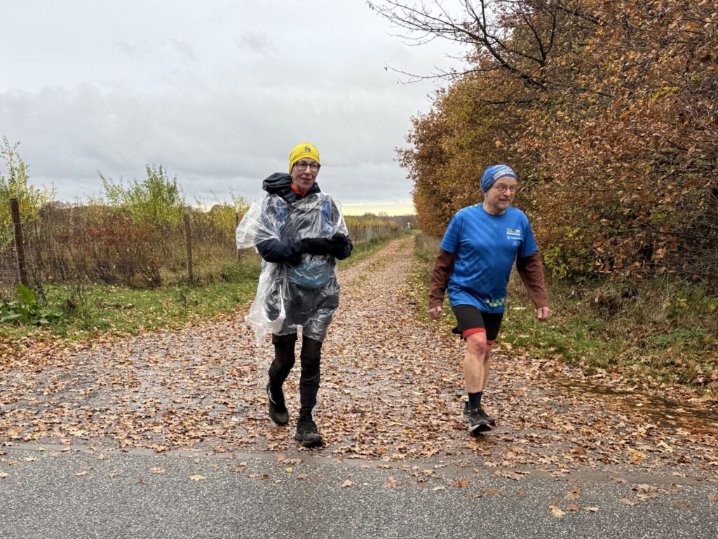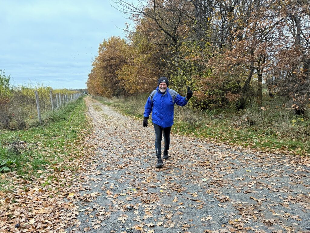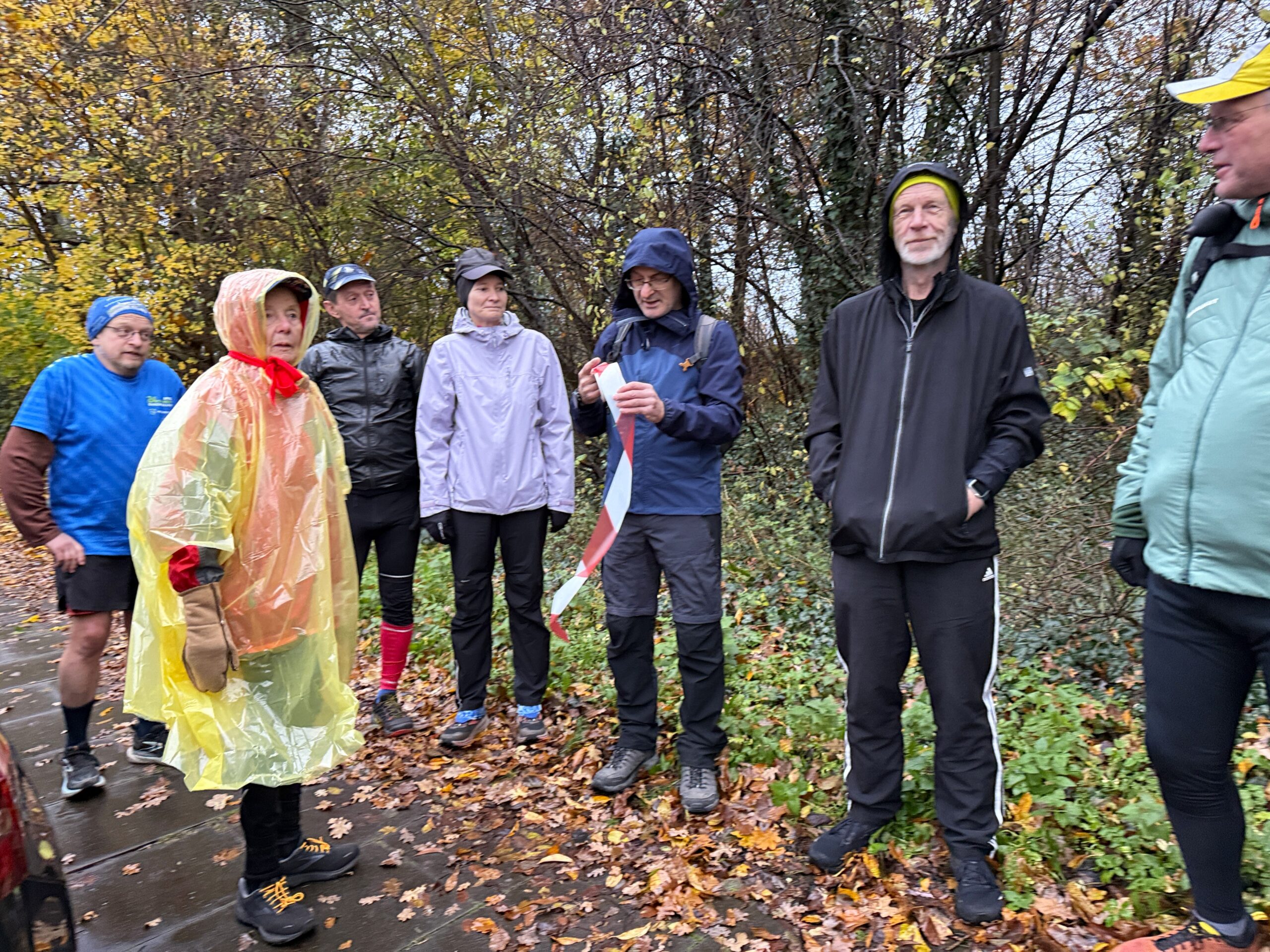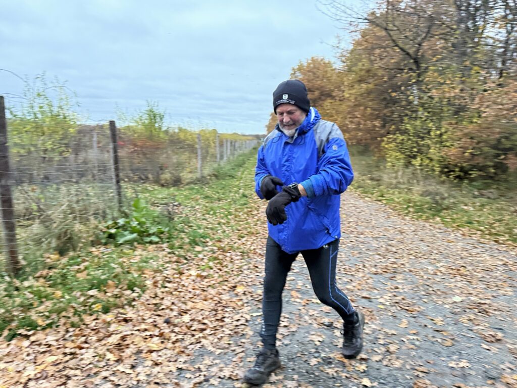 … Didi und …… Cornelia in der Dunkelheit um 07:00 Uhr.Kurz vor 08:00 Uhr begrüßte Affenzahn Sigrid und Hajo, der Sigrid zu dieser Veranstaltung mit dem Auto gebracht hatte.Das Wetter zeigte sich schon beim Briefing durchwachsen. Ein frischer und herbstlicher Tag ohne Sonne sollte die Läufer heute begleiten.Aber die Läufer zeigten sich am Start wetterfest gekleidet und gut gelaunt. Ich traute mich in einer ersten kleinen Regenpause aus dem warmen WoMo für ein Selfie heraus und hoffte, bald einen Läufer auf der mit einigen … … Pfützen „bestückten“ Zieleinlaufstrecke zu fotografieren.Während ich auf ein Fotoobjekt wartete, sprangen mir die bunten Blätter des Rubus (lat. Brombeerstrauch) ins Auge. Ah, da kommt er ja schon! Didi hatte jetzt zwei Runden geschafft und machte einen energischen und entschlossenen Eindruck, wie auch …… Frank, Mukir, …… Cornelia und Bernd. Inka, Burkhard und Affenzahn waren im flotten Marschschritt unterwegs.In der ersten Runde begleitete Stephan Sigrid, weil sie die Strecke nicht kannte. Dann schaltete Stephan den Turboschritt ein und zog davon. Frank und Mukir leiferten sich ein Duell, das Frank gewann und ihn mit einer Sub5 Zeit zum Tagessieger machte. Mukir erreichte den 2. Platz. Glückwunsch!Manche Pflanzen sind sehr robust und freuen sich über einen milden Winter, wie die Westalpen-Schafgarbe.Getränkeverpflegung für verschiedene Insekten und VögelDer Rubus beweist, dass der Herbst die schönste Jahreszeit ist.Die Laufstrecke ist ein Rundkurs von 4,730 Metern je Runde, der neun Mal zu durchlaufen ist und führt durch …… das Naturschutzgebiet Moorgürtel in Hamburg nördlich von Neugraben. – In Naturschutzgebieten sollten die Besucher sich an die „abgebildeten“ Regeln halten.Der Metronom von Stade nach Hamburg hält auch in Neugraben.Blick auf das Ziel – scheint sehr weit weg zu sein !Stephan hat immer ein Herz für die langsameren „Altersläufer“!Das ist die Außenstelle Neugraben der JVA „Santa Fu“, die Inhaftierten wurden schon kurze Zeit später von Inka freigelassen und konnten …… als Elite, geführt von ihrer Retterin Inka, eine neue Runde auf’s Parkett legen. – Im Hintergrund lauerte Affenzahn!Gegen 14:00 Uhr war die Hälfte von Inkas leckerem Kuchen im Magen der Läufer.Didi durfte auch den Kuchen probieren! Die Drittplazierten Inka, Stephan, Affenzahn und Burkhard nach dem gemeinsamen Zieleinlauf – Glückwunsch! – Sigrid, Cornelia und Bernd, der heute einen Ultra lief, sind noch unterwegs, wie auch …… Didi, der … … bald seinen …… 1585. Zähler in die Statistik eintragen konnte. Tolle Leistung, Schatzi! Ich bin stolz auf dich!