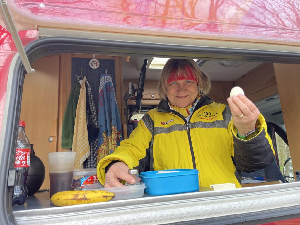 … Vollmond!Gegen 07:00 Uhr hatte ich die Gelegenheit, mit Doris H. und Mario zu klönen, bevor sie sich startbereit machten. Etwa eine Stunde später meldete sich die Sonne und ich beschloss, …… Natureindrücke fotografisch einzufangen. Dabei unterstützte mich die aufgehende Sonne am Horizont.Gute Laune zeigte Doris S., als sie die neue Jägerbrücke tanzend hinter sich lassen konnte.Beate nahm sich energisch eine weitere Runde vor.Die Veranstalter Dieter und Rita freuten sich, Jens-Peter wiederzusehen.Martin Tö. war früh gestartet und auch früh fertig. Doris H. und Mario hatten ein flottes Tempo drauf und sollten die heutigen Tagessieger werden. Glückwunsch!Rabea und Vera wirkten etwas verschlafen, hatten trotzdem gute Laune.LäuferidylleAngela und Claudia waren fröhlich im Gleichschritt unterwegs. Im Hintergrund machte sich Jens-Peter startklar und …… nahm gleich nach dem Start Tempo auf.Gerd kam heute als dritter Läufer ins Ziel. Glückwunsch!Perfekte Laufhaltung von Rosi und CindyDoris H. und Mario hatten die Laufrichtung gewechselt und ließen hier die Alfred-Warnemünde-Brücke hinter sich.Dieter und Rita waren mit dem Wetter mehr als zufrieden.Jens-Peter auf dem Weg zur Alfred-Warnemünde-BrückeEin hartgekochtes Ei liefert hochwertiges Protein (für den Muskelaufbau), ist für den Läufer leicht verdaulich und ein idealer nährstoffreicher Snack.
