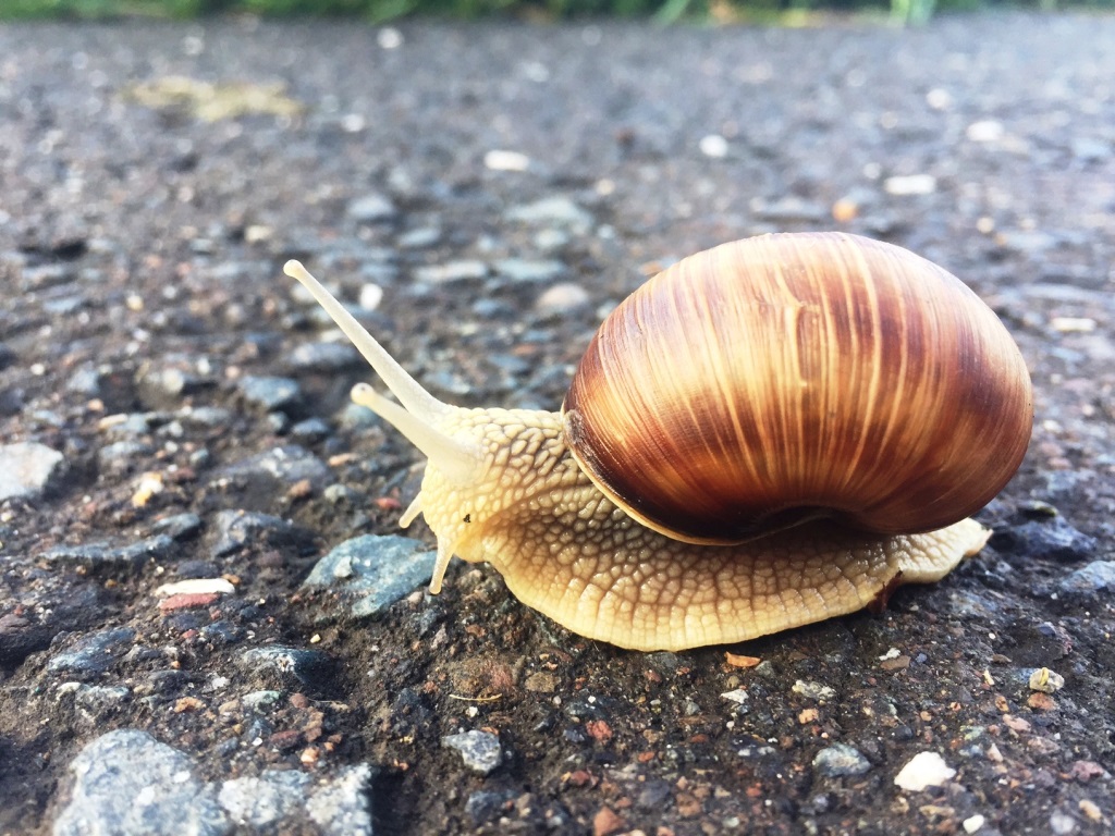 Nicht nur ich schien es heute langsam angehen zu lassen. Auch dieses Prachtexemplar von Weinbergschnecke machte sich ebenfalls langsam auf dem Weg. Die Weinbergschnecke ist eine gehäusetragende Landschnecke. Da ich sie von der Seite fotografiert habe, kann man leider die Augen dieser Schnecke nicht erkennen. Sie befinden sich nämlich am Ende der oberen Fühler.