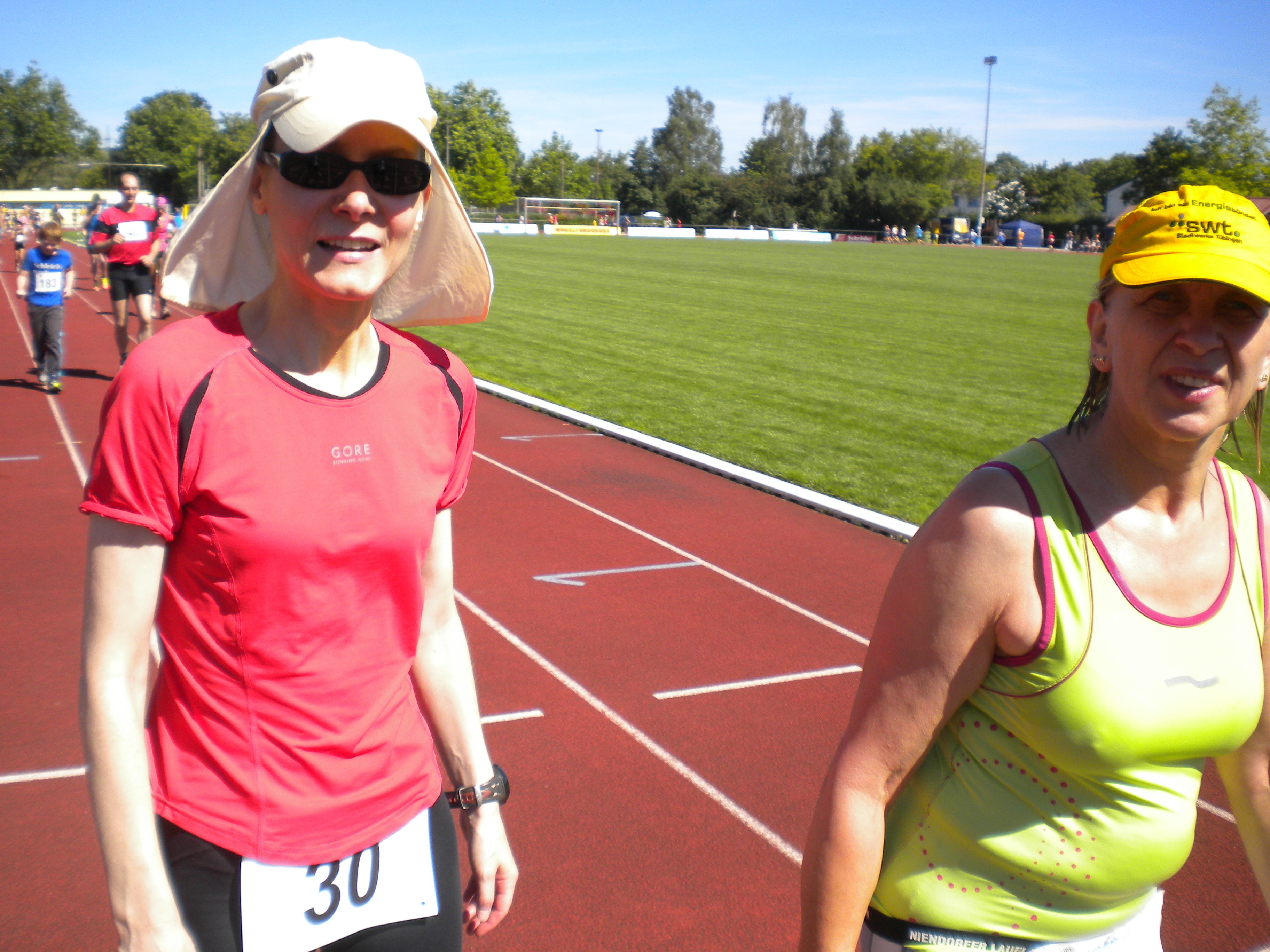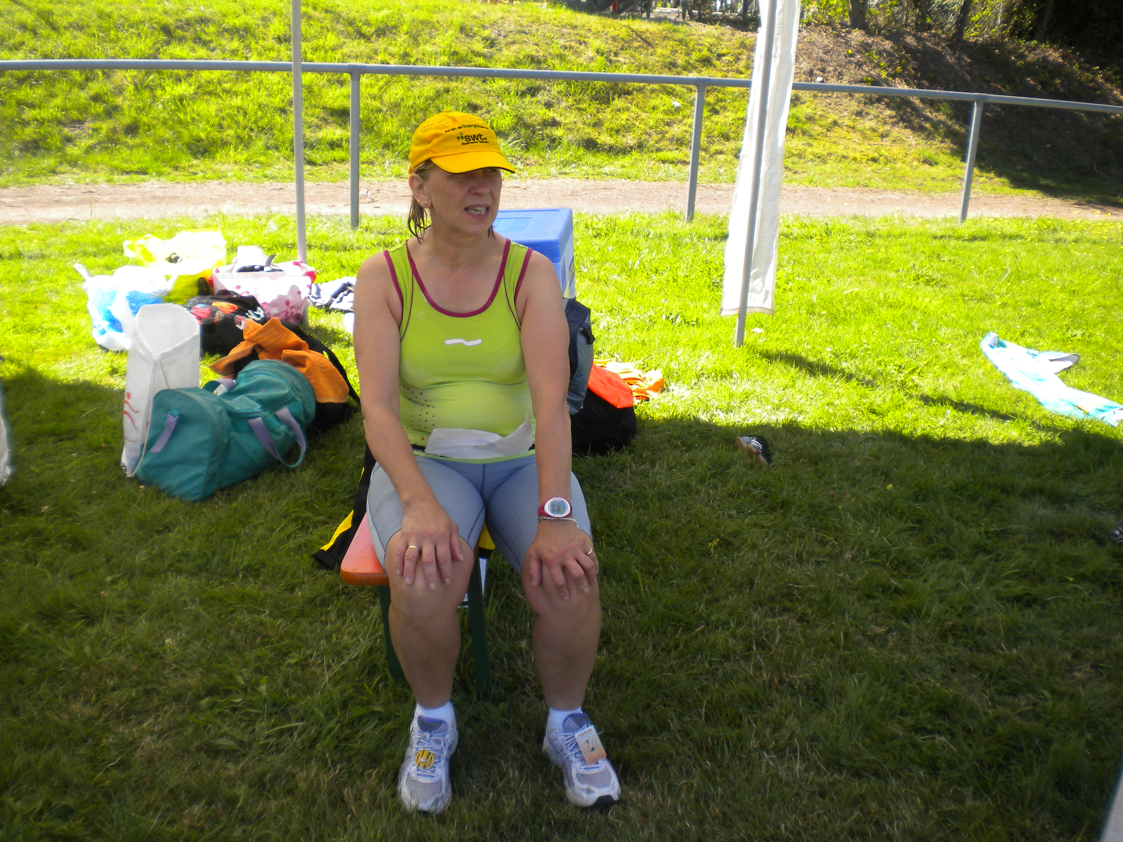 Am nächsten Tag schien die Sonne und es „drohte“ sehr warm zu werden. Wie oft vor einem Lauf bekam ich nicht viel vom Frühstück `runter. Vielleicht war es die Aufregung oder doch die Wärme!? Ich fuhr rechtzeitig zum Start und traf Sylke und Herbert, die ich aus Dettenhausen und vom 24h Lauf am Seilersee kenne. Man hatte sich doch einiges zu erzählen und zeigte sich auch großzügig, als es darum ging, sich gegenseitig Tipps zu geben.