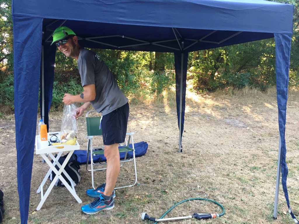 Frank hatte einen super Verpflegungsstand und eine Minidusche. Er freute sich über ein Wiedersehen.