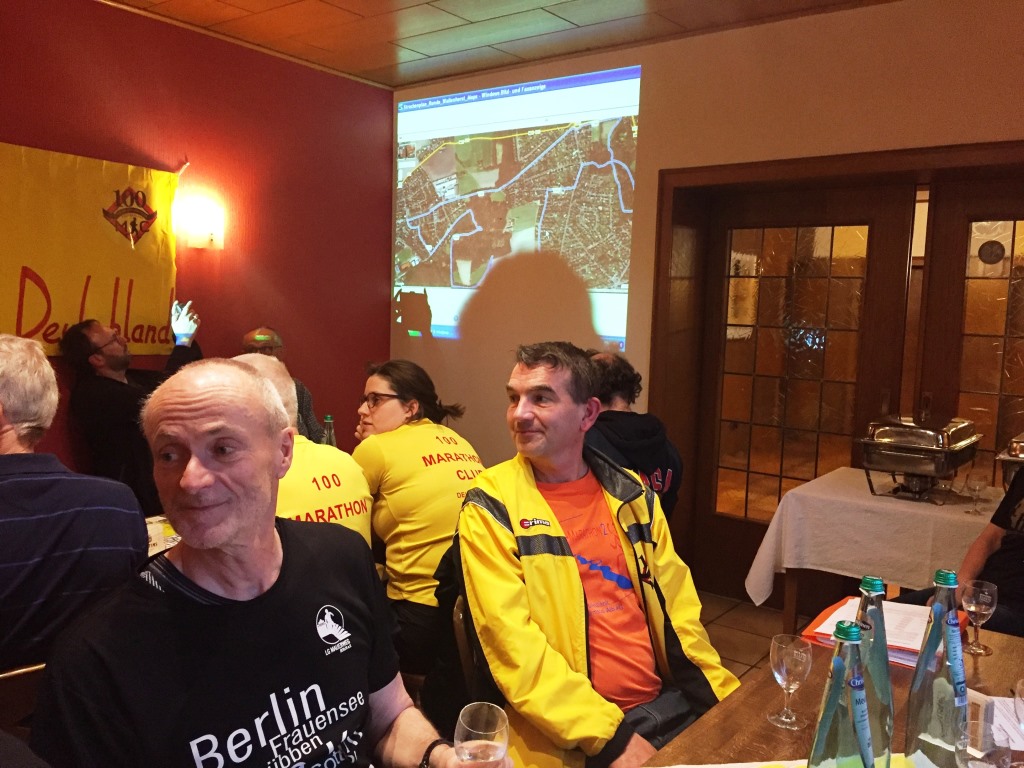 Erst zuhören, dann Strecke angucken oder sich am nächsten Tag überraschen lassen, wie sie verläuft. Ein paar Höhenmeter sollten es werden! Brave Läufer fotografierten die an der Wand gezeigte Strecke ab. Es könnte ja sein, dass man sich verlaufen würde!