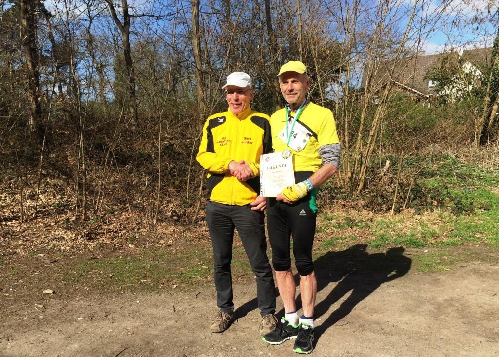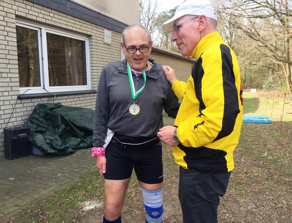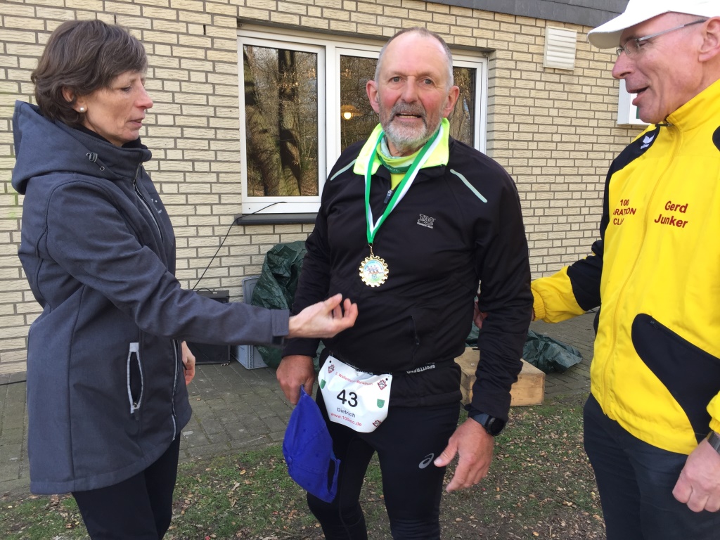 Ach ja, der Didi sollte auch eine Medaille haben! Er lief an diesem Tag seinen 1179. M/U! Gerd gratulierte ihm dazu im Ziel. Anette achtete darauf, dass die Medaille richtig hing.