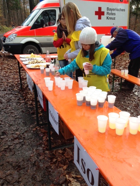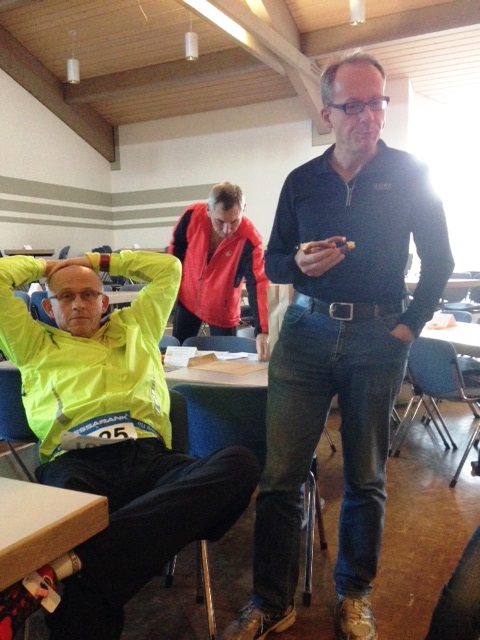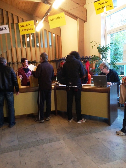 Am nächsten Morgen machte ich mich auf den Weg, um rechtzeitig vor dem Frühstart um 9.00 Uhr, meine Startunterlagen im Rudolf-Winkler-Haus zu holen. Die Startnummer 1179 befestigte ich auf meinen Startnummerngurt und erkundigte mich, wie ich zum Start im Wald kommen sollte. Es gibt wirklich nette und hilfsbereite Menschen in Zeil. Der Kleinbusfahrer Heinz bot sich dann an, mich zu fahren. Danke, Heinz! Bevor Heinz und ich losfuhren, warf ich einen Blick in die Halle. Dort traf ich Keule und KP. Sie wirkten beide etwas lustlos. Mag ja am Wetter gelegen haben?!