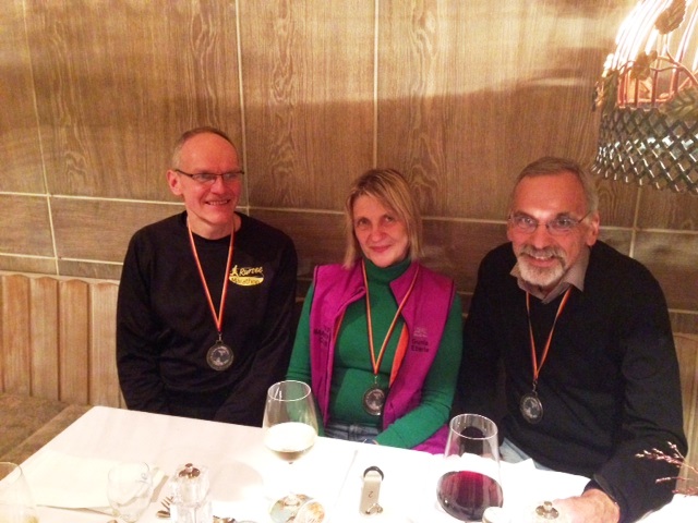 Plötzlich klopfte es an meiner Hotelzimmertür. Draußen stand nicht der Weihnachtsmann! Christoph, Heike und Dieter (LT Hemsbach), die im gleichen Hotel untergebracht waren, standen vor der Tür, um mir meinen Preis für den Altersklassensieg W60 zu bringen! Ich hatte damit nicht gerechnet!