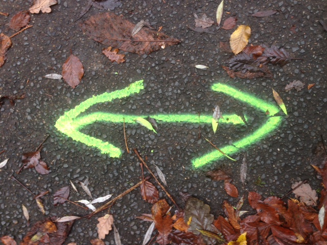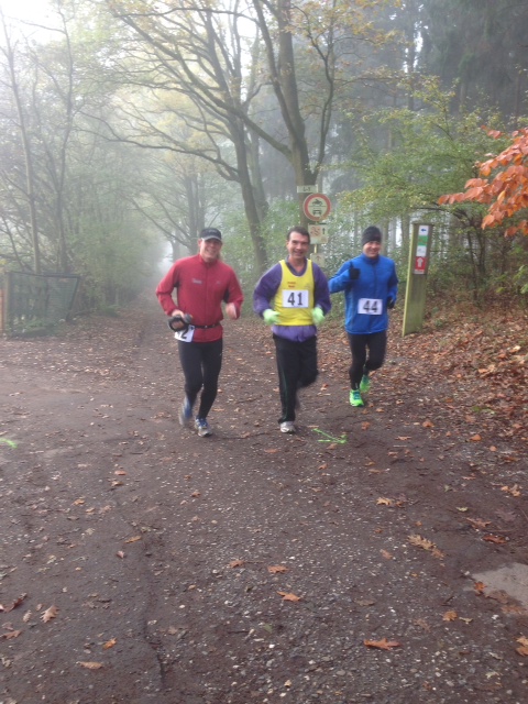 Wir starteten relativ pünktlich. Die Pfeile der Strecke hatten einen frischen Anstrich bekommen. Aber, wo war die Sonne? Es war fast ein wenig unheimlich im Wald! Aber, da tauchten plötzlich drei Läufer auf! Gott sei Dank, das waren bekannte Gesichter. Von links nach rechts: Peer, Christoph und Florian liefen im Gleichschritt eine der vielen Steigungen hoch. Ich hatte diese Steigung noch vor mir!