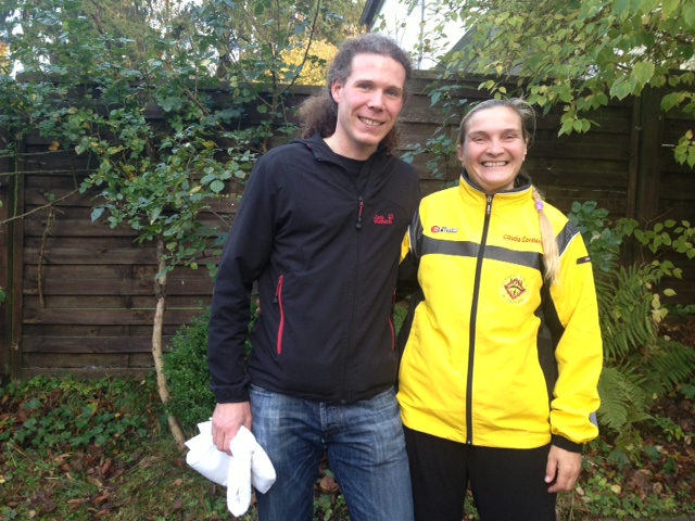 Am nächsten Morgen sah das Wetter nicht sehr vielversprechend aus. Als ich aus dem Fenster des Hotels schaute, überfiel mich eine Unlust. Es herrschte ein starker Nebel. Ich hatte nicht wirklich Lust zu laufen! Claudia begrüßte mich jedoch fröhlich, als ich bei ihr ankam und aus dem Auto stieg. Ihre gute Laune färbte ab und ich freute mich doch ein bisschen auf das Laufen. Es war auch schön, Manuel, Tiago und Oma wiederzusehen. Danke Oma, dass du dich so für die Verpflegung der Läufer einsetzt! Bald traf der erste männliche Läufer ein. Florian erzählte Claudia und mir über seine weiteren läuferischen Pläne in diesem Jahr. Bald darauf erschien Peer. Beide Männer freuten sich, an diesem Tag laufen zu können. Rita, die in Portugal beruflich zu tun hatte und auf Stippvisite in Deutschland war, versuchte trotz „Jettläck“ zu laufen. Die Lauftruppe war fast perfekt. Es fehlte nur Christoph Wenzel aus unserem Club.