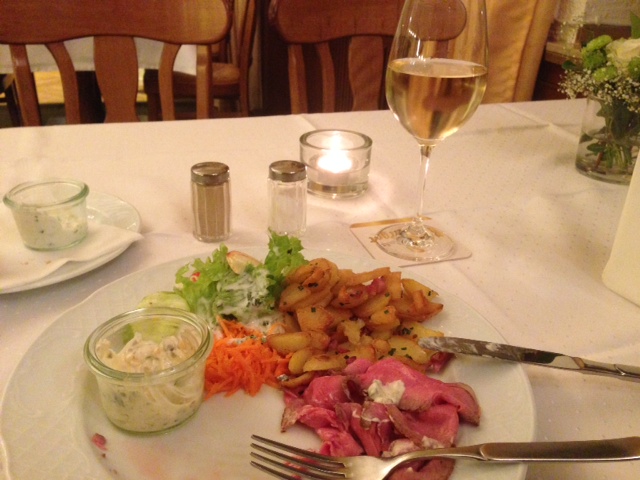 Die Anreise fand am Freitag, 15.11.2013 nach der Schule statt. Diesmal fuhr ich über Bremen. Das war zwar nicht kürzer aber schneller, da auf dieser Strecke das Navi keine Staus anzeigte. Gegen 20.00 Uhr kam ich in Viersen an. Ganz in Ruhe konnte ich zu Abend essen. Ich hatte mir Roastbeef mit Bratkartoffeln ausgesucht. Das war sehr lecker.