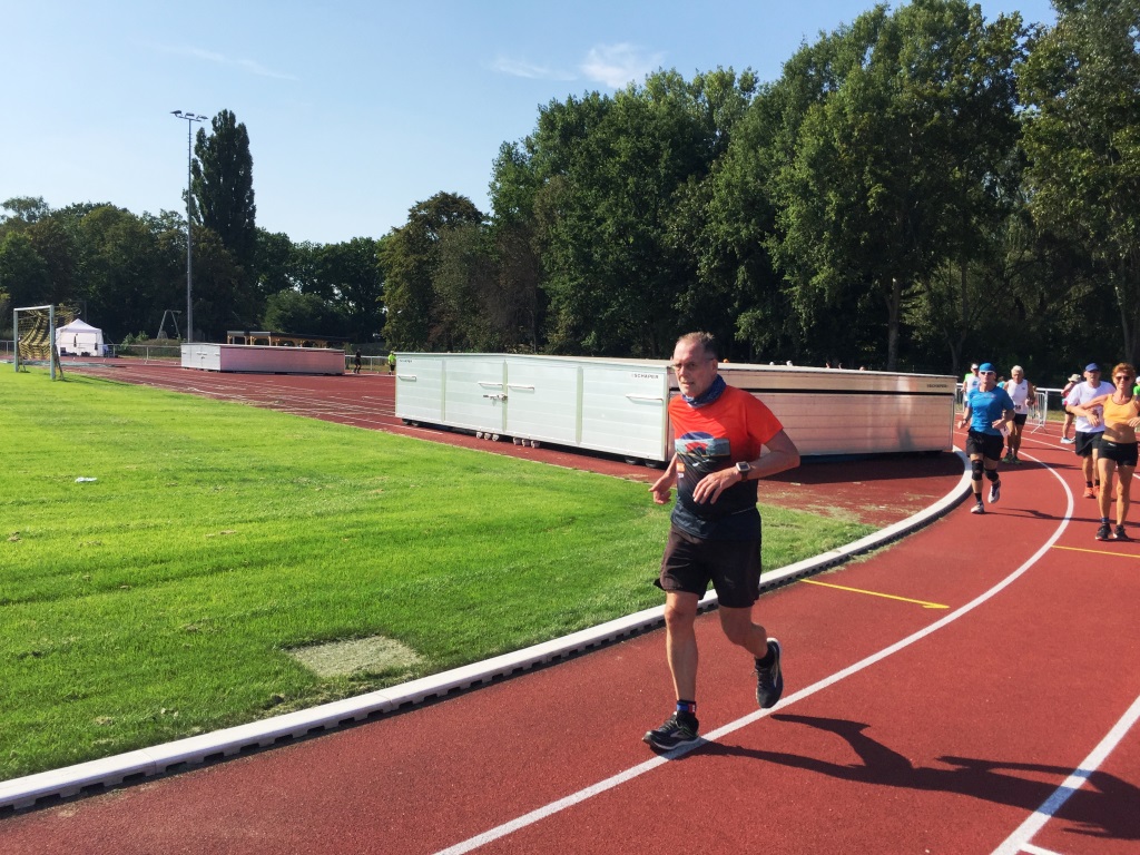 Dann setzt sich das Läuferfeld langsam in Bewegung. Die Nachmittagssonne heizte die Stimmung auf. Schon in der ersten Runde meldete sich mein Kreislauf „zu Wort“. Die Sonne meinte es ja nur gut mit mir, …