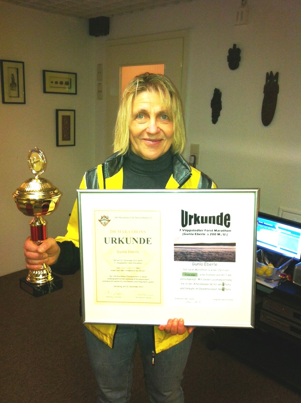 Am nächsten Morgen spürte ich eine leichte Erkältung, die ich allerdings ignorierte. Ich musste(!) heute am 22.12.2013 laufen! Der Pokal wartete und die Urkunde meines Clubs war angekommen. Ich konnte doch jetzt nicht kneifen, oder? Vor allem, weil mein Schatz extra meinetwegen gekommen war!