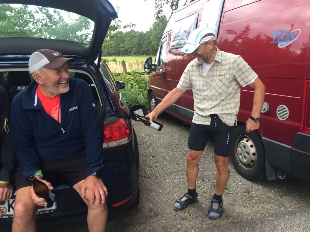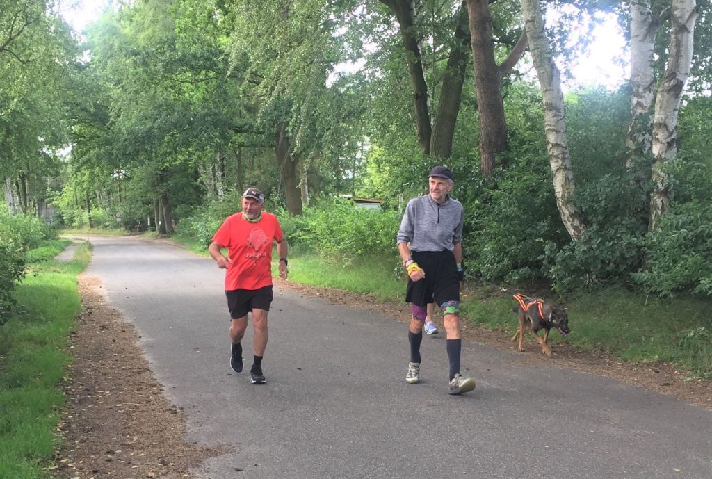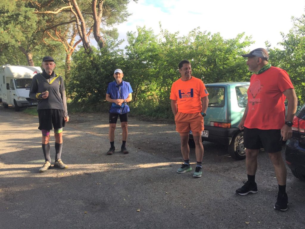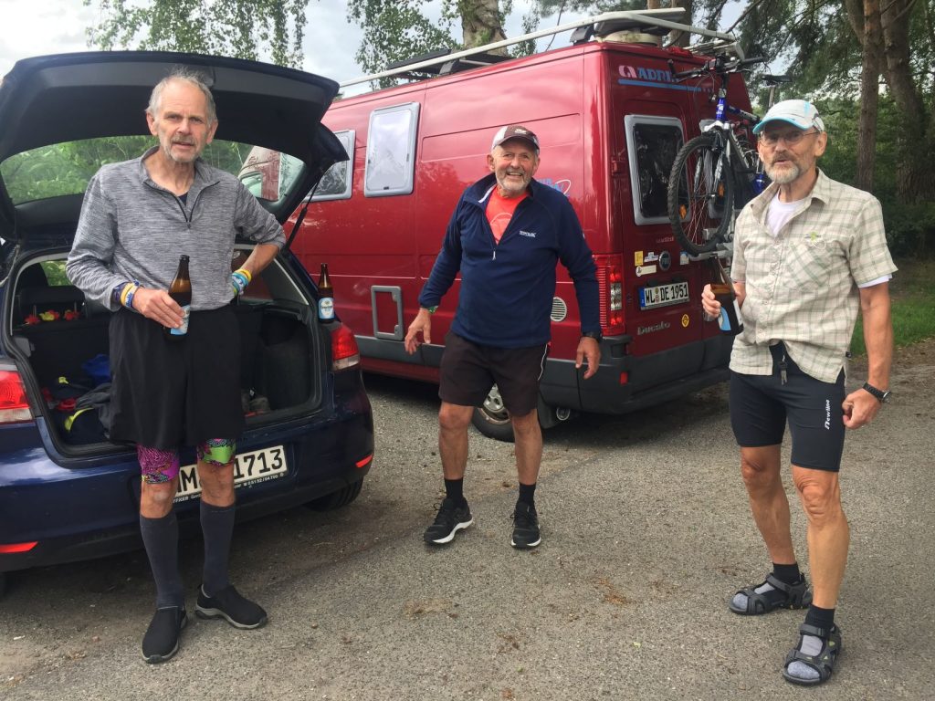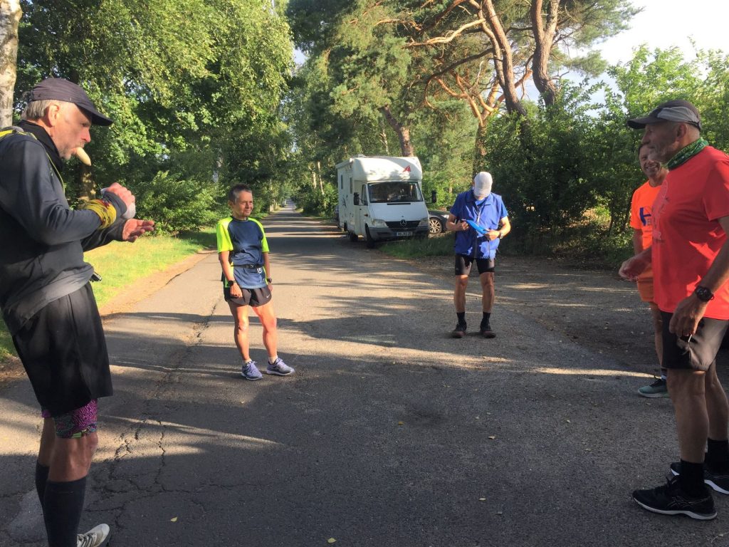 Kurz nach 6.00 Uhr am 29.07.2020 fuhr Didi auf seinem Fahrrad los, um die Strecke der „kurzen Runde“ zu markieren. Helmut schlummerte noch in seinem weißen WoMo. Das Briefing sollte ja erst um 7.45 Uhr stattfinden.Diese etwas auseinandergeratene Steinschlange …… freute sich, Didi wenigstens am Anfang der Strecke bei der Markierung behilflich zu sein.Die „Gelbe Schafgarbe“ sucht sich überall einen, wie sie meint, eigenen Platz, wo sie sich wohlfühlen kann. Die Heimat dieser Staude liegt im Orient und Kaukasus. Wer als Hobbygärtner eine bienenfreundliche Staude für seinen Garten sucht, ist bei der „Goldgarbe“ genau richtig. Ein vorbeirauschender Güterzug rüttelte mich wach und machte mich darauf aufmerksam, …… wie schön es im Buchwedel ist. Der Klatschmohn und die Kornblumen wirkten beruhigend auf mich. Ich musste einfach …… stehenbleiben und genießen.Ein Blick zum Himmel – heute sollte bestes Laufwetter herrschen!Didi kam schnell von seiner Runde wieder. Eine ausreichend markierte Strecke gehört zu einer gut organisierten Laufveranstaltung. Auch wenn eine Marathonstrecke in einem Wald bekannt ist, verlaufen kann man sich trotzdem. Etwas Zeit blieb noch bis zum Briefing der heutigen Jubiläumsveranstaltung. Es war noch recht frisch draußen und ich beschloss, …… mir im WoMo einen Becher heißen Früchtetee zu gönnen.Dann traute sich endlich die Sonne aus ihrem Versteck und …… begrüßte mit Didi die ersten Teilnehmer. Werner und Martin (als Banana Joe) scherzten mit Didi, der sich bereitmachte ……, um das Briefing durchzuführen. Bald waren auch Rosi und Helmut dazugestoßen und hörten „aufmerksam“ zu. Inzwischen hatte Werner …… seine Banane fast aufgegessen und stand bereit zu starten.„Rosi, bist du soweit?“ Didi drehte sich ein letztes Mal um. Die Sonne hielt den Atem an, denn …… nun sollte es endlich losgehen. Die Teilnehmer stellten ihre Uhren ein …… und langsam setzte sich das Läuferfeld in Bewegung. Helmut wollte zunächst auf Rosi warten, lief dann aber doch los. Rosi und Cindy starteten etwas verspätet.Martin war fröhlich unterwegs und sollte seine Poleposition vom Start bis ins Ziel behalten. Helmut war heute auch leichtfüßig unterwegs.Hier freut sich einer! Manche behaupten, Marathon zu laufen macht Spaß! Cindy scheuchte Didi und Werner, wann auch immer sie Gelegenheit hatte.„Du Frauchen, wir könnten sie noch einholen!“ – „Nein, Cindy! Lass´ sie ruhig laufen! Uns hetzt doch keiner.“ Rosi freute sich mit ihrer Cindy über das heutige angenehme Laufwetter. Beide wirkten entspannt und locker.Helmut lief entschlossen und kraftvoll, …… während diese beiden Herren die ganze Sache etwas lockerer zu nehmen schienen.So sieht ein Sieger aus! Gratuliere, Martin! Nach 05:24:46 bist du immer noch „fit wie ein Turnschuh“!Nach 05:47:45 lief Helmut über die Ziellinie. Gratuliere, Helmut! In seinem WoMo konnte Helmut anschließend sich frisch machen.Didi und Rosi posierten vorbildlich für dieses Streckenfoto, während Werner in Gedanken versunken überlegte, wie der Zieleinlauf aussehen sollte.Auf der langen Geraden liefen Cindy und Werner im Gleichschritt. Rosi schien mit dieser Leistung der beiden Freunde sehr zufrieden zu sein!Cindy erreichte die Zielgrade vor Rosi, Didi und Werner! Aber Rosi konnte Cindy mit Hilfe der Leine bremsen und …… für einen nahezu perfekten Zieleinlauf in 07:05:12 sorgen. Somit waren alle Teilnehmer Sieger ihrer Altersklasse. Der Veranstalter …… und einige seiner Mitstreiter gönnten sich nach dem Lauf ein von Helmut gespendetes alkoholfreies Bier. Danke, Helmut!Ganz entspannt und zufrieden über ihre Laufleistung genossen Werner und Didi ihr Bier.