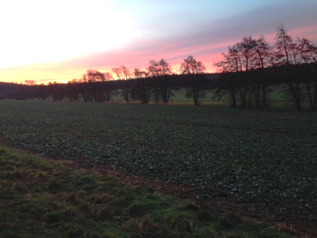 Da ich unbedingt eine Art Motivationsschub bei dem momentanen Schulstress brauchte, bekam ich durch Didi eine Gelegenheit, einen Marathon „anders“ zu laufen. Mit einem Hahn kann ich also selbst meine Laufzeit bestimmen! Toll, nicht wahr? Dieser Gedanke war mir sehr wichtig, als ich am Freitag, 17.01.2014 nach Salzgitter-Bad fuhr, um im Hotel Quellenhof zu übernachten. Ich wollte am nächsten Tag ausgeruht den Marathon um 8.00 Uhr starten. Am Frühstückstisch verinnerlichte ich Didis Hahnzeitliste und entschied mich für eine langsame Hahnzeit, in der Hoffnung, irgendwann schneller zu werden. An diesem Samstag hatten meine Mitläufer Heiner, Brigitte, Frank, Andrè, und ich das Wetter auf unserer Seite. Es herrschte kein Wind, es war auch nicht kalt und wir erlebten schon am Start einen wunderschönen Sonnenaufgang. Es sollte tatsächlich ein schöner Lauftag werden!