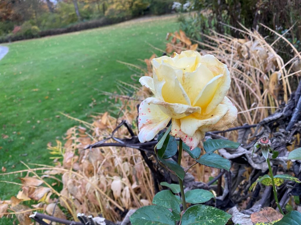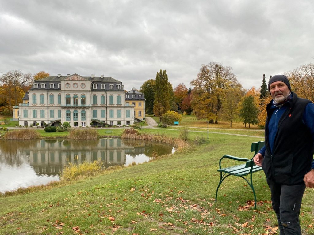 Bernd begrüßte uns am Vortag auf dem Parkplatz am Schloss Wilhelmsthal. Da wir einige Kilometer im Auto gesessen hatten, …… schlug Didi vor, die Laufstrecke abzugehen. Tja, so konnte ich dann wenigstens eine von 8 Runden à 5,05km mit den „unerheblichen“ paar Höhenmetern absolvieren. Das heutige Schloss Wilhelmsthal steht in der Nähe von Kassel bei Calden und wurde von 1743 bis 1761 erbaut. Das Schloss ist eine locker gefügte Dreiflügelanlage und zählt zu den bedeutendsten Rokokoschlössern nördlich des Mains. Didi zeigte auf das Schloss und erklärte mir, dass es auch als Kulisse bei Dreharbeiten gedient hatte.Zum Schloss Wilhelmsthal gehört ein großflächiger Park. Die Strecke des Marathonlaufes verläuft durch den Park und garantiert …… eine Gratisbesichtigung von allen Sehenswürdigkeiten des Parks. Zum Schloss gehören auch diese beiden vorgelagerten Wachhäuser.Nun wurde es „ernst“. Wir befanden uns jetzt schon auf der Marathonstrecke. Nach einer kleinen Rechtskurve und vorbei am rechten Flügel des Schlosses … … ging es weiter in den wunderschön angelegten Park. Vor lauter Bewunderung durfte man das Laufen nicht vergessen.Im Gegensatz zu den üblichen Landschaftsanordnungen liegt das Schloss an der tiefsten Stelle des Parks. Im Park zeichnete sich schon bald … … ein kurzer Anstieg ab. Pro Runde hieß es 50m. Ansonsten musste man nur „kleine Wellen“ bewältigen.Auch wenn die Sonne Läufern und heute uns Spaziergängern den Rücken kehrte, zeigte sich die Natur in ihrer bunten Herbstkleidung und machte auf mich einen Eindruck der farblichen Unabhängigkeit.Auch Didi war beeindruckt und blieb stehen, um die bunte und abwechslungsreichen Farbpracht des Parks einzuatmen.Um 1800 wurde der Park …… zu einem Landschaftspark …… mit lockerer Bewaldung weiterentwickelt.Wäre ich die Strecke mit Didi nicht abgegangen, dann hätte ich nicht diesen Teich als landschaftlichen „Hotspot“ der Umgebung des Schlosses Wilhelmsthal entdeckt. Ein weiterer Hotspot, der mich beieindruckte, war diese …… Brücke. Spätestens hier musste ich meiner Fantasie freien Lauf lassen … … und historische Vermutungen aufstellen, wann und wozu die verschiedenen „Hotspots“ geschaffen oder gebaut wurden. Manche Objekte oder Erscheinungen sollte man einfach nur bewundern.Bei dieser Kulisse musste ich stehenbleiben und tief Luft holen. Ich hatte ein bisschen das Gefühl, von diesem Wartturm aus beobachtet zu werden. Hatte man mich etwa entdeckt? – Warttürme wurden in spätmittelalterlicher Zeit gebaut, um rechtzeitig vor dem Heranrücken feindlicher Truppen zu warnen. Aha, war ich doch gesichtet worden?Das heutige Wilhelmsthaler Schloss …… wurde als Lustschloss für den hessischen Landgrafen Wilhelm VIII von 1743 bis 1761 gebaut. Nein, das ist nicht der Graf Wilhelm! Aber Didi macht doch als Graf eine gute Figur, oder?Sicherlich ist die botanische Vielfalt im Schlosspark des Schlosses im Sommer beeindruckender. Die doch sehr hübsche Rose verabschiedete sich von uns und bedankte sich für unseren Besuch.Es fand ein Rahmenstart von 8.00 bis 10.00 Uhr statt. Didi wollte früh starten und zeigte mir die Laufrichtung der Runden an. Jeder Läufer hatte dann die Möglichkeit, …… zu seinem Auto zu laufen und sich …… von seiner Eigenverpflegung zu bedienen. Didi wurde …… an der Laufstrecke erstklassig …… von mir betreut. Mit dem Hahn-Weber-Zettel in der Hand kam Didi nach 07:27:02 glücklich ins Ziel! Gratuliere!