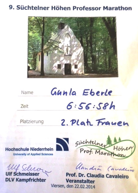 Claudia hatte wieder zum Trainingslauf für ihren Jubiläumsmarathon (150. M/U!), der am 22.03.2014 stattfinden soll, aufgerufen! Am 21.02.2014 fuhren Dietrich und ich wieder nach Süchteln, um den 9. Süchtelner Höhen Prof. Marathon zu bestreiten. Im Hotel „Zur eisernen Hand“ hatten wir ein Zimmer gebucht, damit wir am nächsten Tag ausgeschlafen zum Start erscheinen.