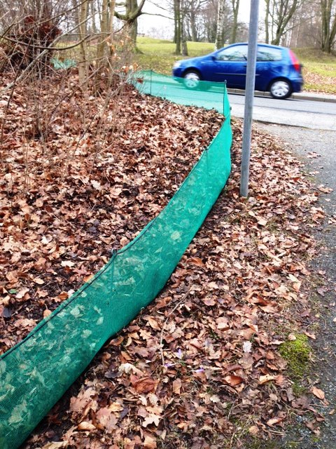 In den Gärten war der Frühjahrsputz schon erledigt. Auch der Krötenschutzzaun war schon aufgestellt. Im Auffangeimer befand sich ein Stöckchen. Wozu war das Stöckchen gut? Entweder sollten die Kröten in den Eimer fallen oder aus dem Eimer selbst hinaufklettern. Ich glaube eher, sie sollten in den Eimer fallen und von den „Krötensammlern“ ´rausgeholt werden!