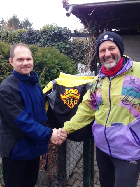 Es sollte ein sehr schöner Lauftag werden. Als wir gegen 7:30 Uhr ankamen, empfing uns ein fröhlicher Marc. Tja, so sieht eben ein 100 MC – Mitglied aus! Der Gratulant und Marc strahlten beim Gratulieren um die Wette!