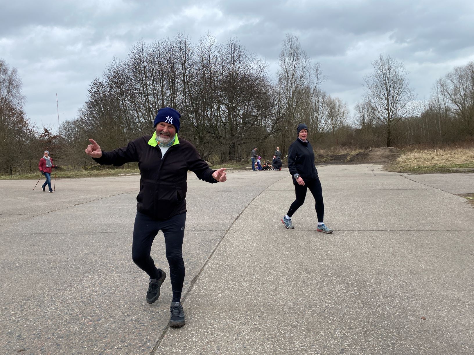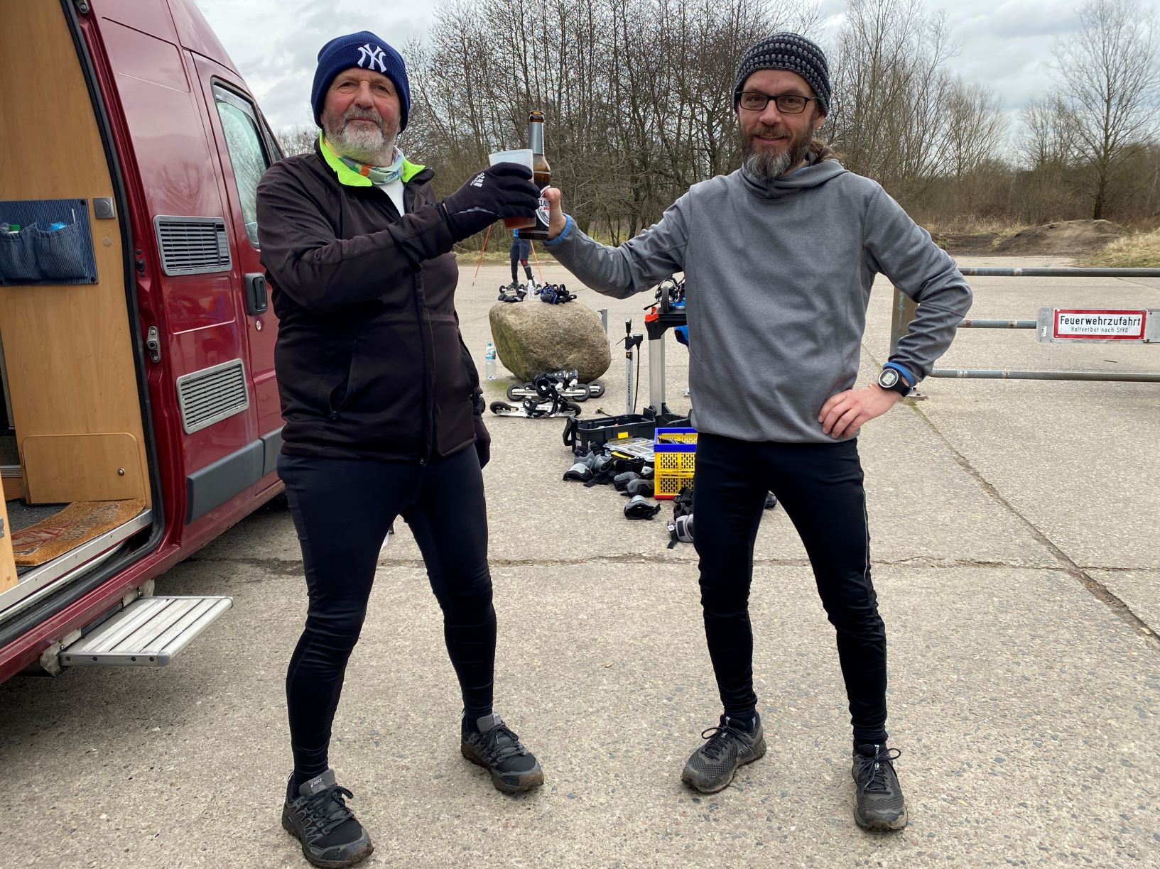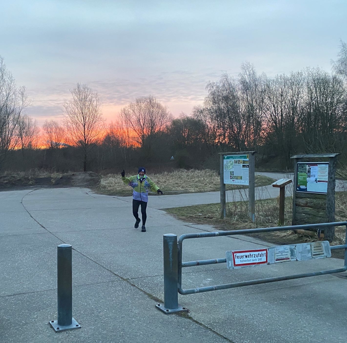 Der Höltigbaum war bis 1992 ein Standortübungsplatz der Bundeswehr. Heute ist Höltigbaum ein großes Naturschutzgebiet und nach der europäischen Fauna-Flora-Habitat-Richtlinie geschützt. Im Startbereich bekommt man auf dieser Infotafel wichtige Informationen zur Enstehungs- und Nutzungsgeschichte des heutigen Höltigbaum. Das WoMo hatte Didi in bestmöglicher Parkposition geparkt, damit er seine schon aufgebaute Verpflegung von mir zugereicht bekommen konnte. Da kam er auch schon in Begleitung eines wunderschönen Sonnenaufgangs. Nachdem Didi sich gestärkt hatte, begab ich mich auf die Suche nach Fotoobjekten. Ich schaue zur Seite und entdecke eine fast unberührte Natur. Die Landschaft wirkte etwas unheimlich. Auf der Weide stehen Büsche und warten darauf, von Vögeln belagert zu werden. Die Steine im Vordergrund könnten optimale Verstecke für Schlangen oder Mäuse sein. Die 3,562 km lange Runde (auf dem Foto in rot gekennzeichnet) musste für den Individualmarathon12 x gelaufen werden.Die Idee zu diesem Individualmarathon hatte Dieter, der heute auch „mitmischen“ wollte! Eine der Hauptpersonen an diesem Tag war Mario, der seinen 750. M/U laufen wollte. Doris wollte ihr Marathonkontingent aufstocken und war ebenfalls startbereit für einen weiteren Zähler.Michael wollte mit dem, wie er meinte, streckenkundigen Martin zusammenlaufen. Inzwischen trudelte …… Affenzahn ein und wünschte mir einen „Guten Morgen“!Monika machte sich startklar, konnte aber Michael nicht überzeugen, mit ihr zu starten. Der „Ich warte auf Martin“ – Blick bei Michael war nicht zu übersehen.„Komm, Affenzahn! Dann starten wir beide zusammen!“ Den Abstand hielten die beiden sportlich Aktiven brav ein!Die Wartezeit, bis Martin eintrudelte, nutzte Michael, indem er die coronakonform eingepackte „Dankeschön-Schokolade“ dem Dieter mit dem vorgeschriebenen Abstand übergab.Na, endlich! Martin war gekommen! Aber die beiden sportlich Akiven hatten ein Problem: Keiner von ihnen kannte die Strecke! Was nun? Tja, sie hatten heute das Glück auf ihrer Seite, denn …… die beiden streckenkundigen Aktiven, Mario und Christian, konnten da helfen. Gemeinsam und natürlich mit Abstand liefen alle vier los.Die Sonne ließ an diesem Tag auf sich warten, meine gute Laune jedoch nicht. Diese biotopisch wirkende Fläche schien auch auf die Sonne zu warten, um …… BesucherInnen die im Sommer üppige Vegetation zeigen zu können. Glockenblumenarten besiedeln verschiedenste Standorte, wie z.B. auf Wiesen, an Wald- und Wegrändern. Sie sind meistens ausdauernde, krautige Pflanzen. Nur wenige Arten sind ein- oder zweijährig. Das Bergsandglöckchen hat mehrere Namen: Bergsandrapunzel, Sandknöpfchen, Bergnelke und Schafskabiose. Um auf diese seltene Art und ihren gefährdeten Lebensraum aufmerksam zu machen, wurde das Bergsandglöckchen 1990 zur Blume des Jahres auserkoren. Halboffene Landschaft ist ein Leitbild und ein darauf abgestimmtes Pflegekonzept im Naturschutz und der Landschaftspflege. Halboffene Weidelandschaften zeichnen sich aus durch beweidetes Grasland, in das Gehölze (Bäume und Büsche) locker eingestreut sind. Der Kammmolch hat auf dem Rücken einen hohen, tief gezackten Rückenkamm. So kam er zu seinen Namen. Der Kammmolch fühlt sich in vielen Lebbensräumen zu Hause, darunter halboffenes Tief- bzw. Hügelland und Grün- und Ackerflächen. Der Name „Neuntöter“ bezieht sich auf den irrigen Glauben, dieser hübsche Vogel würde erst neun Beutetiere aufspießen, bevor er sie verspeist.So, jetzt kommen wir wieder zum Sport! Für die Skilangläufer suchte man ein geeignetes Sommertraining. An verschiedenen Orten begann man mit Ski auf Rädern zu experimentieren. Der erste Rollski wurde 1924 in Berlin gesichtet. Es handelte sich um einen umgebauten Kinderroller. Eigentlich soll Rollskilaufen gesund sein und eignet sich angeblich für alle, unabhängig von Alter, Größe oder Gewicht. Das Paar schien heute das erste Mal den Versuch zu starten, Rollskilaufen zu lernen. Aus meiner Sicht sollten sie lieber eine andere Sportart probieren, bei der es nicht unbedingt auf das Gleichgewicht ankommt.Die Sonne ließ sich endlich blicken und ich strahlte mit ihr um die Wette. Es war trotzdem frisch, sodass ich lieber das Stirnband anbehielt. Aber …… der Mario trotzte der frischen Brise. Für ihn war seine Laufzeit wichtiger, als an eine Kopfbedeckung zu denken.Michael behielt seine Mütze auf und raste in eine seiner letzten Runden. Dabei achtete er genauestens auf den Abstand zu den übrigen Besuchern in dem Naturschutzgebiet. Hier kann jeder sehen, dass der Frühling nicht weit weg ist. Die Knospen zeigen Geduld und warten auf dauerhaftes und wärmeres Wetter. Wen haben wir denn hier? Plötzlich tauchte der inzwischen streckenkundige Martin auf. Wir freuten uns auf diese Begegnung, hatten wir uns doch so lange nicht gesehen.Der Veranstalter Dieter und Affenzahn waren flotten Schrittes unterwegs.Auch dem Karsten schien der Individualmarathon im Naturschutzgebeit Höltigbaum zu gefallen. Michael und Monika hielten brav den vorgeschriebenen Abstand ein. Sie waren fröhlich und leichtfüßig unterwegs. Ihr Outfit schienen sie farblich abgesprochen zu haben. Rosi und Cindy nutzen ebenfalls das Naturschutzgebiet für einen gemeinsamen Indiviualmarathon. Da sie aus einem Haushalt kommen, musste nicht auf den Abstand geachtet werden.Doris und Monika wollten eine Bestellung aufgeben. Nachdem ich ihnen klargemacht hatte, dass es sich um einen private Verpflegung handelte, nahmen sie es mit Humor und lachten herzhaft. Scherz muss sein! Mario war fertig und konnte aufatmen. Gratuliere zu deinem 750. M/U, lieber Mario!Hier konnte ich den Zieleinlauf vom Christian fotografisch festhalten. Im Hintergrund begeben sich Rosi und Cindy in deren letzten Runde.Tja, der Didi war noch nicht fertig, ließ es sich aber nicht nehmen, den teilnehmenden Läufern ein alkoholfreies Clauthaler Bier auf seinem 70. Geb